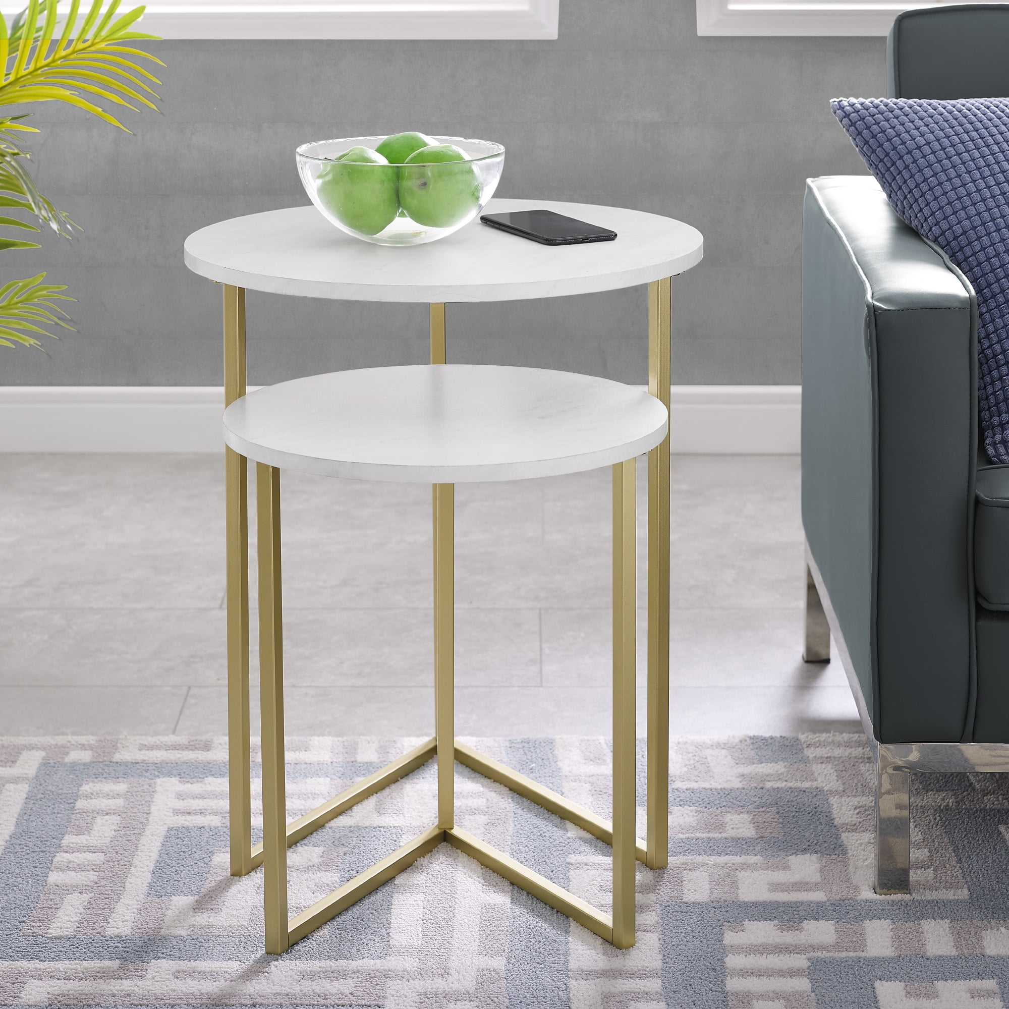 Walker Edison 2-Piece Round Nesting End Table, White Faux Marble/Gold