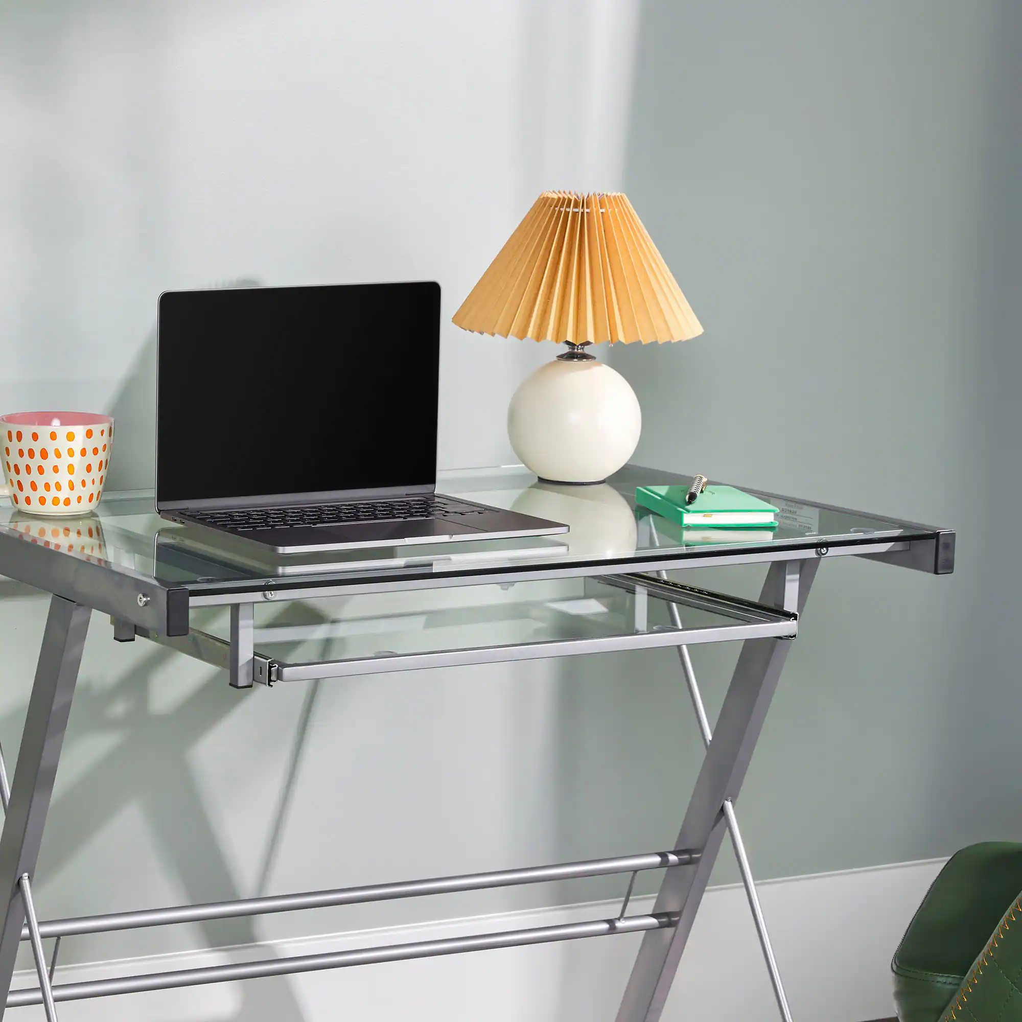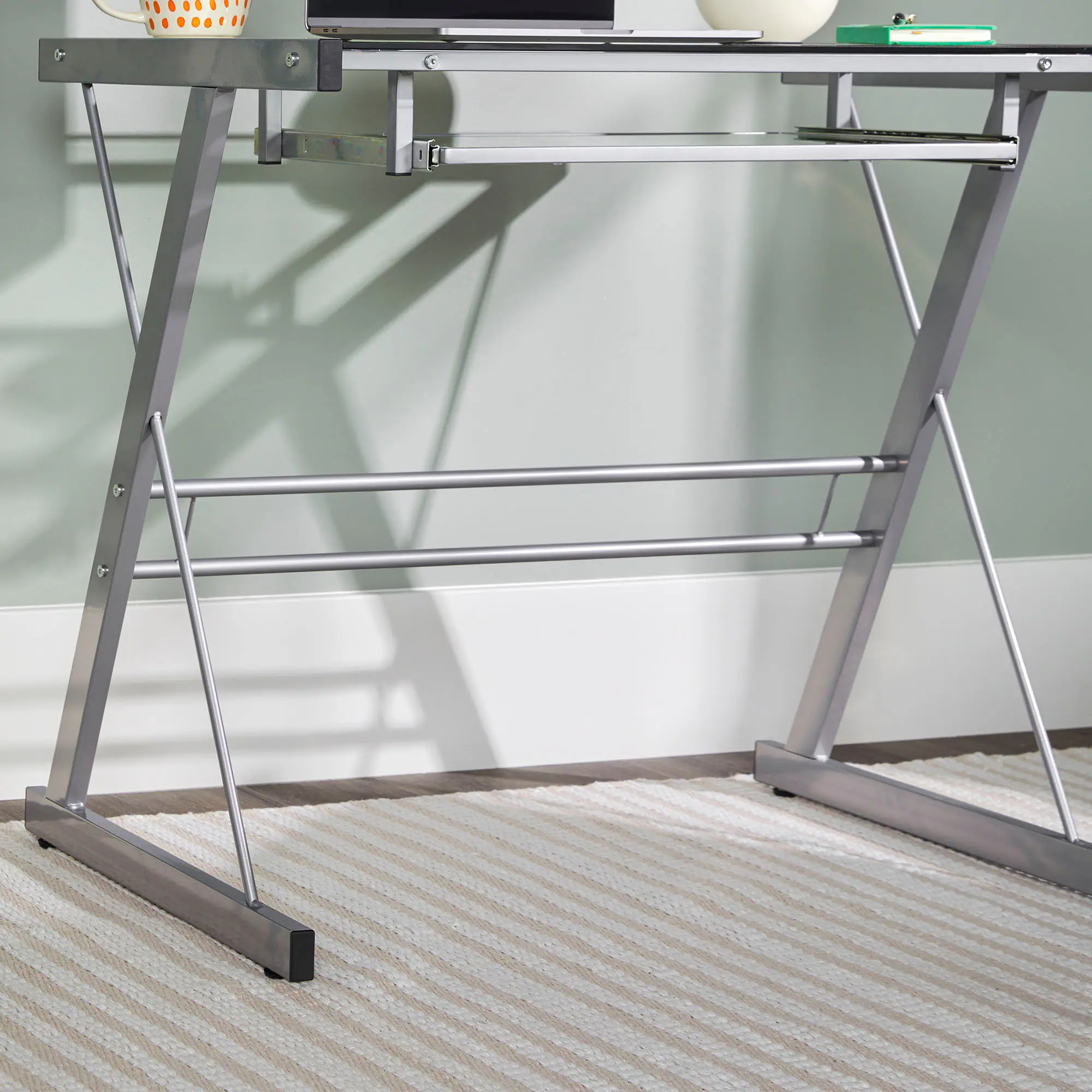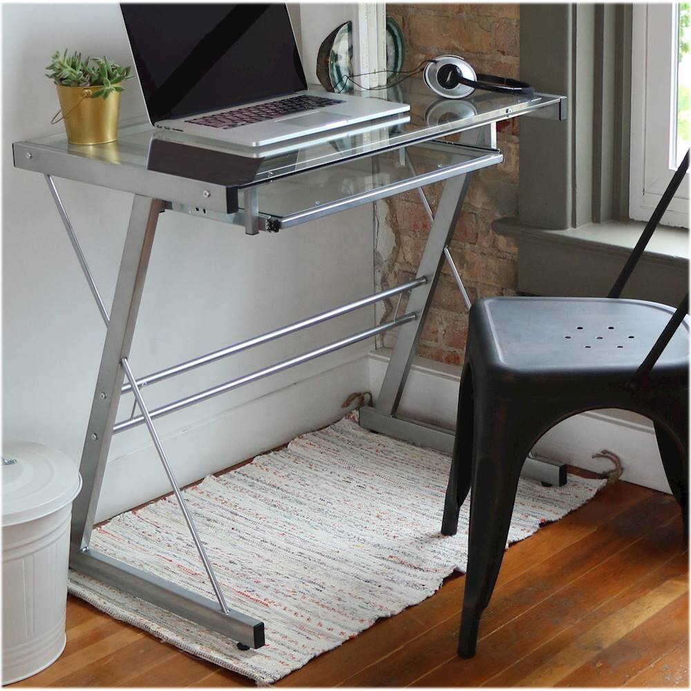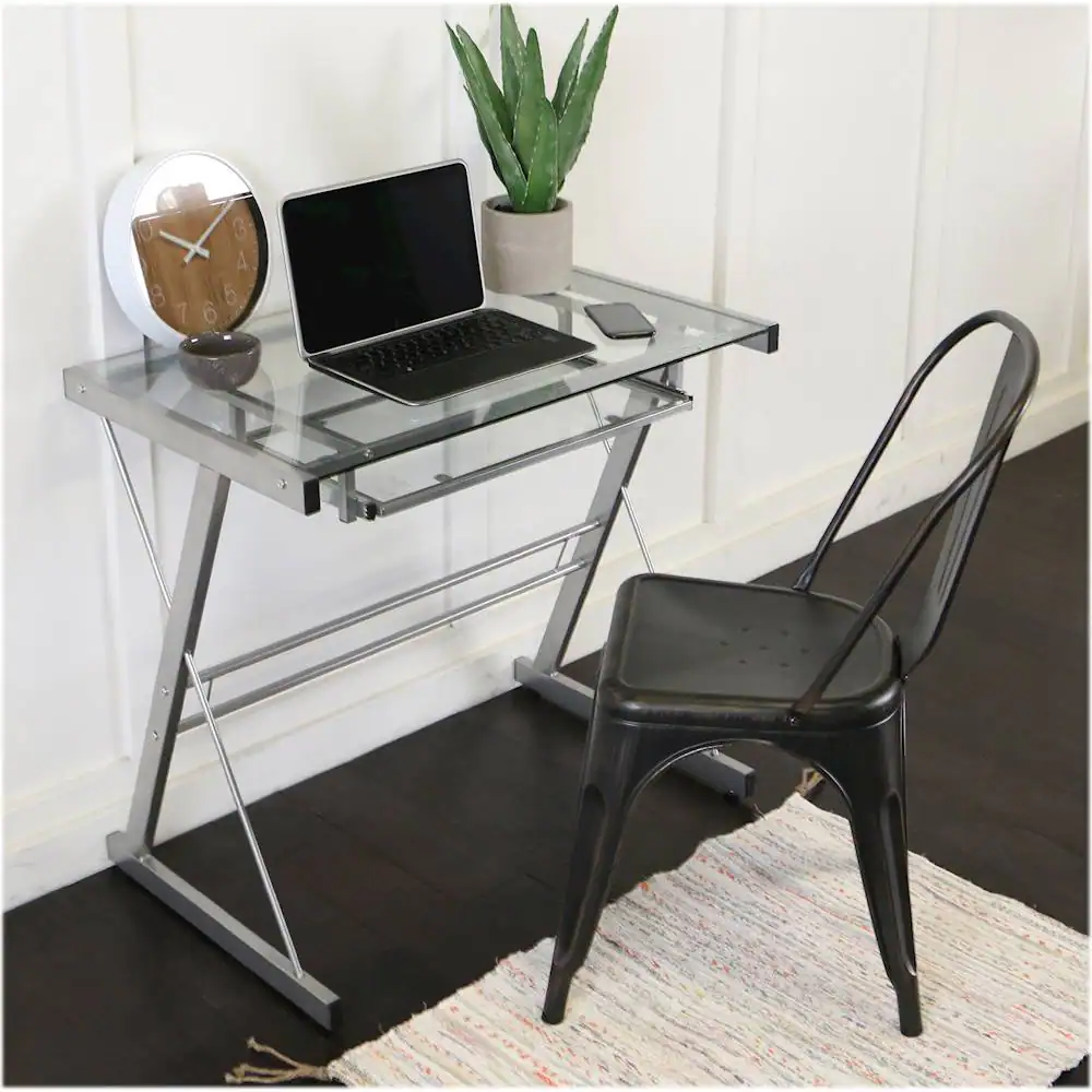 Crafted from powder coated steel and tempered safety glass, this 31 inch computer desk has a sleek, modern design. With an angular frame for both function and aesthetics, this office desk is compact enough to fit into small spaces, if needed. Features a spacious workspace and built-in sliding keyboard tray for your computer, that way you have a convenient place for anything from writing, studying, and working on projects. This classic desk will be a perfect addition to your home office or study.