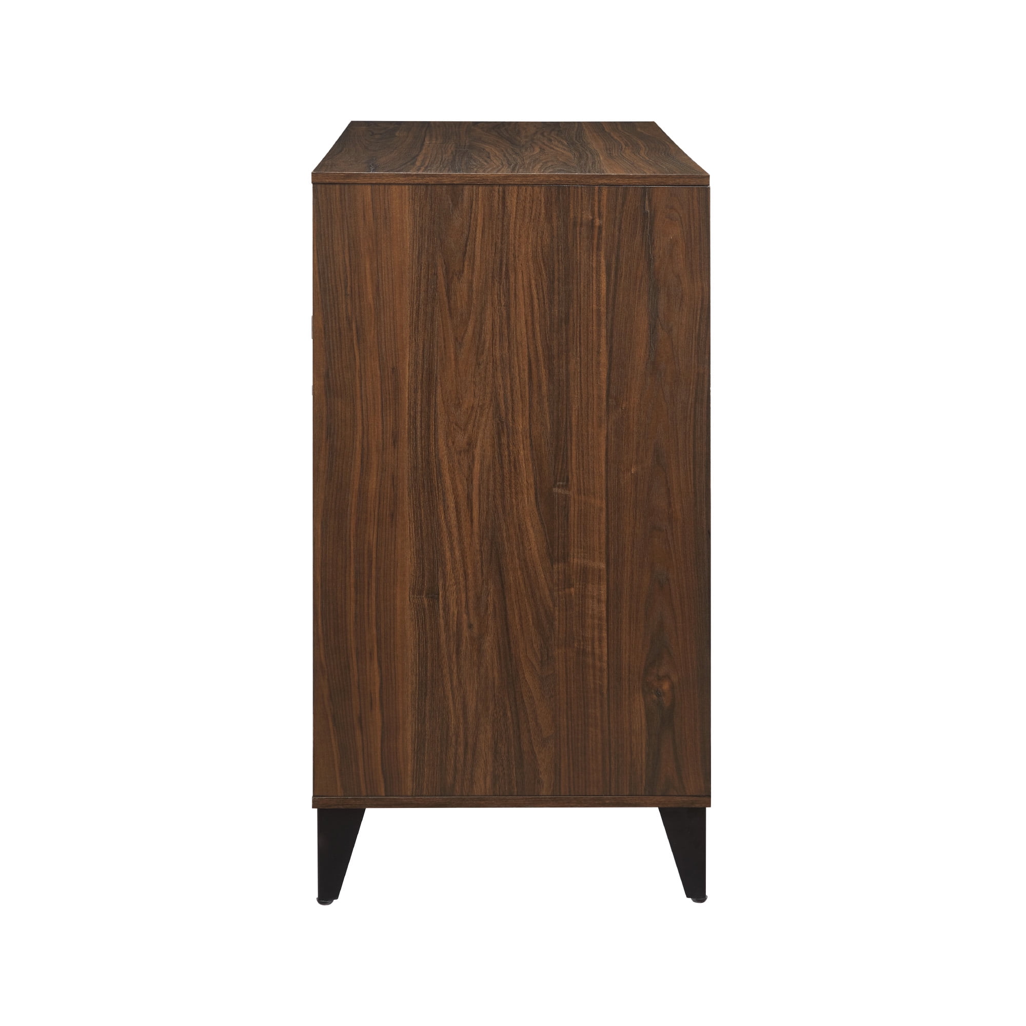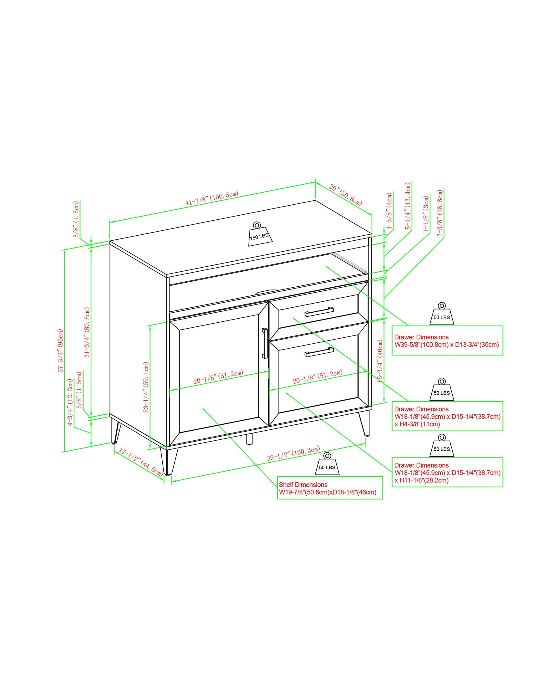 Modern style Dark walnut finish Featuring spacious drawers for easy organization Slide-out writing desk for a quick workstation Contrasting metal hardware and legs Versatile design that fits mid-century modern, modern, and contemporary aesthetics Made from warp-resistant MDF wood, durable laminate, and powder-coated steel Ships ready-to-assemble with step-by-step instructions Assembled dimensions: 38” H x 42” L x 20” W Packaged dimensions: 9″ H x 47″ L x 24″ W