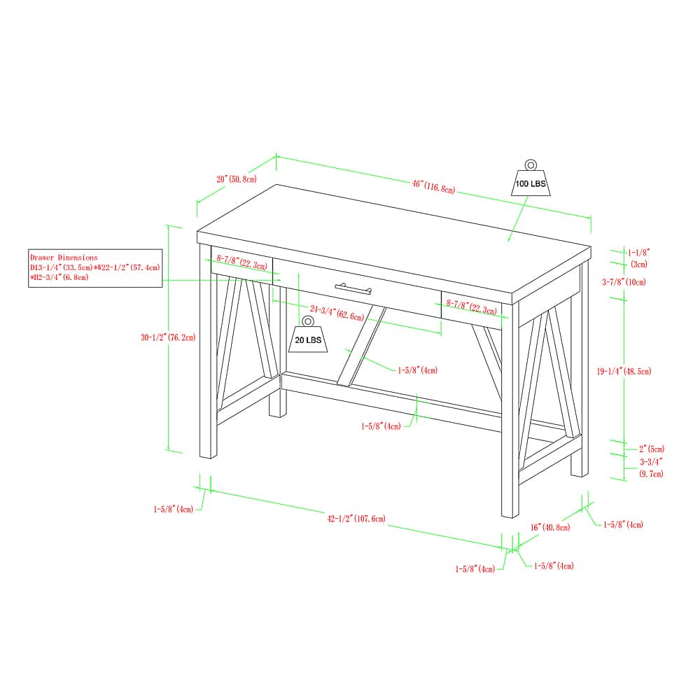 Rustic with a modern flare, our farmhouse style A-frame desk is both functional and polished. With a drawer for quick and easy storage, and a flattering two tone finish. This desk is made from durable laminate, for a reliable piece to use as a computer desk or writing desk. Study, write, read, and work on your laptop in your living room, bedroom, home office, or whichever room you decide to place it in.