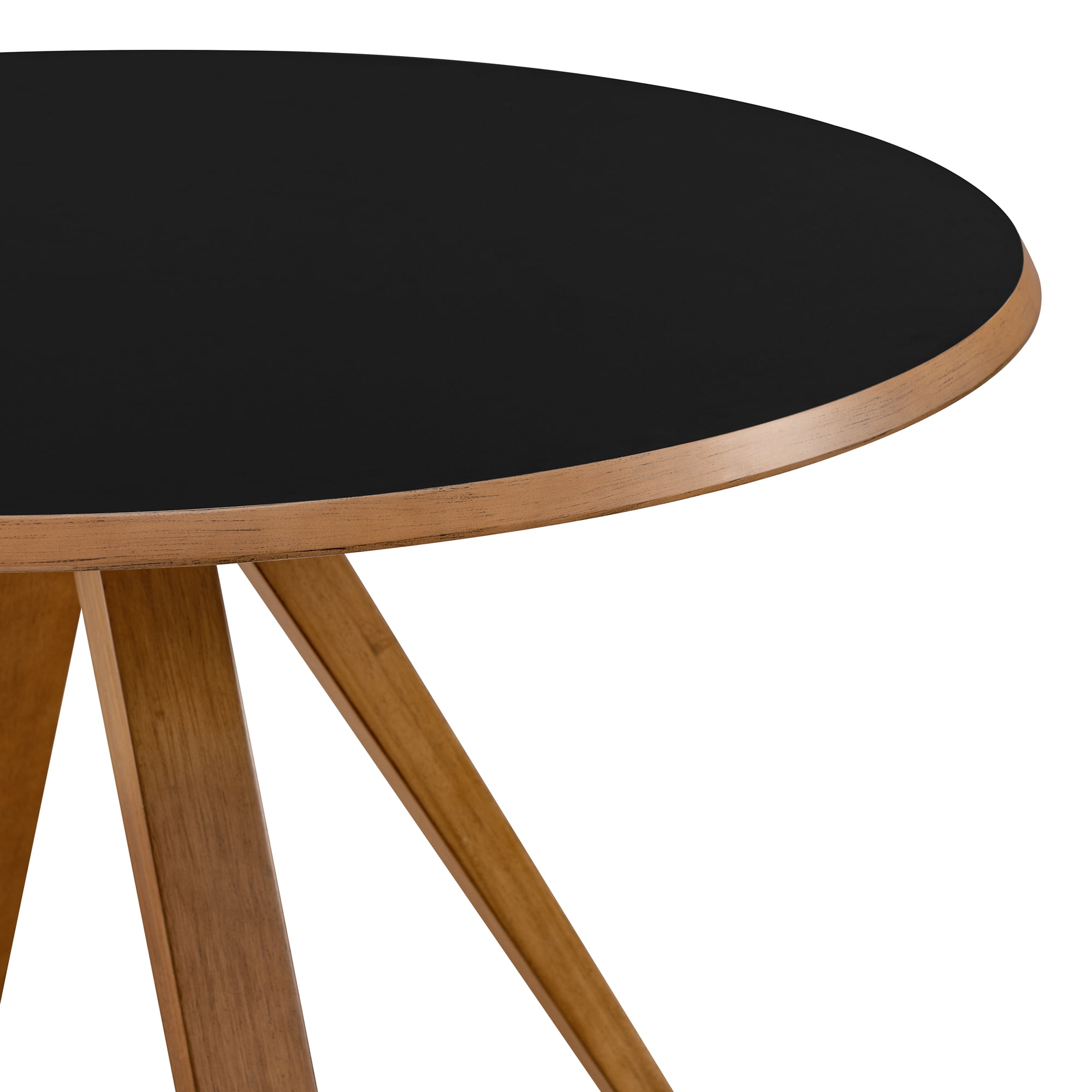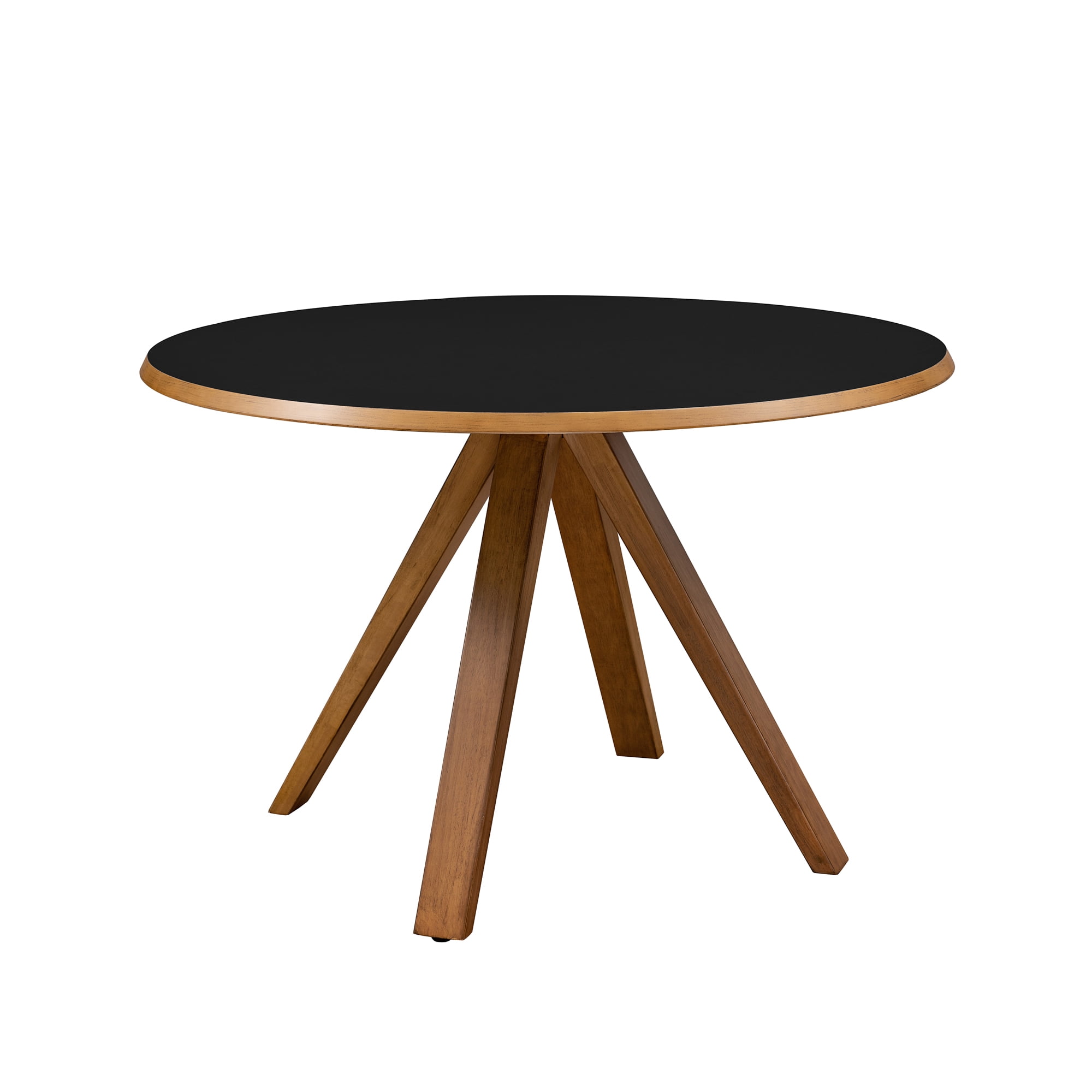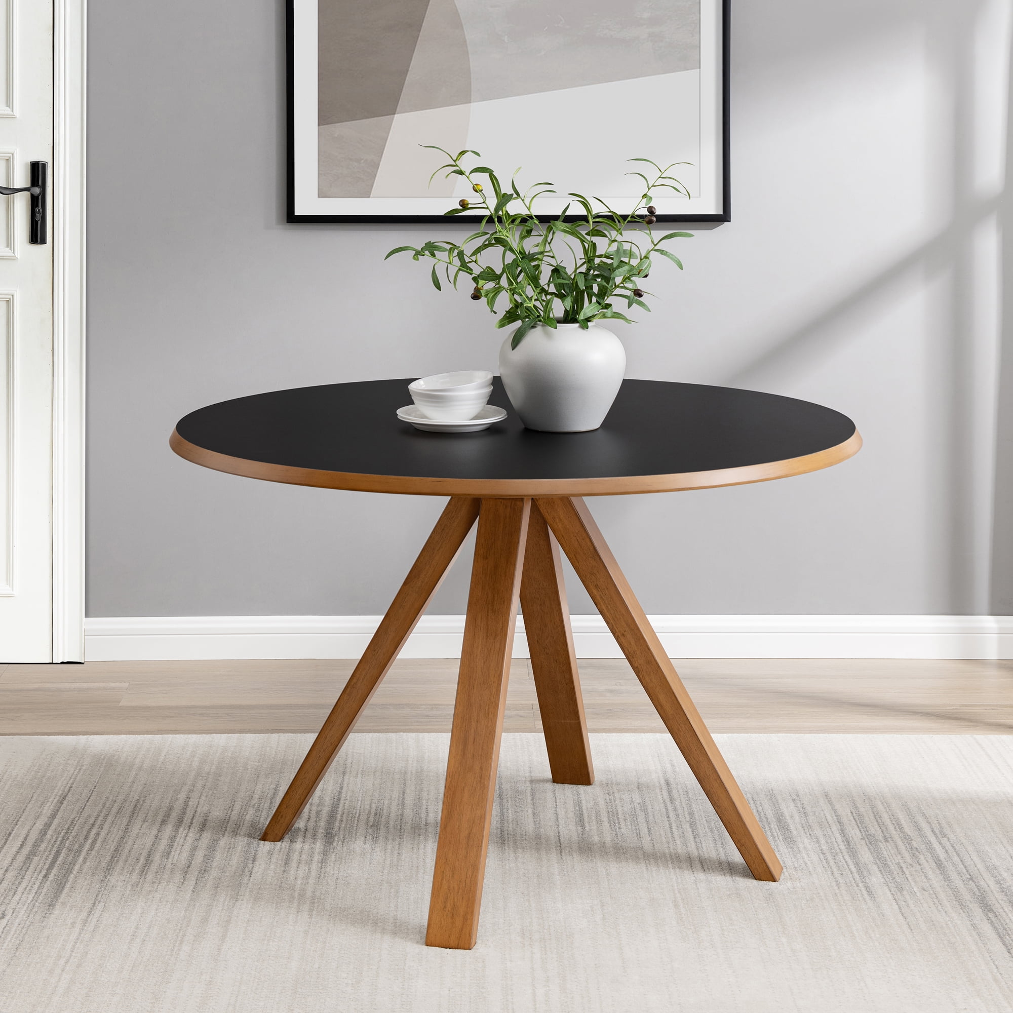 Revel in life’s simple pleasures with this delightfully minimalist round dining table. Seat up to six friends for brunch or hosting a casual game of cards with no fear of ruining your new table, as the moisture-resistant, melamine-coated tabletop is up to any task. Whether it’s in your designated dining room or studio apartment, the simple silhouette and small-space-friendly build makes this table the perfect component to tastefully furnish your forever home or temporary abode. Made with solid rubberwood, sturdy engineered wood, and a stunning laminate finish, this table is sure to provide you and your family with many memorable meals. Features: Finish: Black Materials: Made with warp-resistant MDF (Engineered Wood), solid rubberwood, and durable laminate Powder-coated steel base Moisture-resistant, melamine-coated Comfortably seats 4-6 people Ideal for mid-century, modern, or Scandi-inspired spaces Display in your small space or dining room Specifications: Product Dimensions: 30″H x 47.25″W x 47.25″D Product Weight: 70 lbs Assembly details: Ships ready-to-assemble with step-by-step instructions