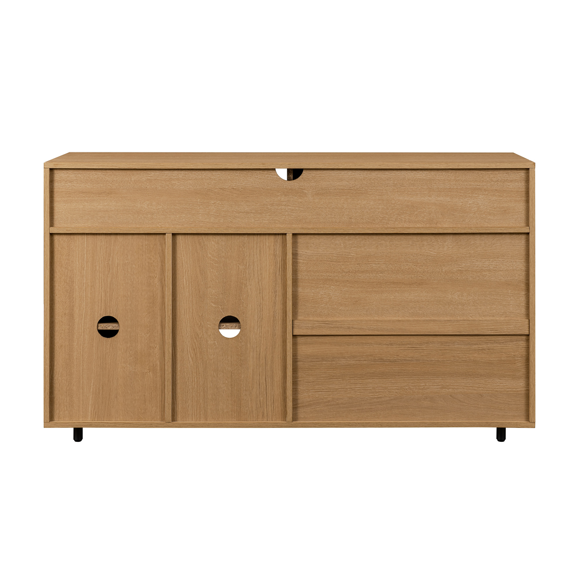 Contemporary style Coastal oak and solid white finishes Featuring 3 spacious cubbies for an open display Closed storage options include 2 drawers, 1 sliding door, and 1 hinged door Adjustable shelving for a customized storage solution Versatile design that fits in with contemporary, modern, and bohemian-styled homes. Made from warp-resistant MDF wood, durable laminate, and metal Ships ready-to-assemble with step-by-step instructions Assembled dimensions: 30” H x 52” L x 16” W Packaged dimensions: 9” H x 57” L x 20” W