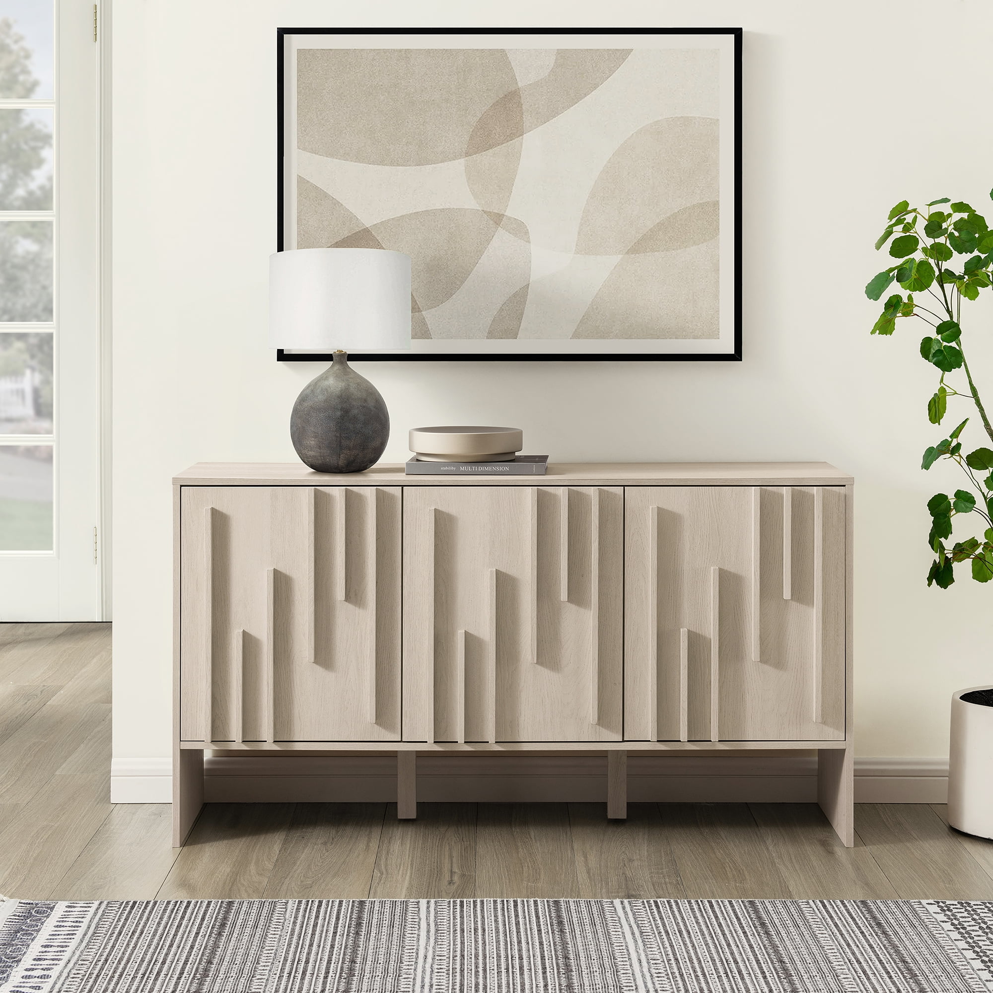 Walker Edison 55” Contemporary Vertical-Detailed 3-Door Sideboard, Ivory Oak