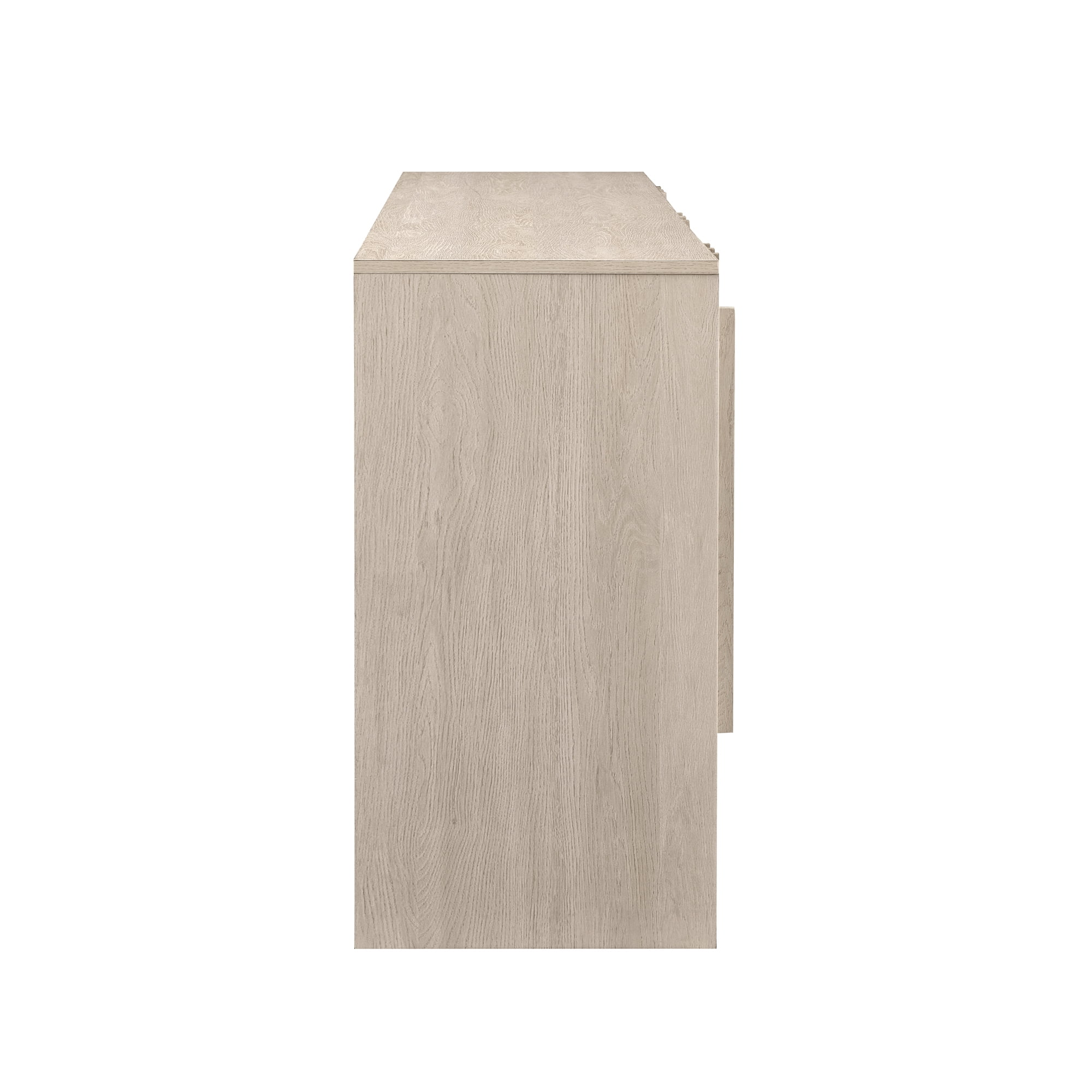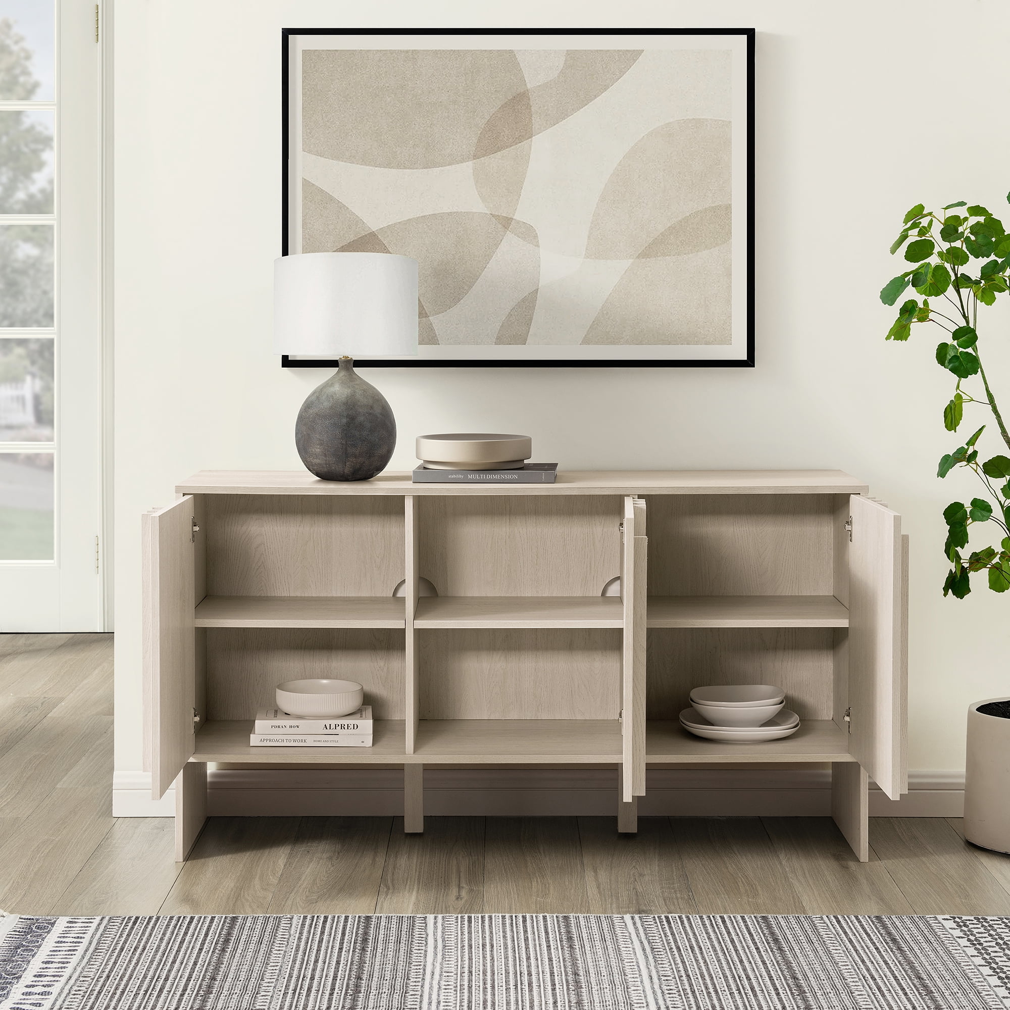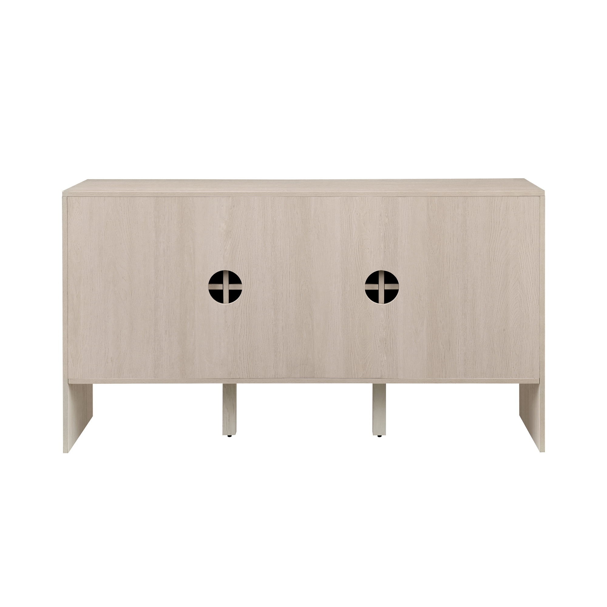 Contemporary style Ivory oak finish Unique, fashion-forward vertical detailing on front of sideboard Featuring cord management ports for tidy tech Perfect for living rooms, dining rooms, and lobbies Soft-close, adjustable hinges for quiet functionality Versatile design that fits in with contemporary, Scandinavian, and modern-styled homes Made from warp-resistant MDF wood and durable laminate Ships ready-to-assemble with step-by-step instructions Assembled dimensions: 30” H x 55” L x 16” W Packaged dimensions: 8″ H x 61″ L x 25″ W