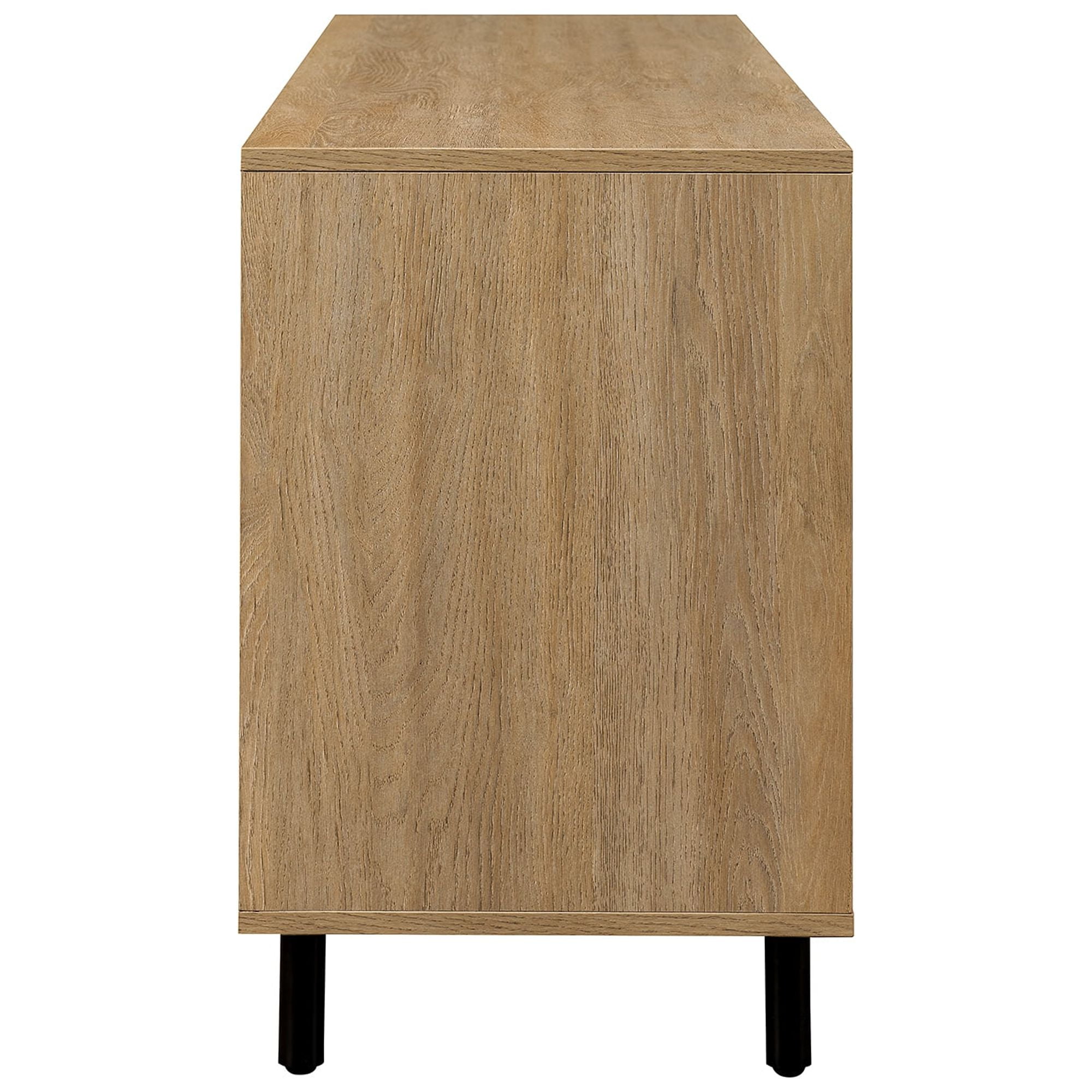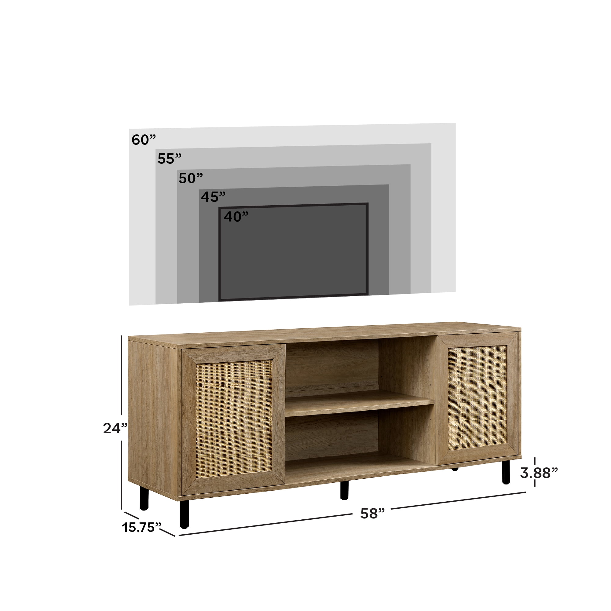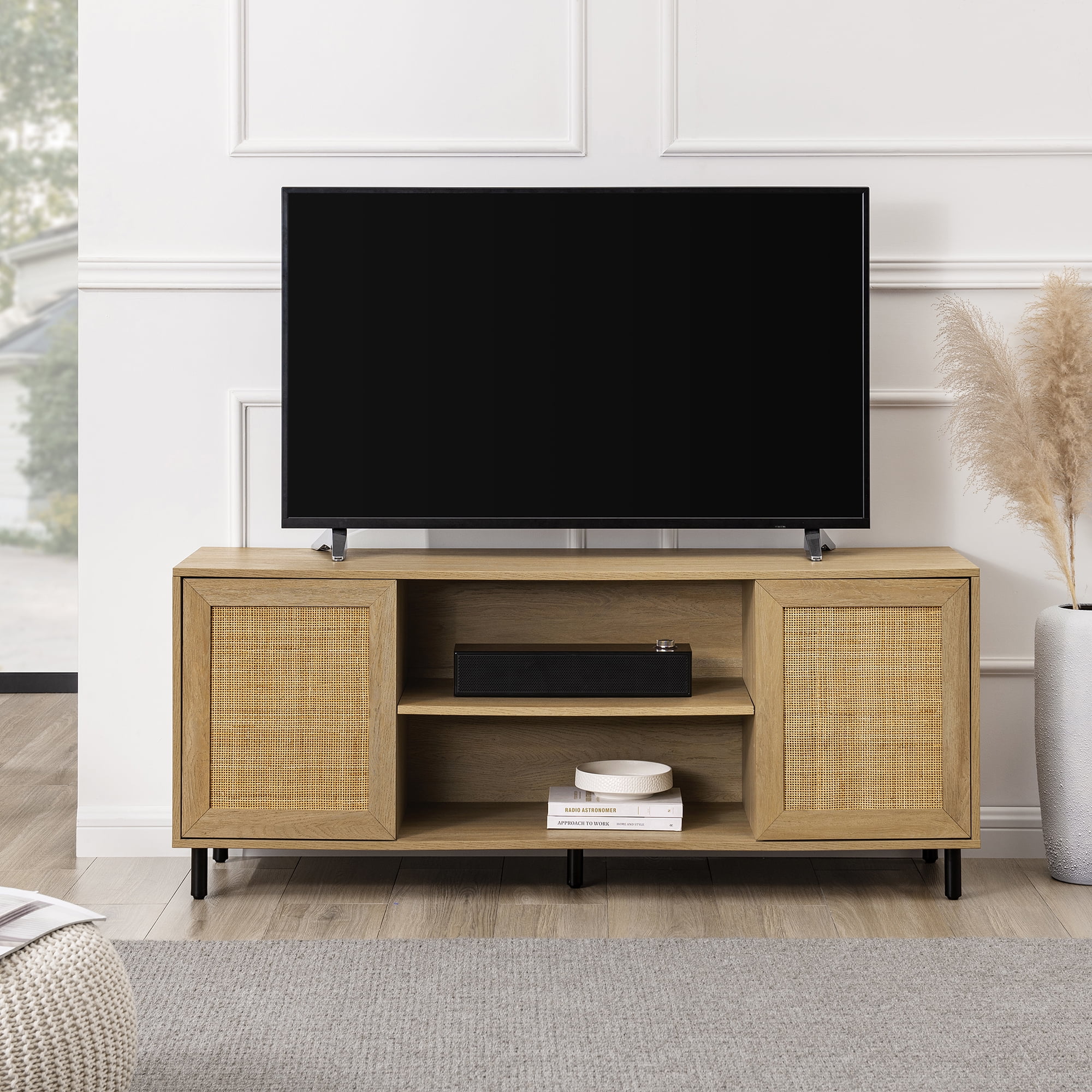 Bohemian style Coastal oak finish Featuring rattan detailing on the front of 2 doors Adjustable shelf behind each door and in the center of the console Push-click doors for easy and modern functionality Versatile design that fits right in with bohemian, Japandi, and minimalistic-styled homes. Made from warp-resistant MDF wood, durable laminate, and natural rattan Ships ready-to-assemble with step-by-step instructions Assembled dimensions: 24” H x 58” L x 16” W Packaged dimensions: 6″ H x 63″ L x 19″ W