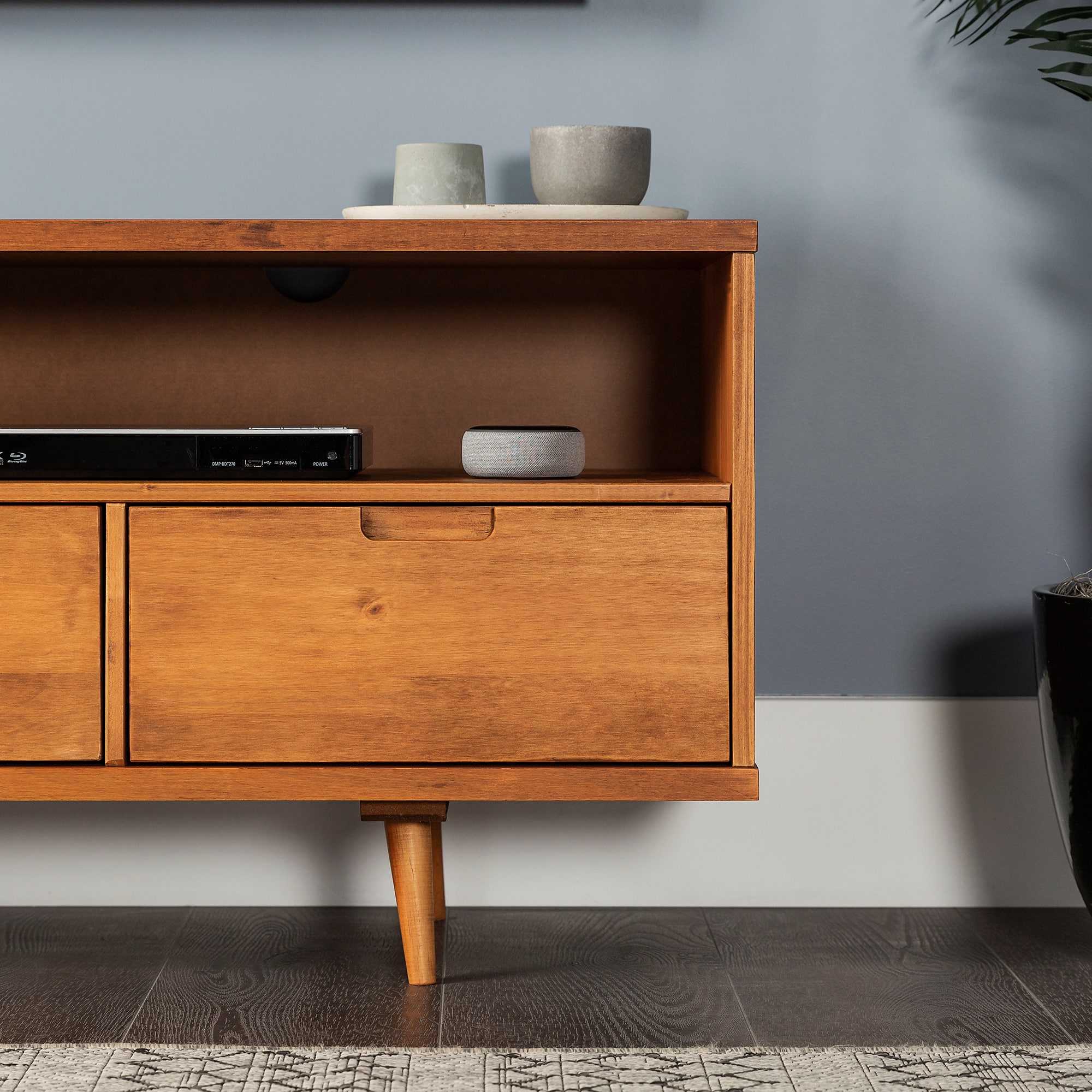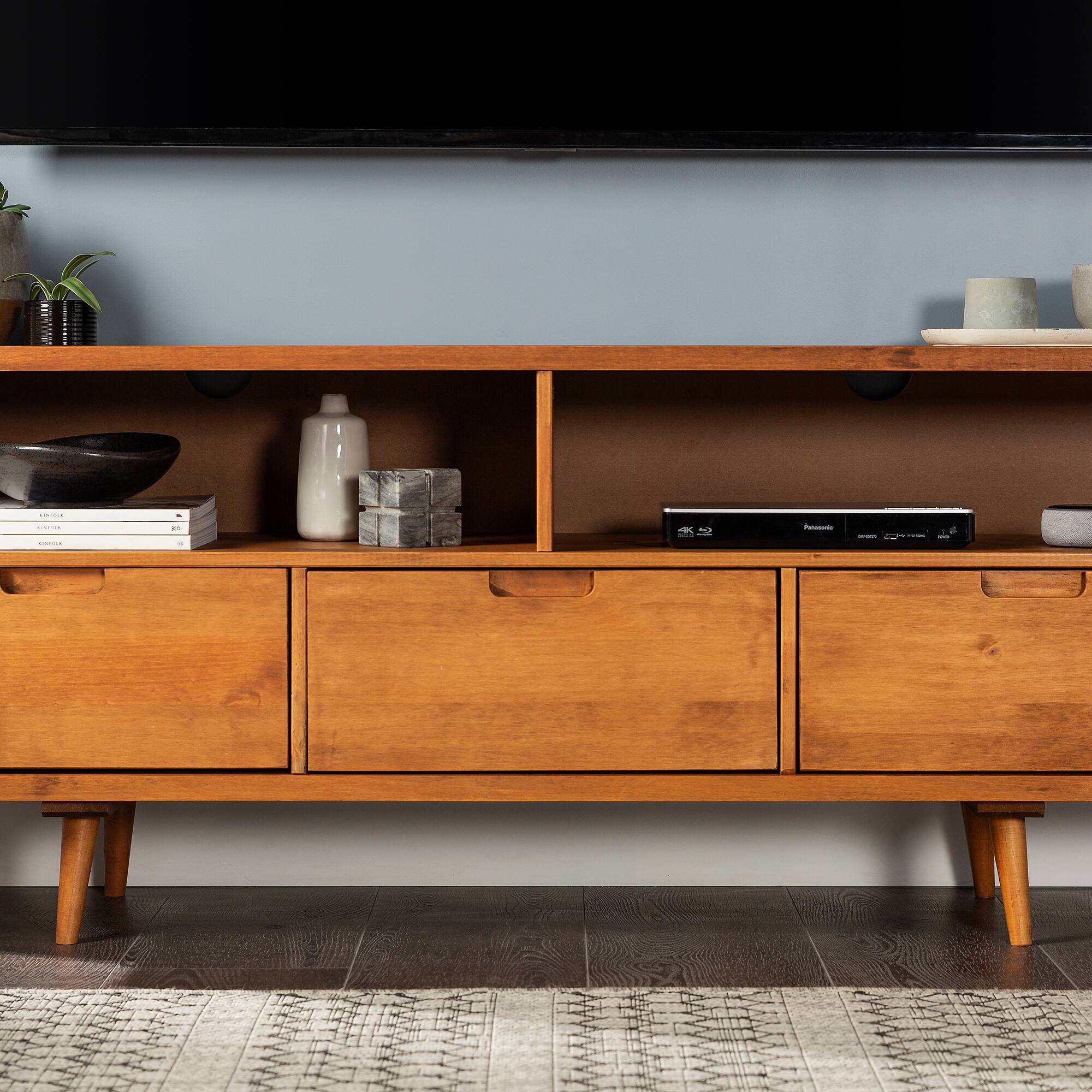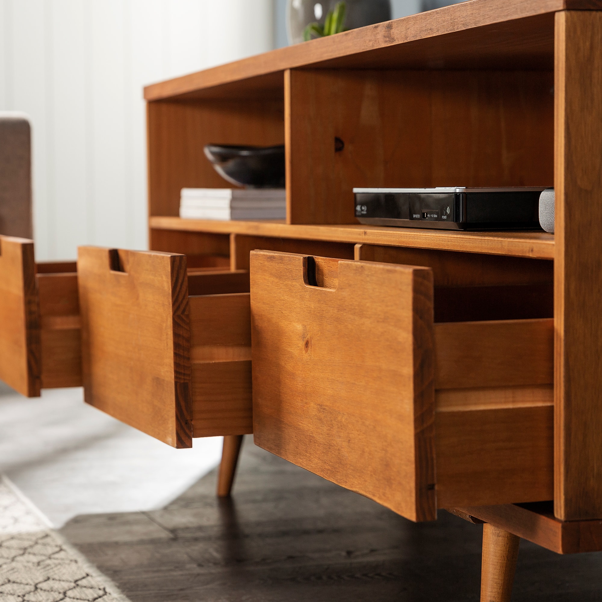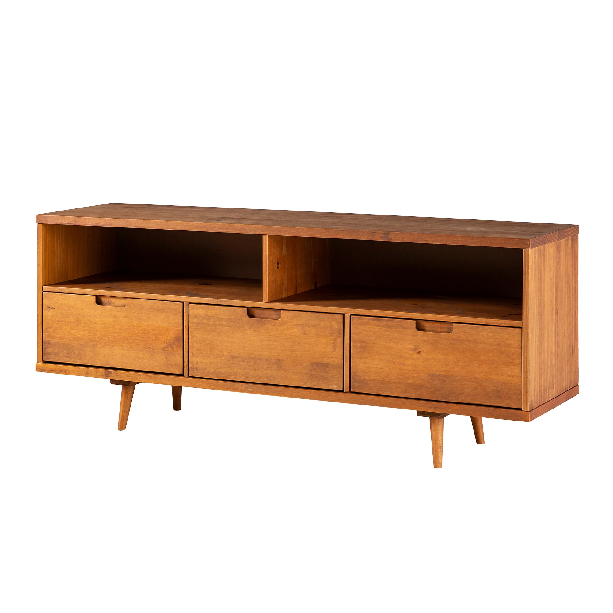 With slightly tapered legs, this 58-inch TV stand features a Mid-century modern silhouette to complement your home’s aesthetic. Crafted of solid pine wood to showcase a beautiful, natural grain stained finish for a warm texture to your living room. With three easy to access drawers featuring cutout handles, two open shelves above, and cord management to organize your electronics. This TV stand can also be incorporated in your bedroom as a storage cabinet or in your kitchen as a buffet due to its versatile design. Providing additional storage space in your home for the essentials you love most, from your favorite movies to your book collection and family photos. This entertainment center can fit up to a 65-inch TV.