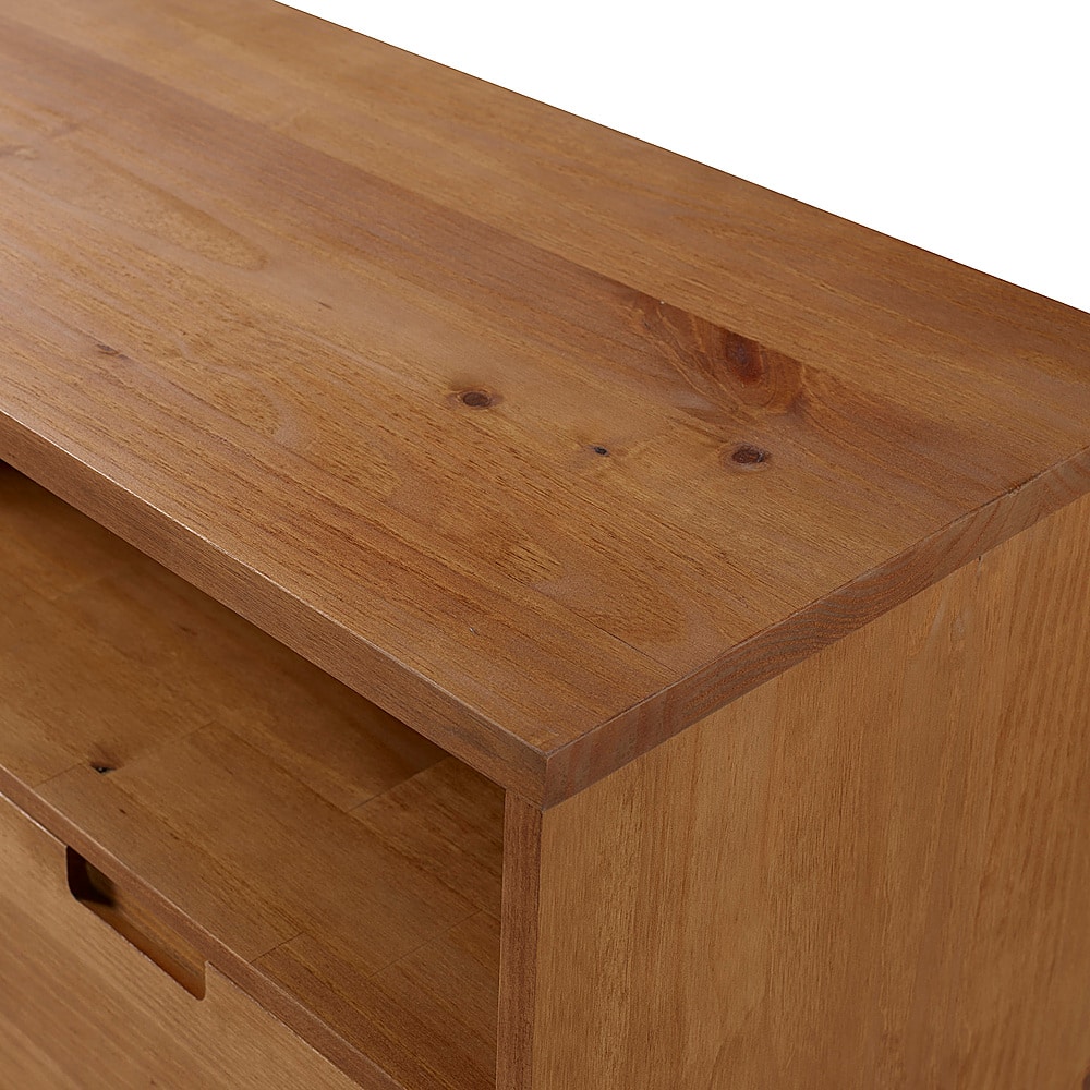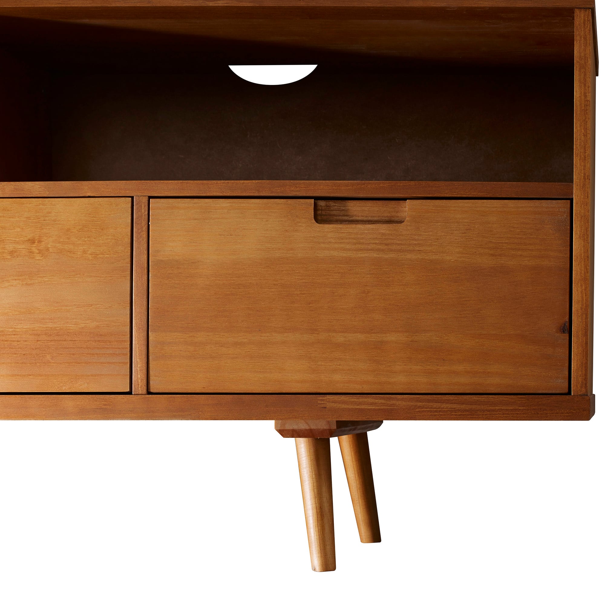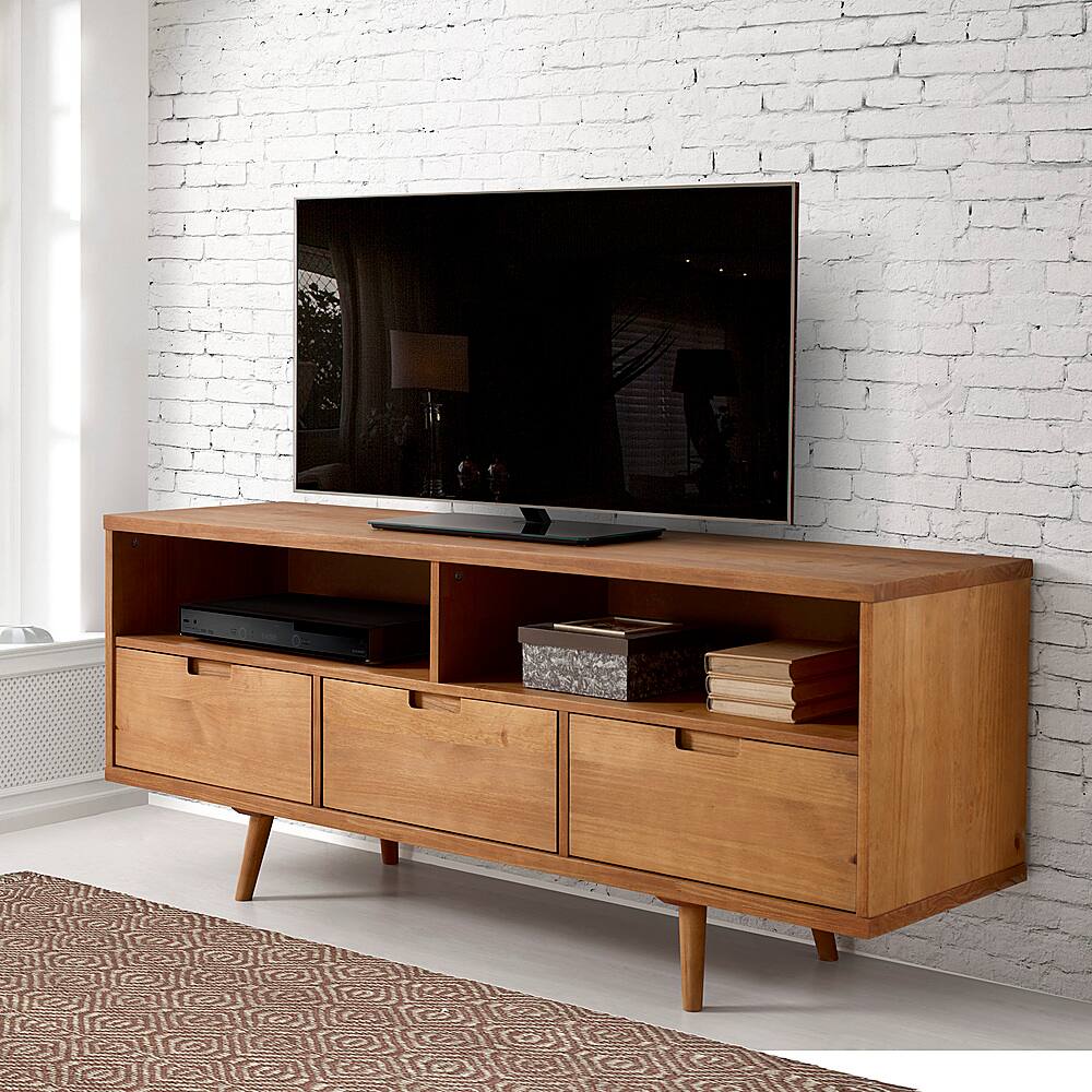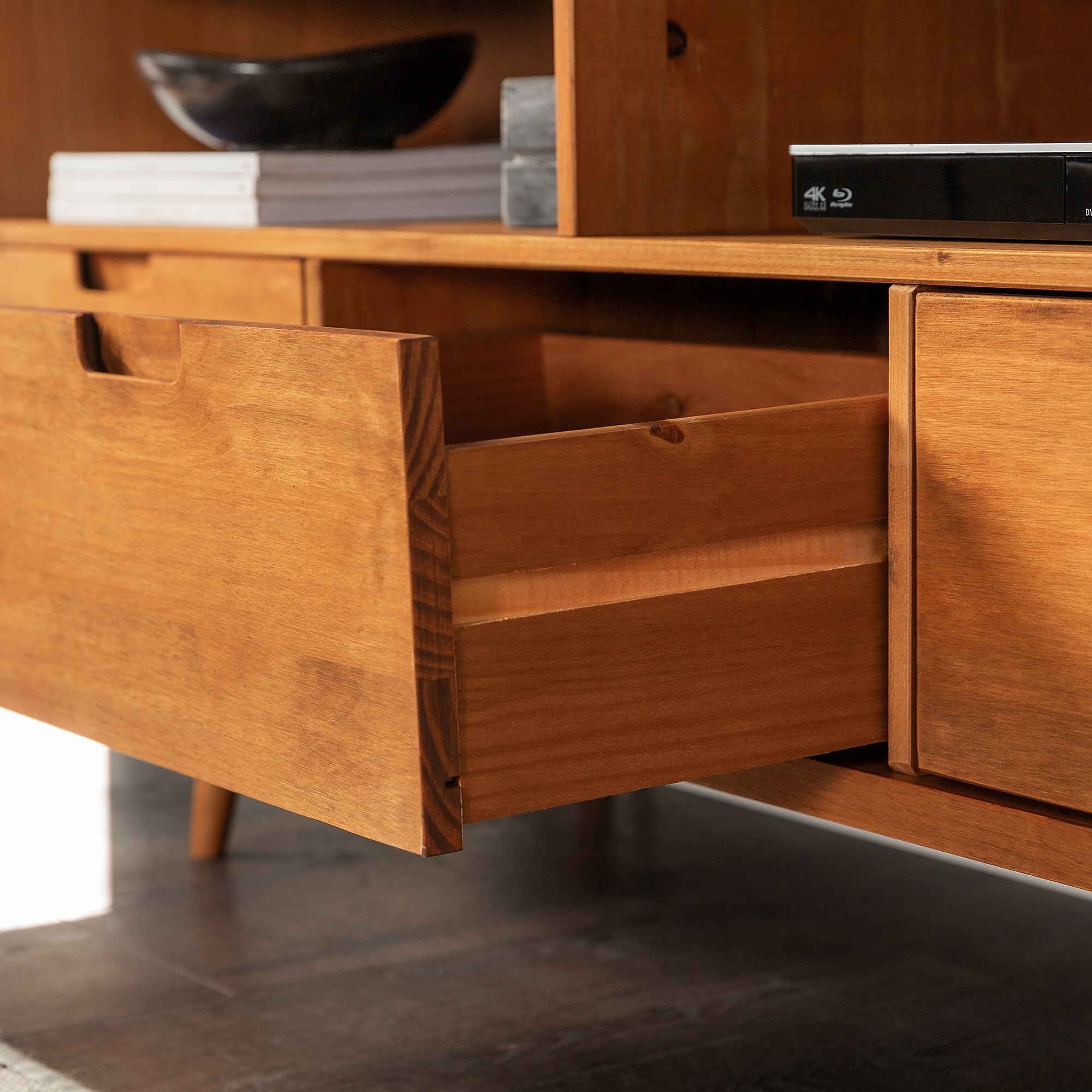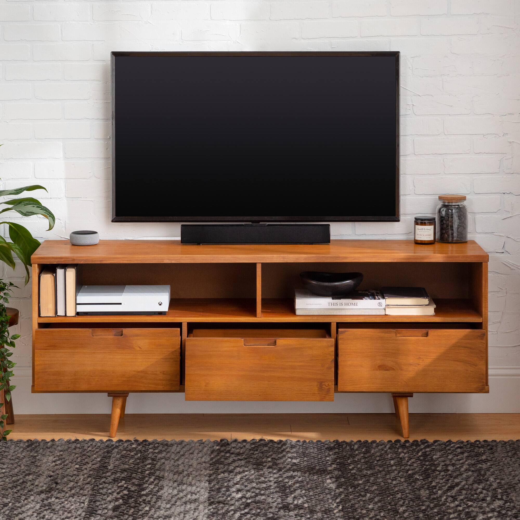 With slightly tapered legs, this 58-inch TV stand features a Mid-century modern silhouette to complement your home’s aesthetic. Crafted of solid pine wood to showcase a beautiful, natural grain stained finish for a warm texture to your living room. With three easy to access drawers featuring cutout handles, two open shelves above, and cord management to organize your electronics. This TV stand can also be incorporated in your bedroom as a storage cabinet or in your kitchen as a buffet due to its versatile design. Providing additional storage space in your home for the essentials you love most, from your favorite movies to your book collection and family photos. This entertainment center can fit up to a 65-inch TV.