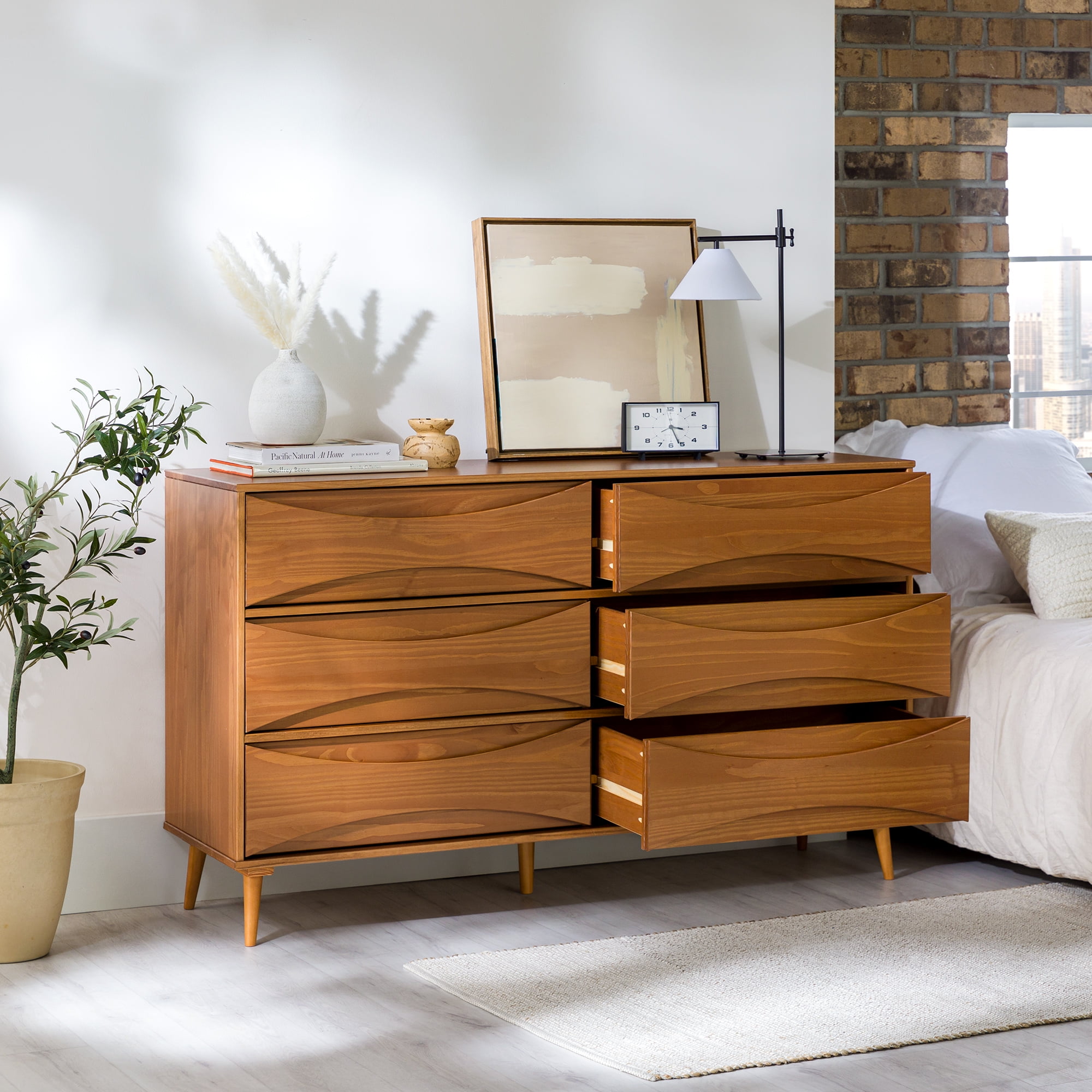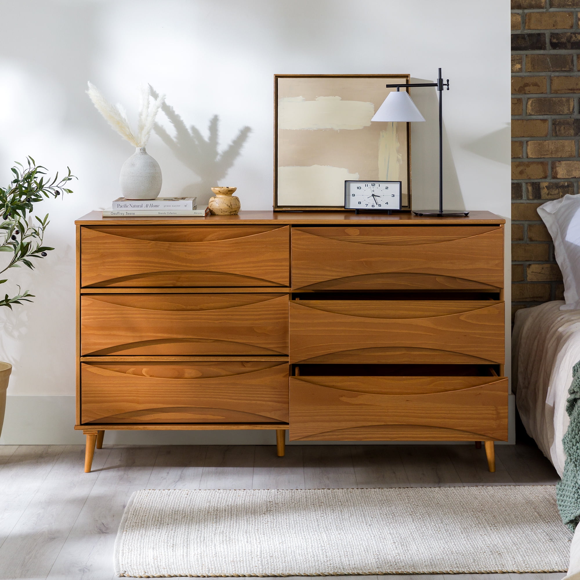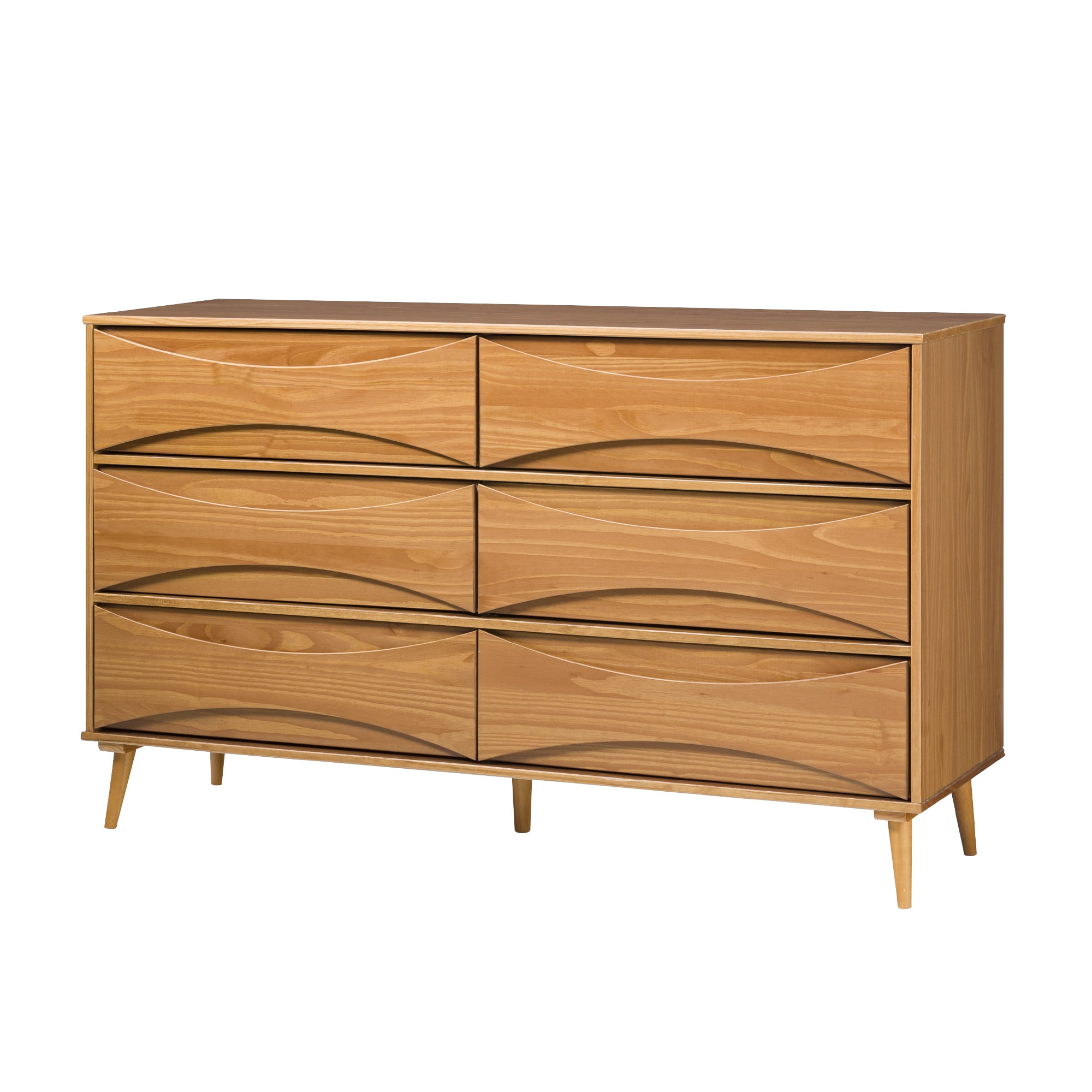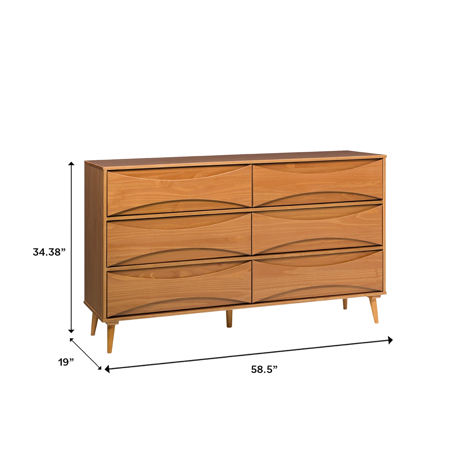 Mid-century modern style Caramel finish 6 spacious drawers for storing the essentials Featuring unique, curved detailing on front of drawers Retro-inspired tapered legs Versatile silhouette that fits in with mid-century modern, contemporary, and bohemian-styled homes Made from responsibly harvested solid pine wood Ships ready-to-assemble with step-by-step instructions Assembled dimensions: 34” H x 59” L x 19” W Packaged dimensions: 9” H x 61” L x 20” W