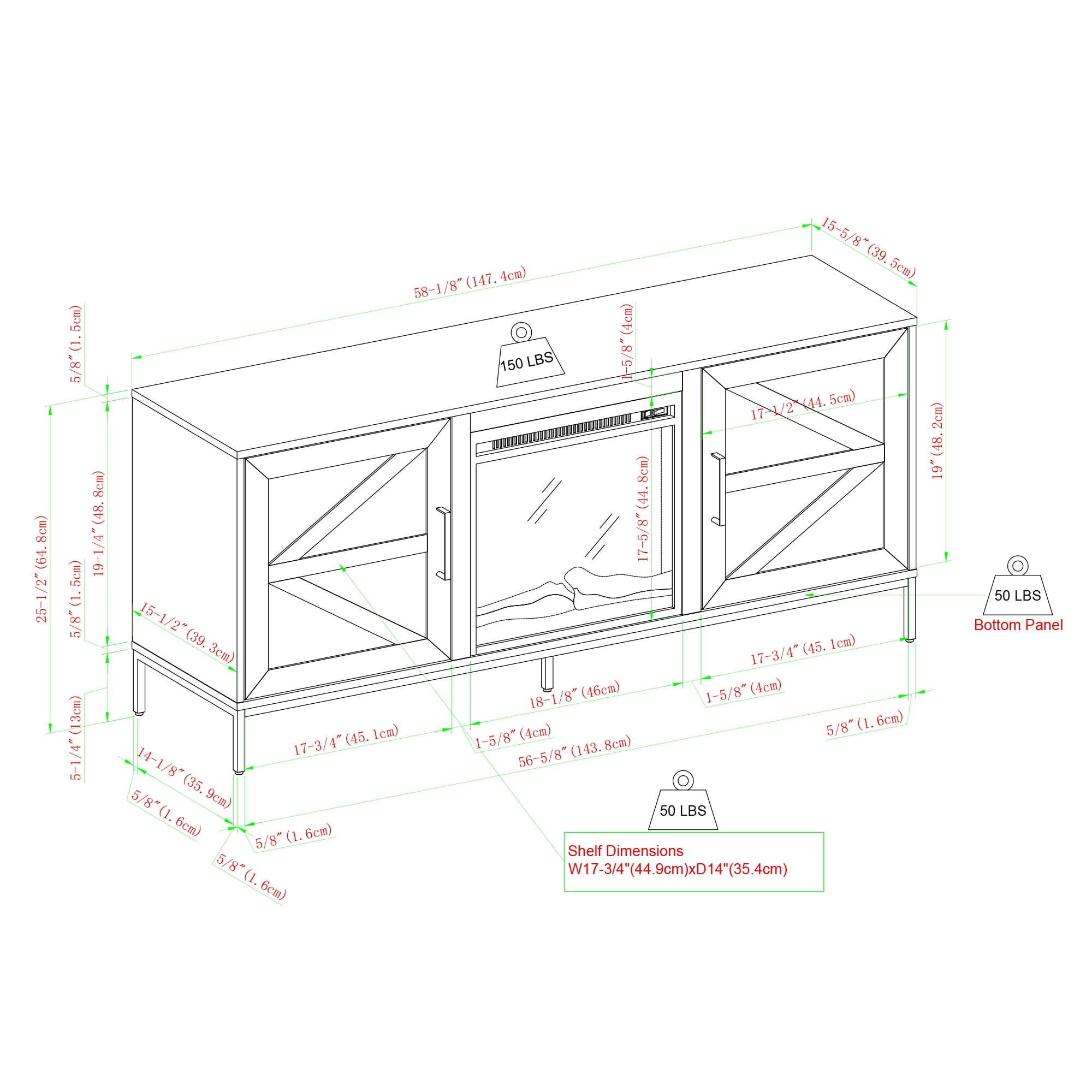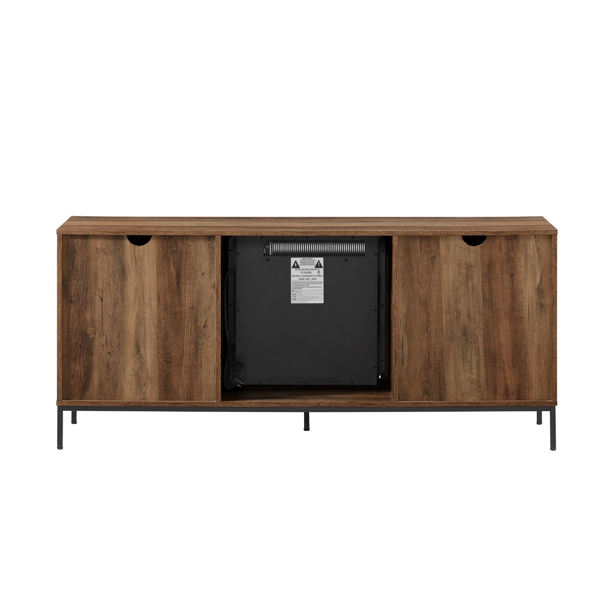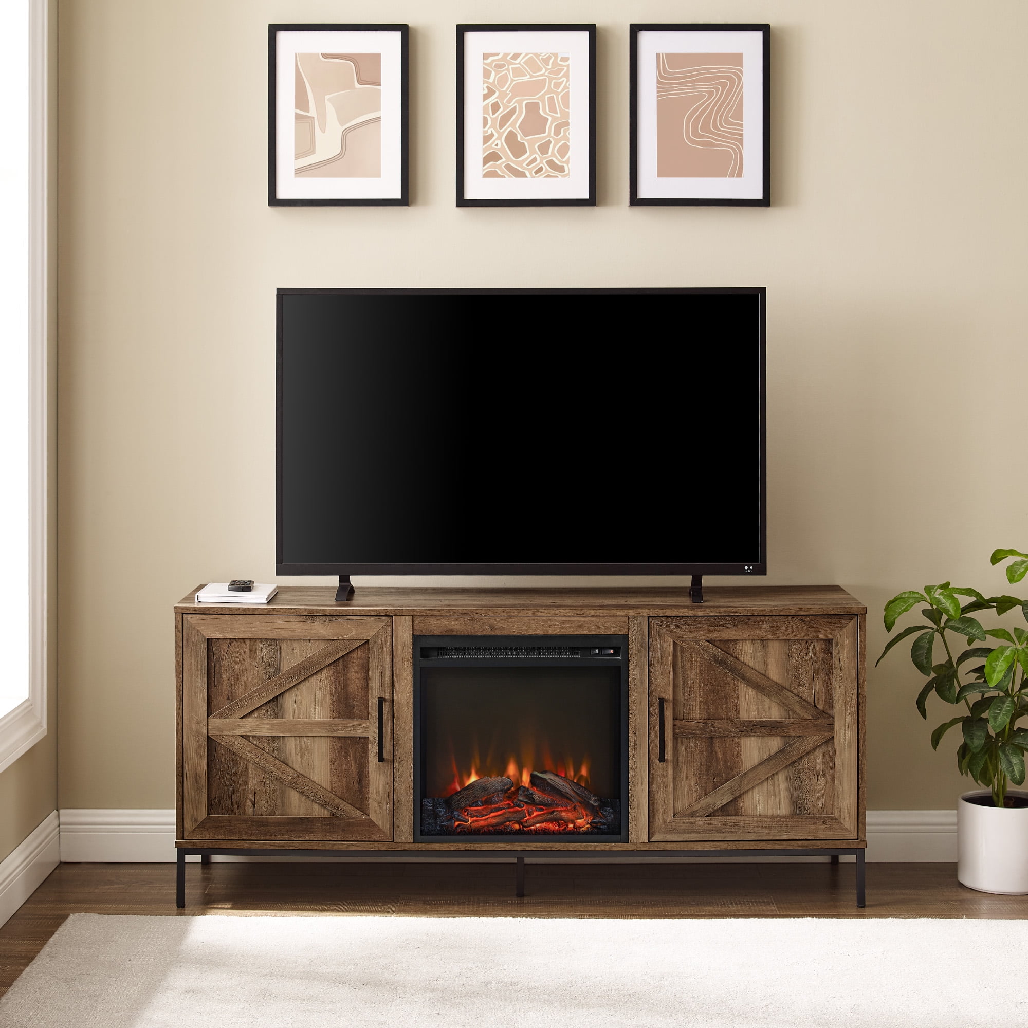 Turn on a cozy fireplace with just a touch of a button with the Walker Edison 58” Modern Rustic Electric Fireplace TV Stand. Enjoy a plug-in fireplace that brings faux flames and real heat to your living room—without having to call an electrician! The soft-close barn doors offer quiet functionality and help maintain the condition of the piece. Keep your tech and gadgets nice and tidy with cord management ports. Use the two adjustable shelves to cater to your unique storage needs. This TV stand is for TVs up to 65 inches.