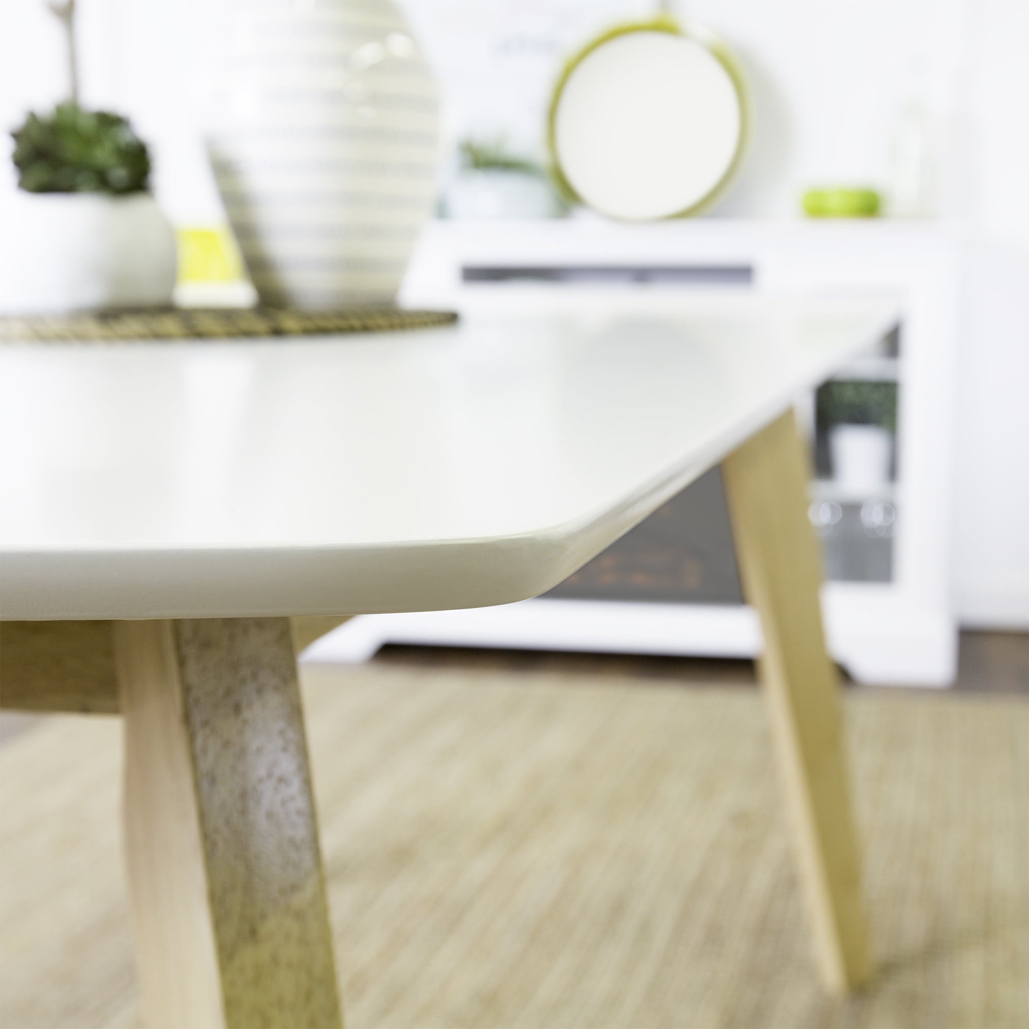 Finish: White/Natural Material: Solid wood and high-grade MDF Retro modern design Beautiful painted finish Sturdy solid wood legs Pairs with our matching Retro Modern Dining Chairs Ships ready-to-assemble with step-by-step instructions