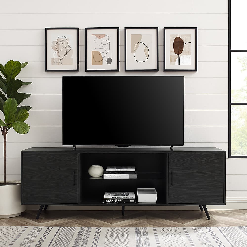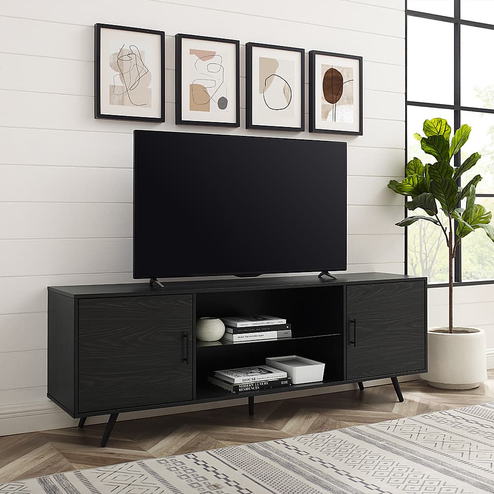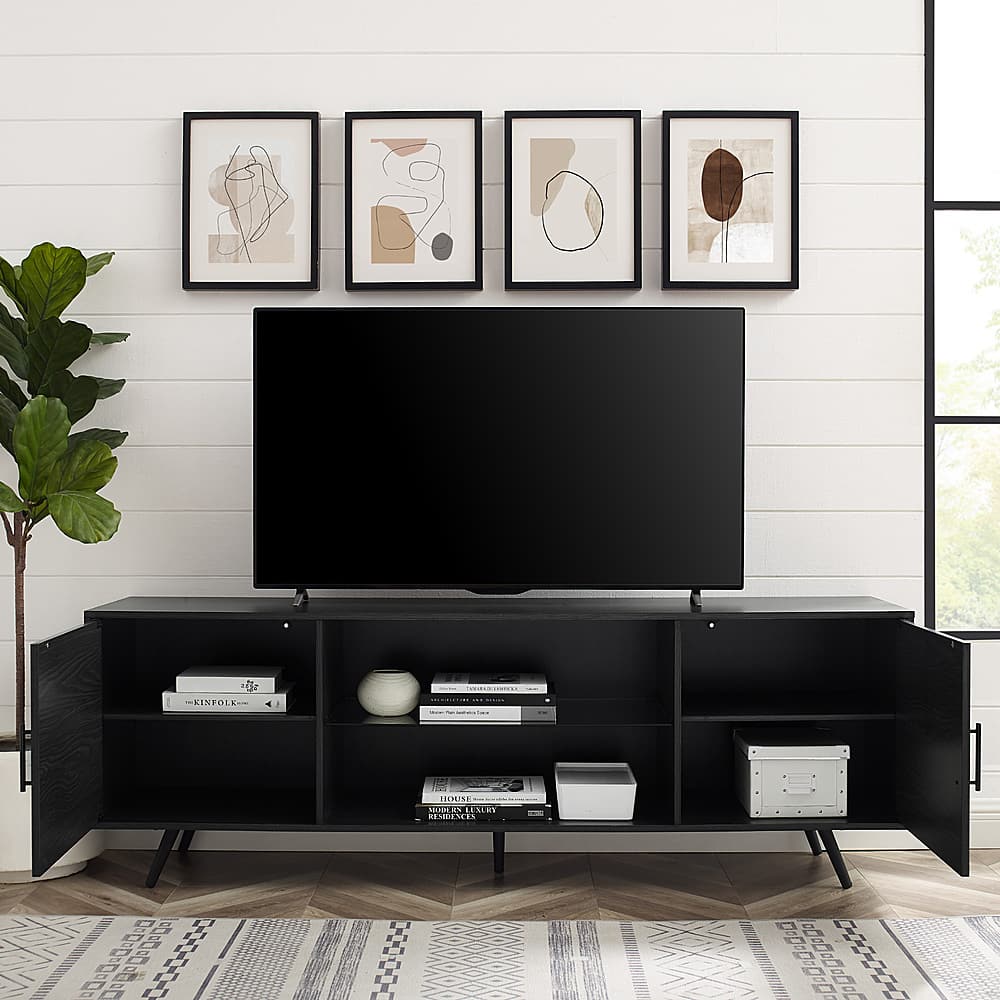 Take your living room to the next level with this stylish 70 inch TV stand. Made with metal tapered legs, sleek metal handles, and a center glass shelf for a mid century modern appearance. This warp-resistant MDF entertainment center creates additional storage space in your home for media, electronics, accessories, books, or décor. Use as a TV stand in your living room, a storage cabinet in your bedroom, or a buffet in your kitchen or dining room. Including two side cabinets for closed storage space and center open shelving. Can accomodate up to an 80 inch TV (when measured diagonally corner to corner).