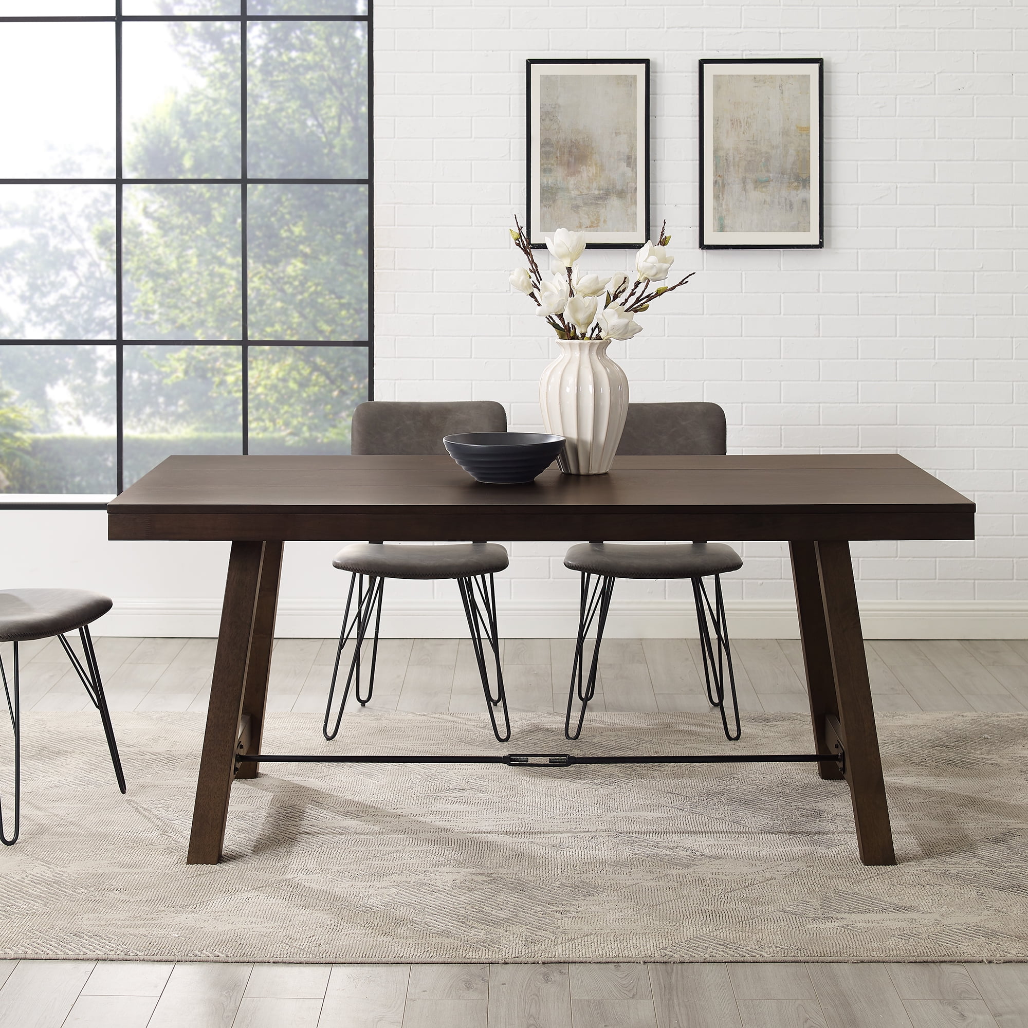 Color: Dark Brown Oak Modern farmhouse dining table Powder-coated metal stretcher for extra stability Sleek veneer provides a rich look and protective layer Made from warp-resistant MDF wood Perfect for the kitchen or dining room Comfortably seats 6