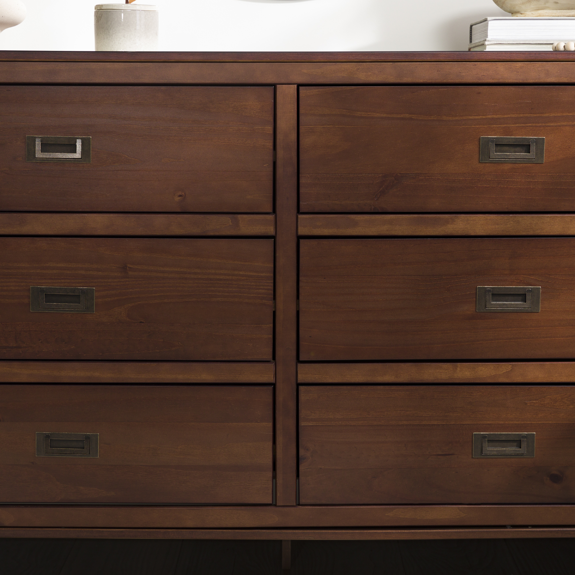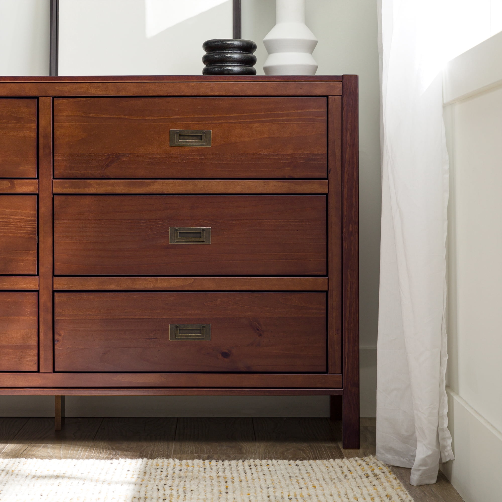 Six easy to open drawers with cutout metal handles. Classic black painted finish. Durable materials. What more could you want out of a dresser than the Annabelle Six Drawer Solid Wood Walnut Dresser by Walker Edison? The solid wood frame, high grade MDF backing and drawer bottoms, and metal hardware ensure this dresser will last a lifetime. The timeless silhouette will never go out of style and will match whatever interior decorating you have throughout the years. Tuck clothing, shoes, or other items out of sight in one of the six large drawers. You’ll feel more organized than ever after adding this dresser to your collection.
