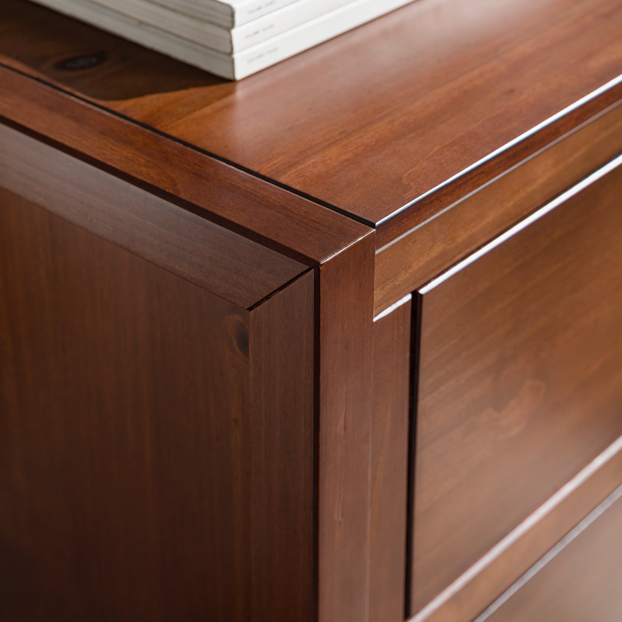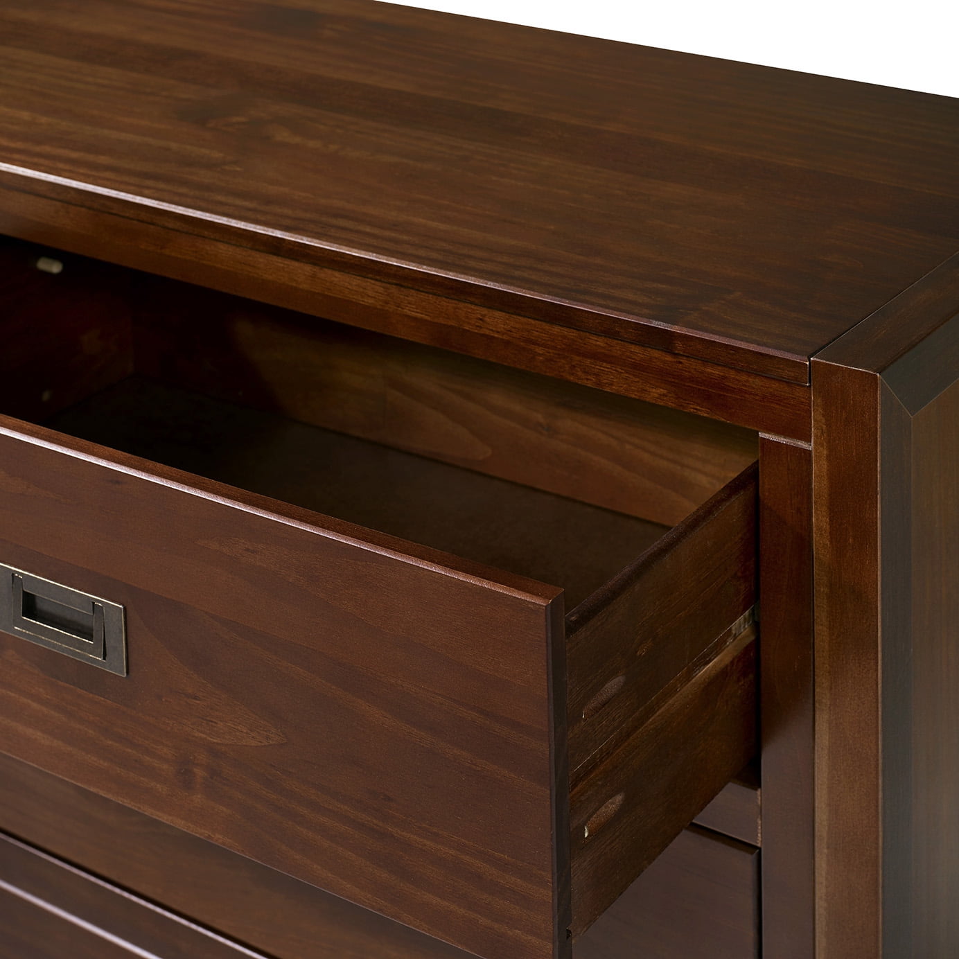 Packaged dimensions: 5″ H x 58″ L x 37″ W Assembled Dimensions: 34” H x 57” L x 18” W Materials: Solid wood, high grade MDF, and metal Assembly: Some assembly required Modern style dresser Walnut painted finish Closed storage Six drawers with wood runners Cutout painted metal handles Finished drawer interiors