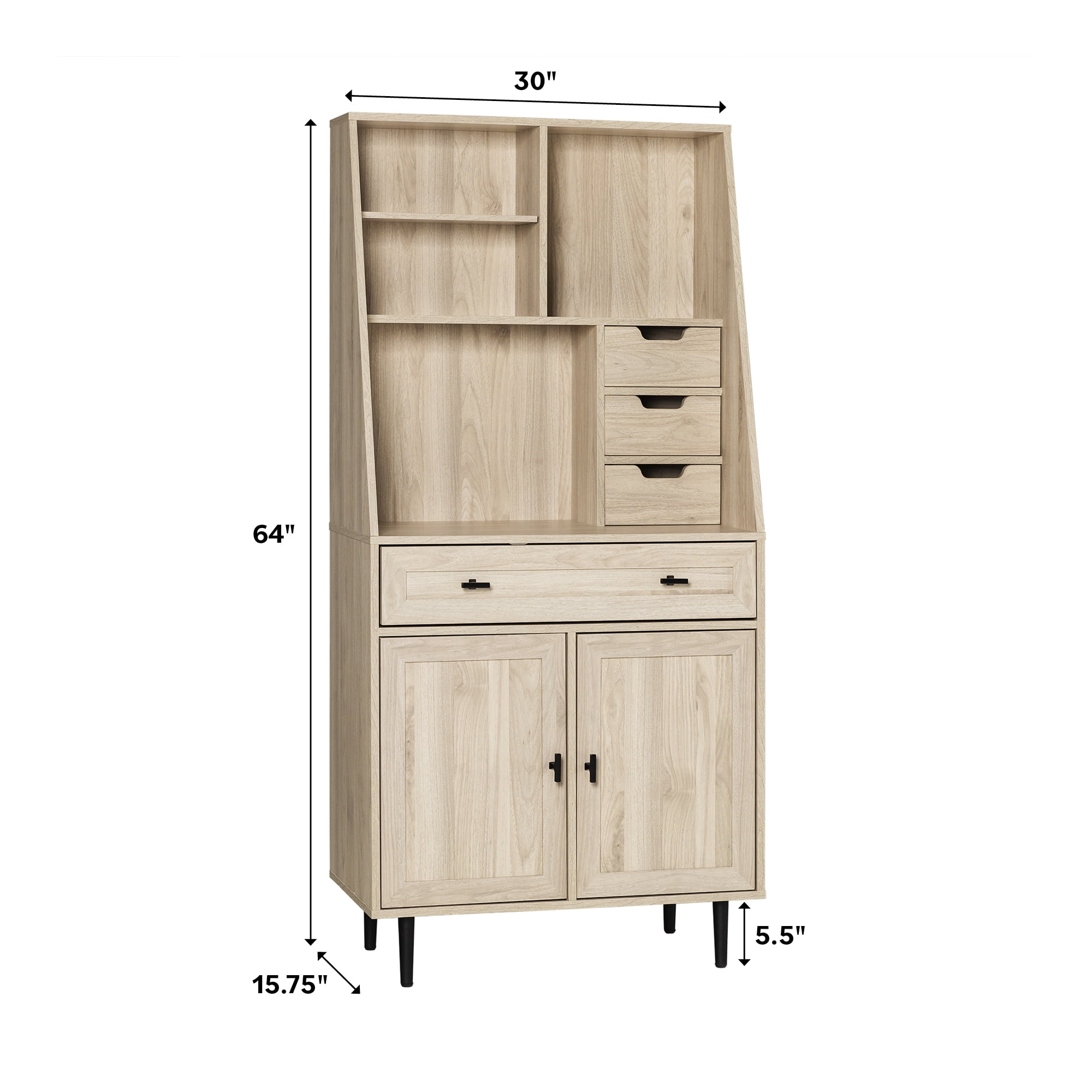 Packaged dimensions: 12″ H x 36″ L x 20″ W Assembled Dimensions: 64” H x 30” L x 15.75” W Materials: Warp resistant MDF, high quality laminate, and powder coated steel Assembly: Some assembly required Birch wood finish Adjustable metal feet Drawer with telescoping metal drawer glides and drop-down drawer front Cord management options Three small wood drawers Two adjustable shelves behind doors Three fixed shelves in upper hutch Two doors with adjustable soft close metal door hinges Wall anchor for safety