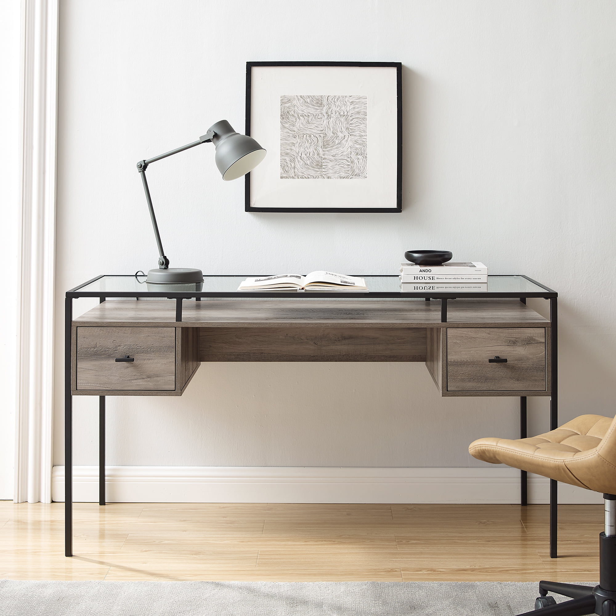 Walker Edison Carlisle Grey Wash 2-Drawer Glass Top Writing Desk