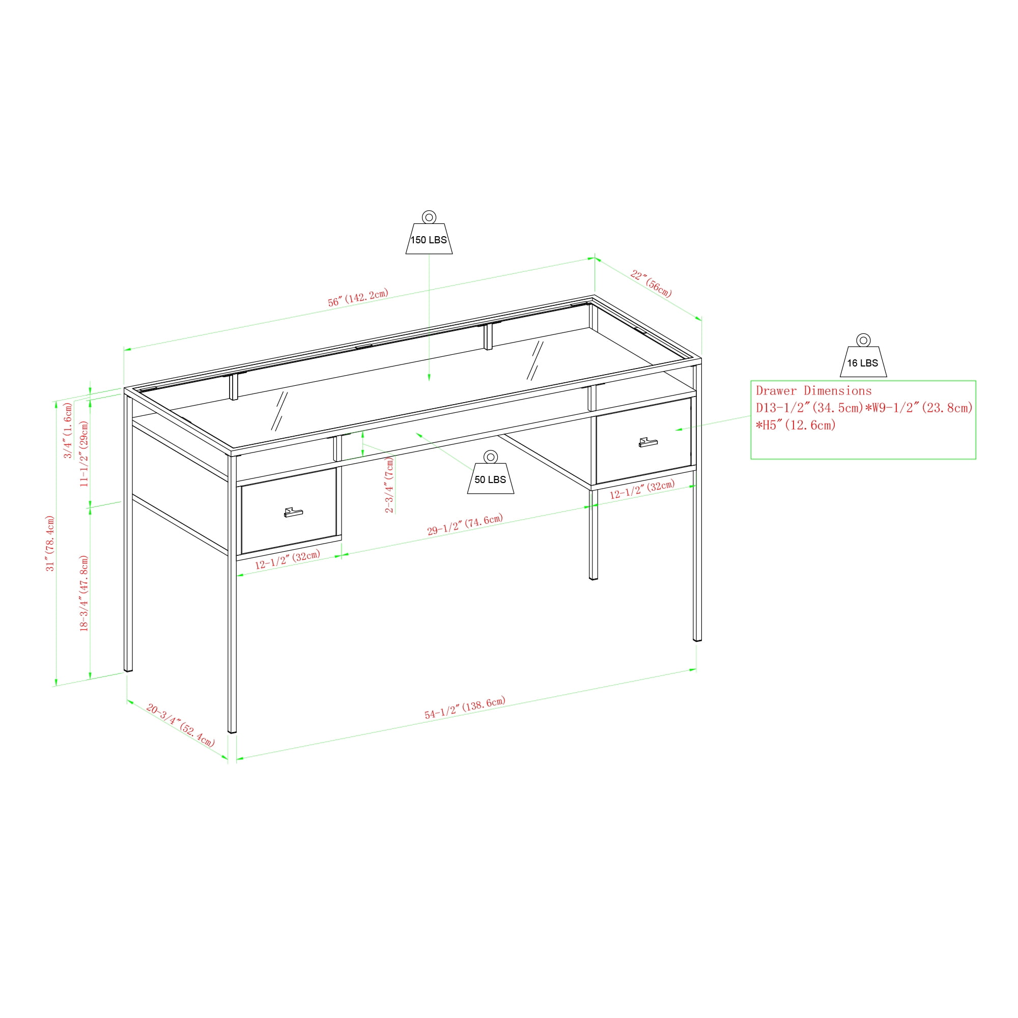 2 drawers with telescoping metal glides Lifted tempered glass table top Modern writing desk Mixed material executive desk Powder-coated metal frame and handles Ships ready-to-assemble with step-by-step instructions