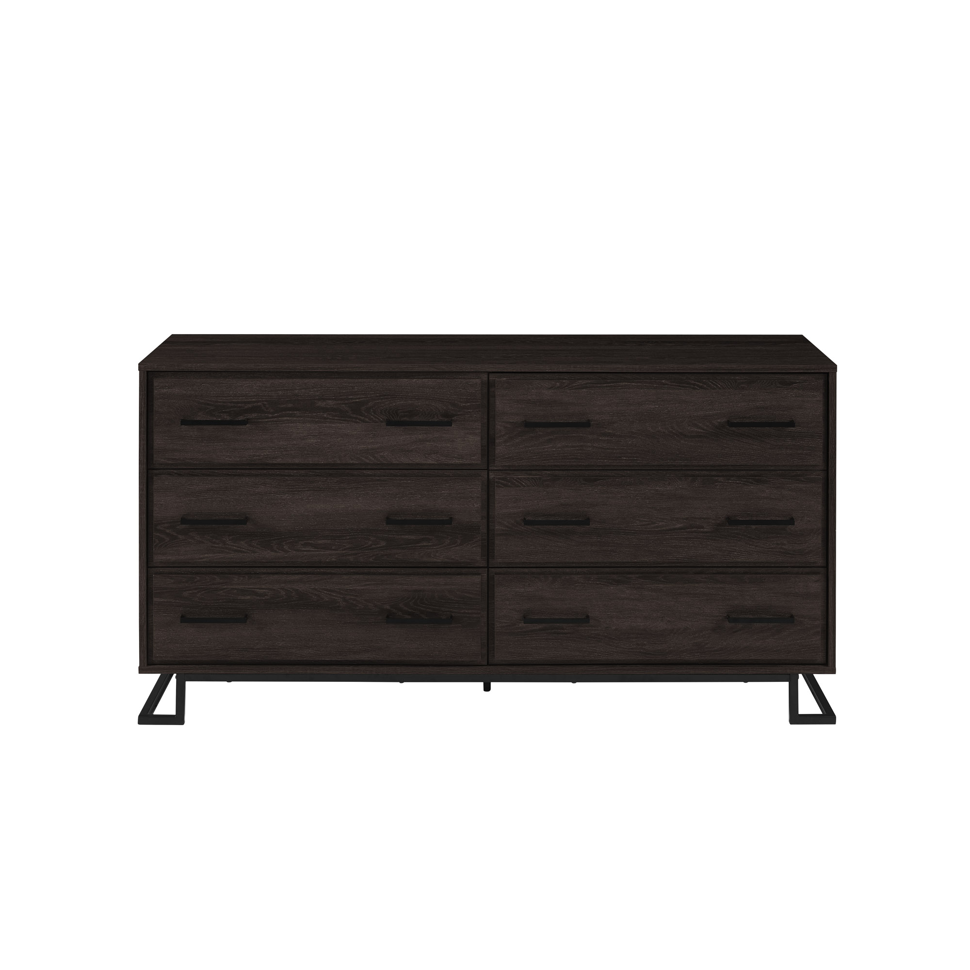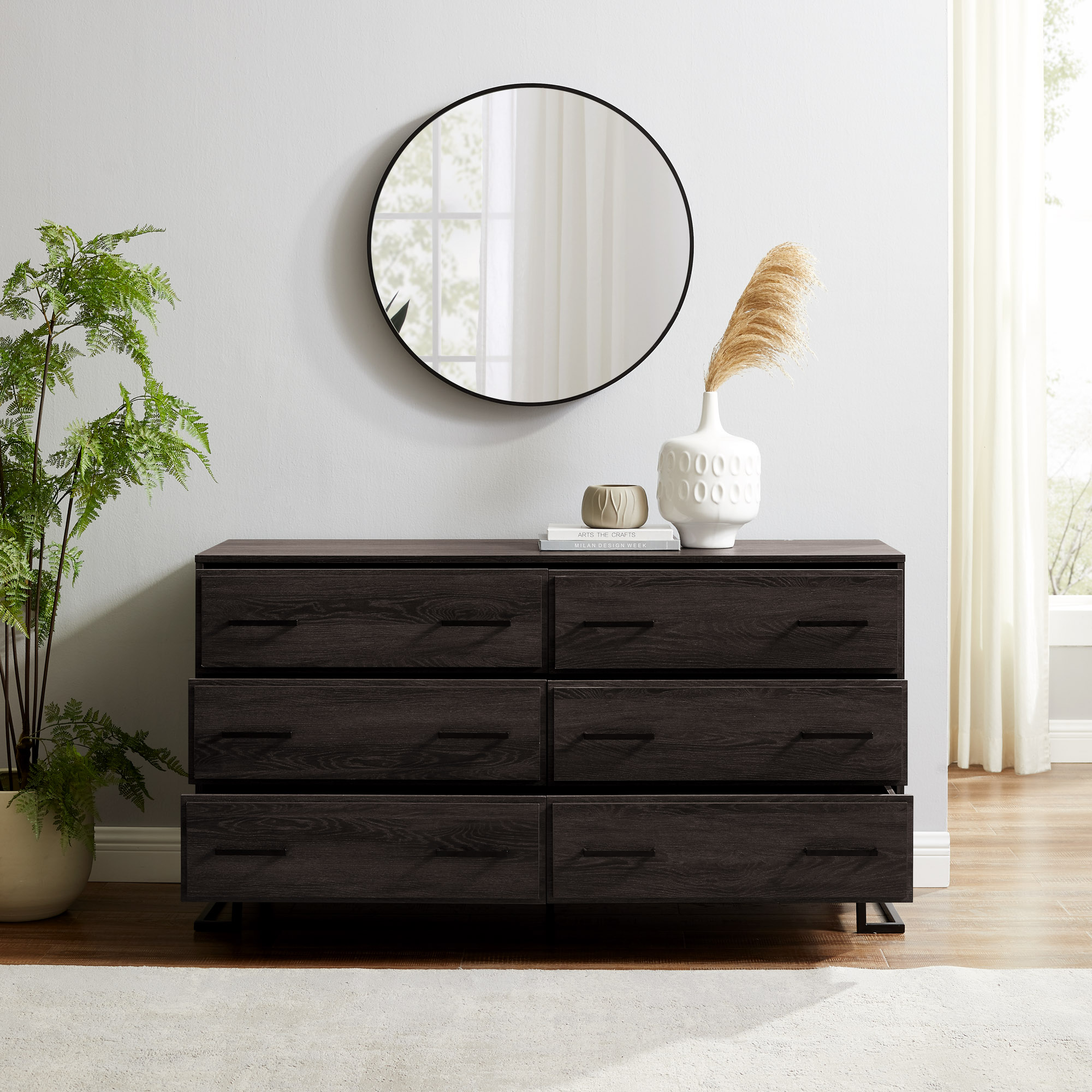 Contemporary style Charcoal Includes anti-tip kit for safe storage 6 spacious drawers with metal hardware Use in your bedroom, living room, or entryway Made from warp-resistant MDF, durable laminate, and painted steel Ships ready-to-assemble with step-by-step instructions Assembled dimensions: 30” H x 56” L x 18” W Packaged dimensions: 7.75” H x 69.125” L x 23.25” W