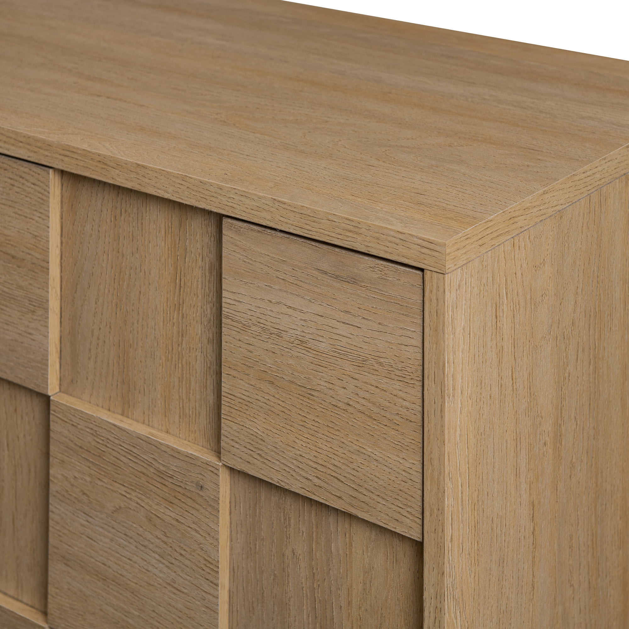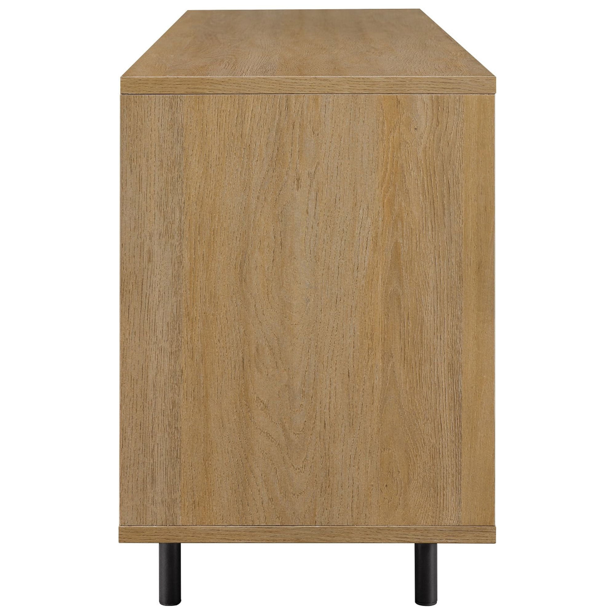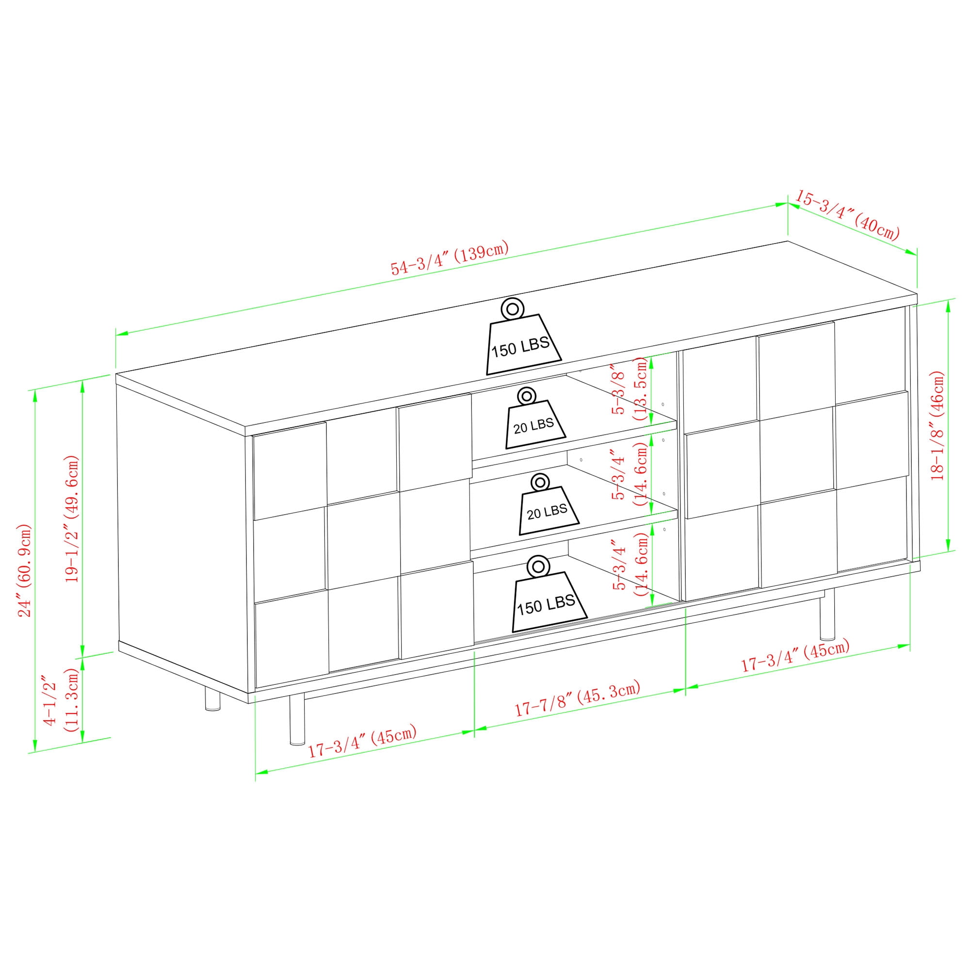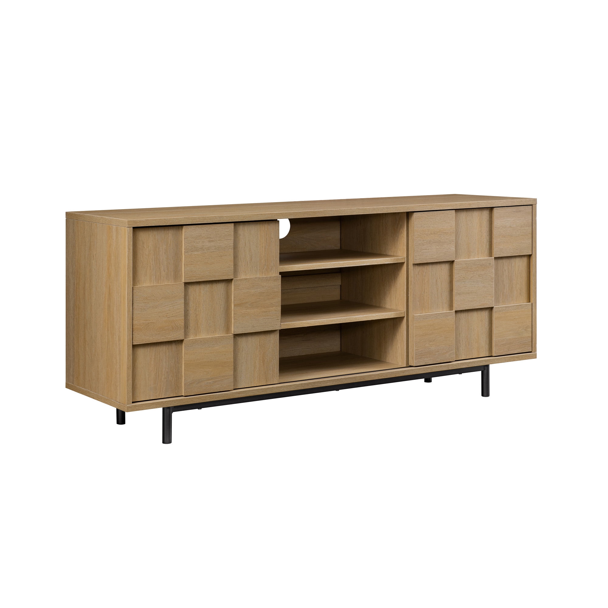 Contemporary style Coastal oak finish Featuring checkboard paneling on front of doors Adjustable shelves for a customizable storage solution Cord management ports for tidy tech L-shaped, rectangular legs Versatile design that fits in with contemporary, modern, and mid-century modern homes Made from warp-resistant MDF wood, durable laminate, and painted metal Ships ready-to-assemble with step-by-step instructions Assembled dimensions: 24” H x 55” L x 17” W Packaged dimensions: 7″ H x 60″ L x 21″ W