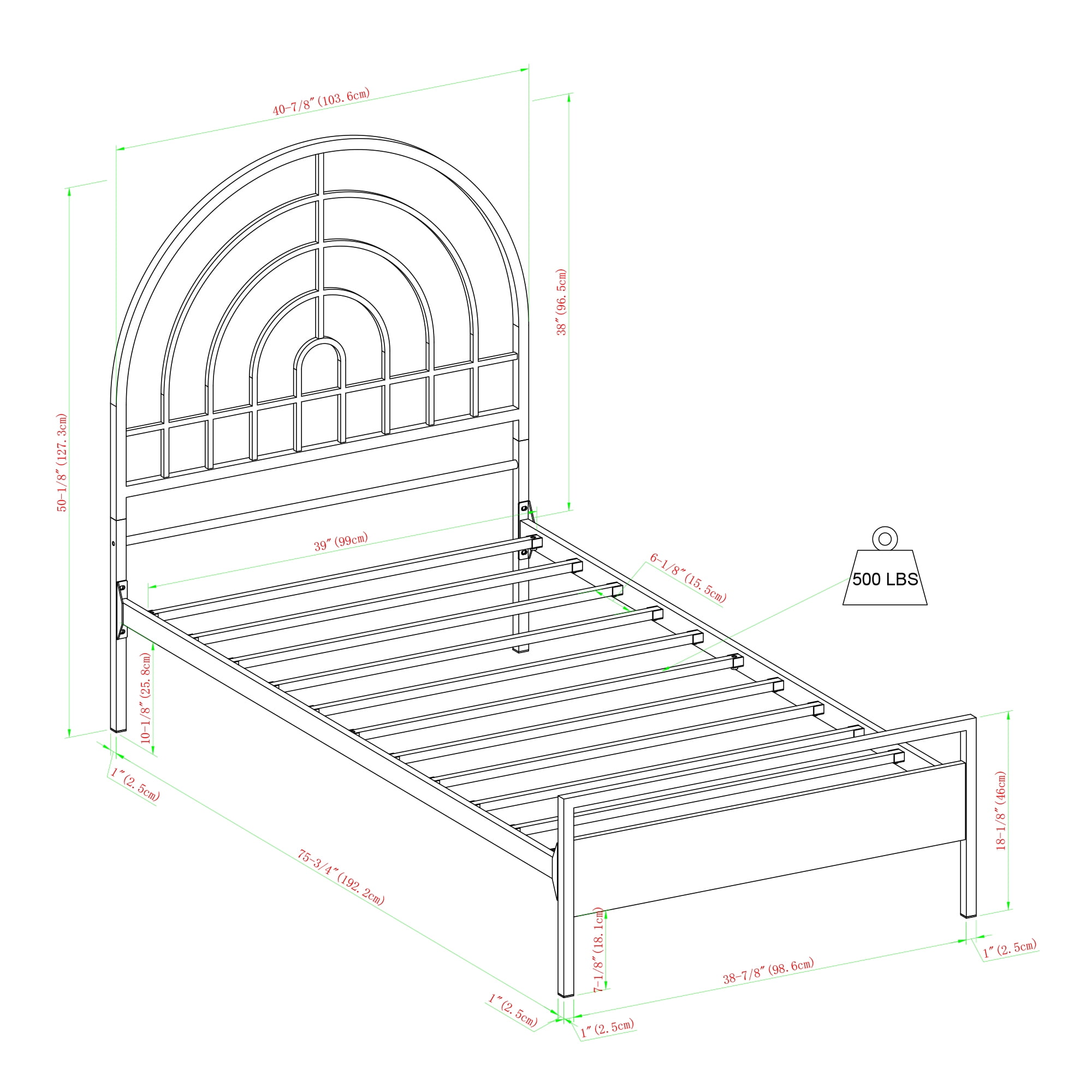 Contemporary style White finish Unique metal arch detailing Ideal for apartments or small-space living Versatile design that works well with bohemian, mid-century modern, and contemporary aesthetics Mattress not included Made from powder-coated steel Ships ready-to-assemble with step-by-step instructions Assembled dimensions: 50” H x 40” L x 78” W Packaged dimensions: 4″ H x 79″ L x 35″ W