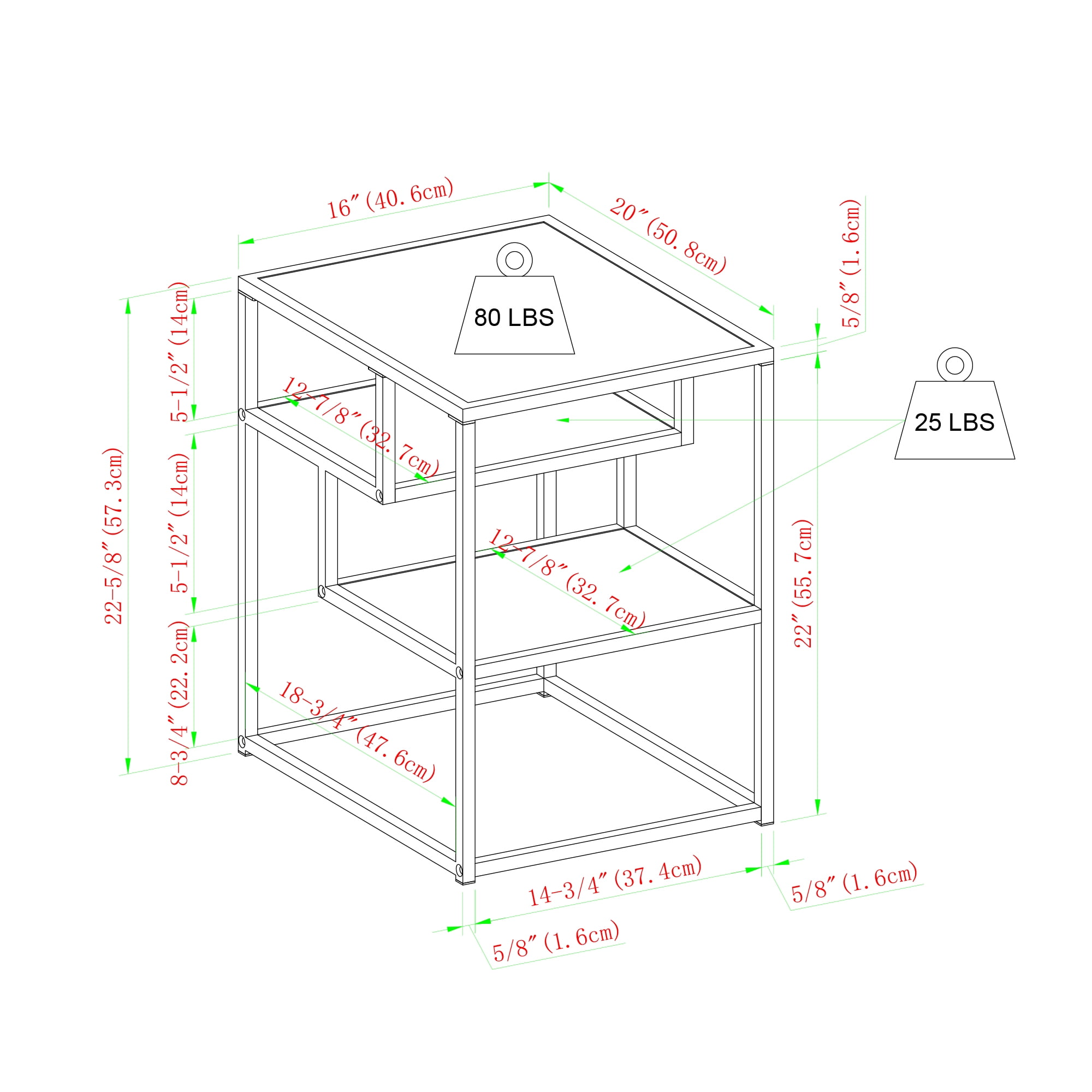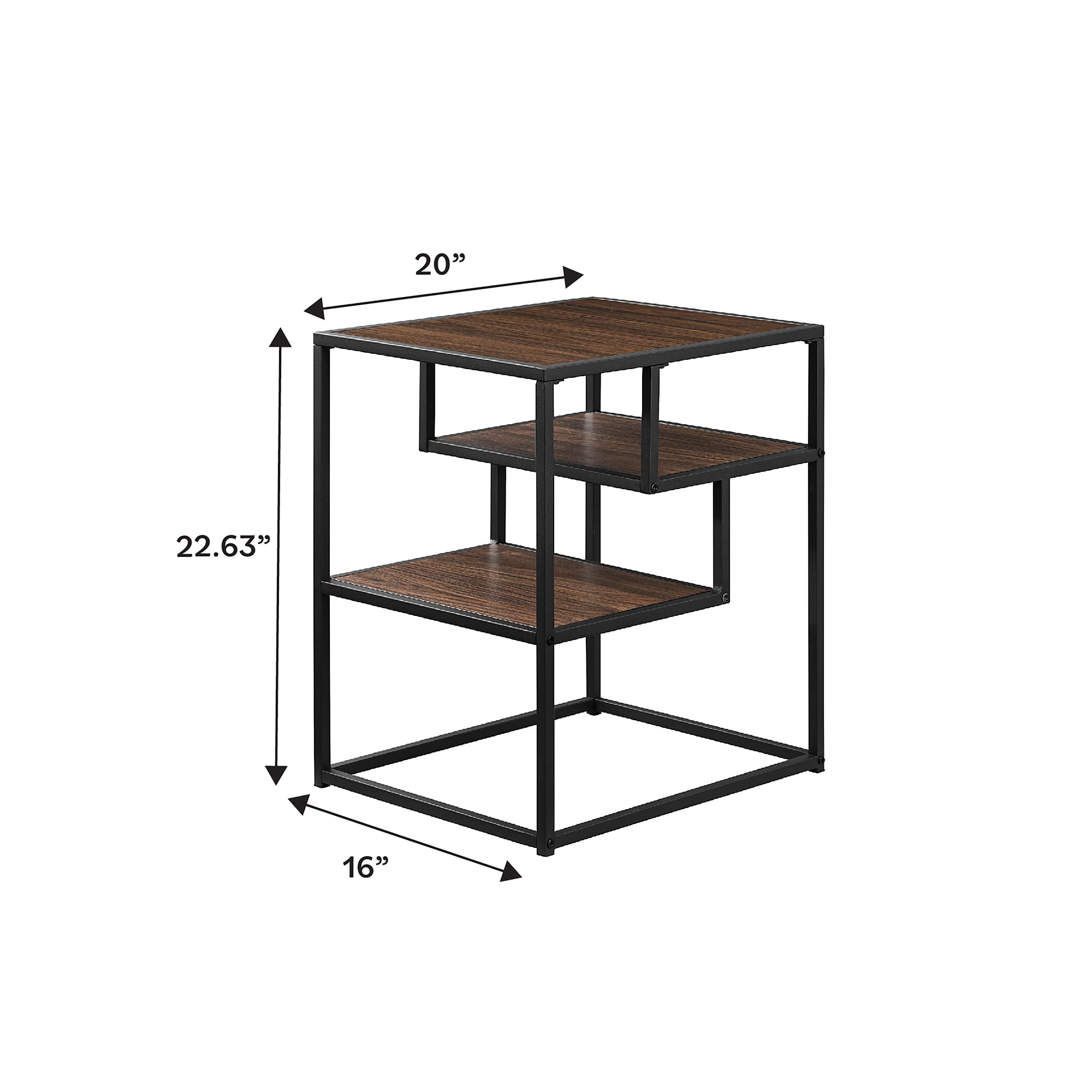 Contemporary style Dark walnut finish Featuring three tiers for open storage Mixed-material design for an eclectic look Works well with modern, bohemian, and urban aesthetics Perfect for any living room or bedroom Made from warp-resistant MDF wood, durable laminate, powder-coated steel Ships ready-to-assemble with step-by-step instructions Assembled dimensions: 23” H x 16” L x 20” W Packaged dimensions: 5″ H x 26″ L x 23″ W