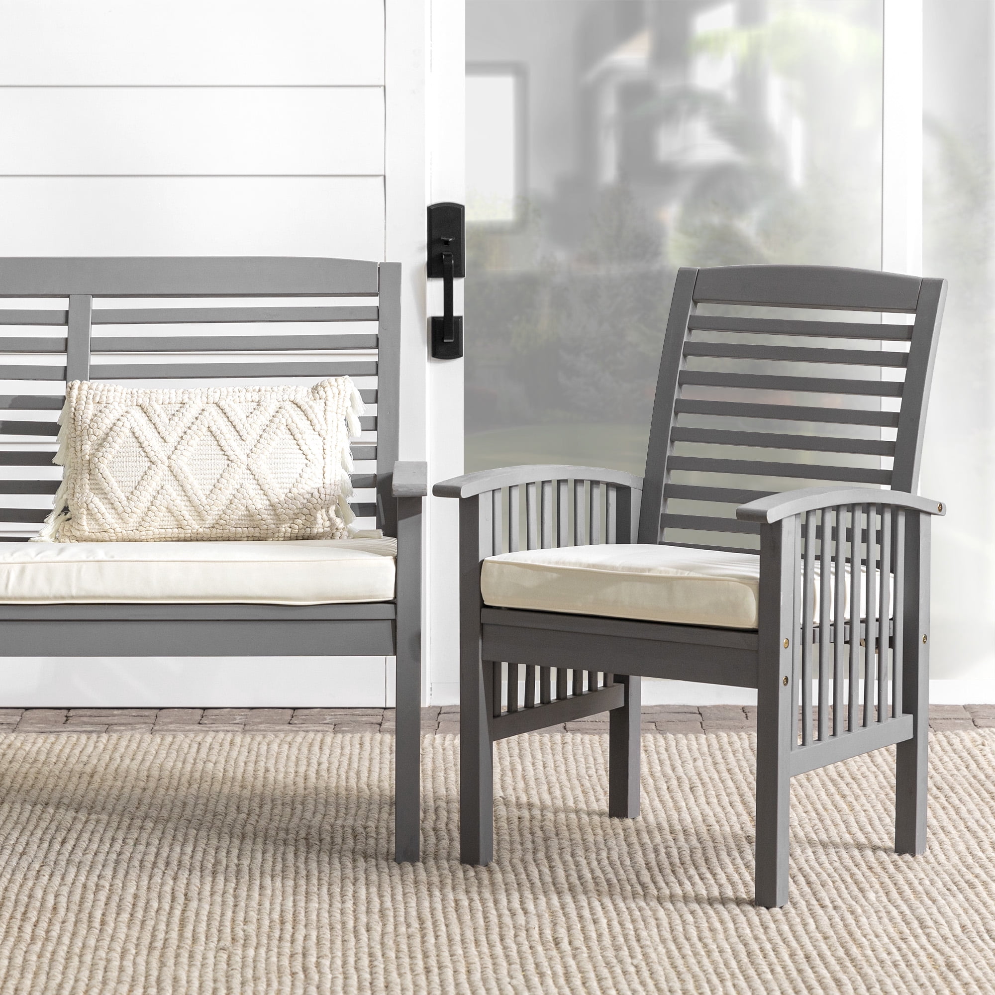 Gather the neighbors around the Daffodil Modern Outdoor Grey Wash 3 Piece Chair Set by Walker Edison for engaging conversation on a warm summer night. The plush cushions of the two chairs and loveseat present the perfect resting place after a long day of yard work or playing in the sun. Slatted backrests and arms provide a natural, boho ambiance for a truly relaxing backyard setup. And you don’t have to worry about finding a new set anytime soon because the weather-resistant solid acacia build will last for many years to come. Just make sure to add teak oil when needed and keep out of extreme temperature for the longest use.