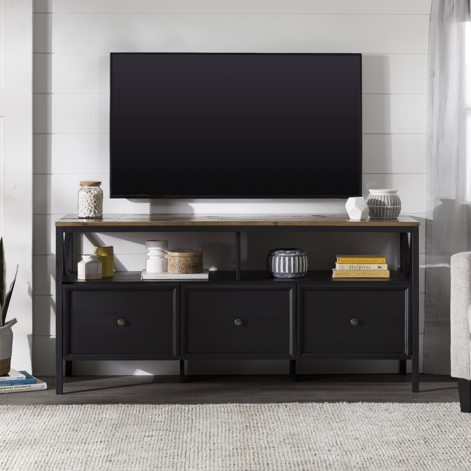 Walker Edison Farmhouse 3 Drawer 60″ TV Stand, Rustic Oak/Black
