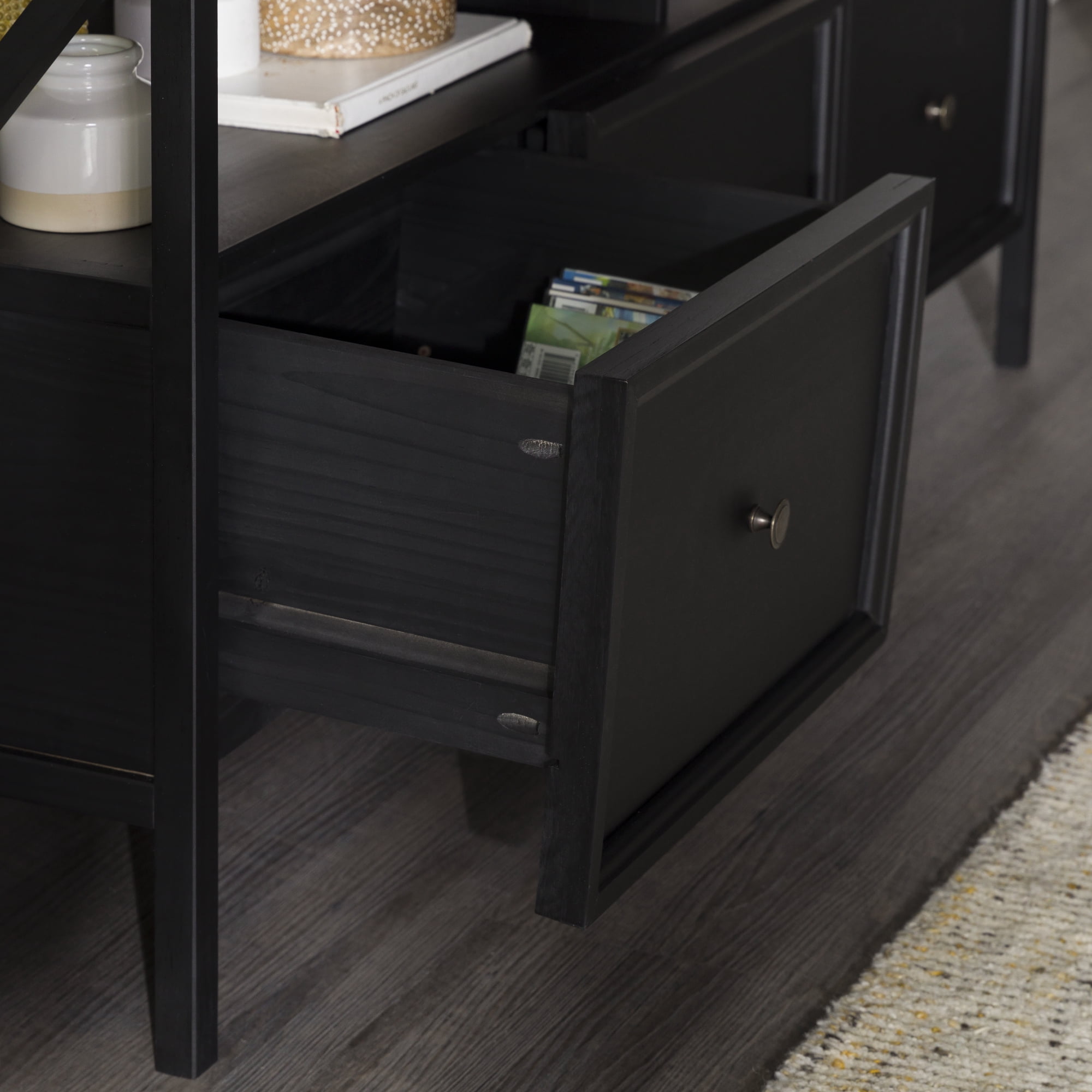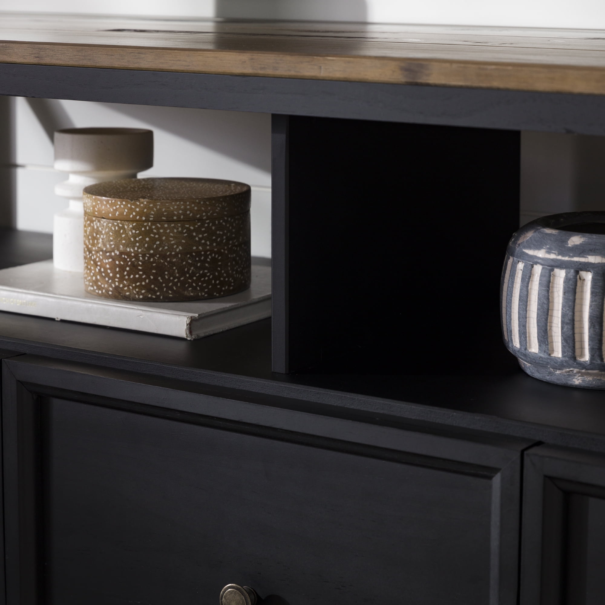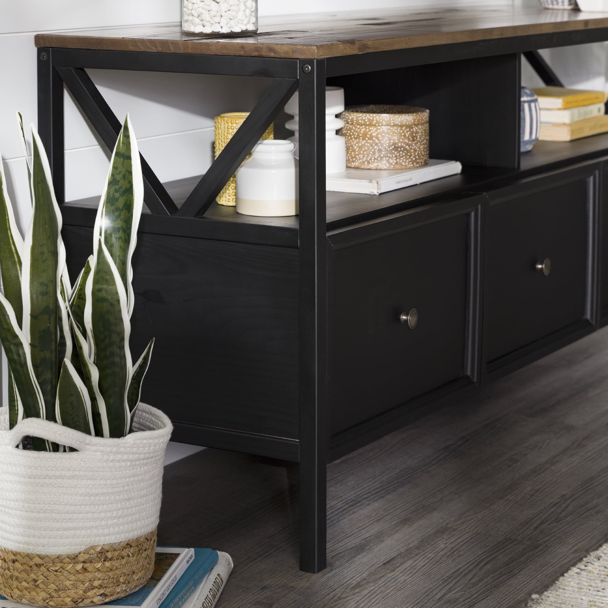 Implement a sense of family in your home with signs of “Gather” and “Live, Laugh, Love” displayed on this farmhouse TV stand by Walker Edison. The attractive side V accents add an extra rustic touch to the two-tone design. Place your TV up to 65 inches on the top and host the family for watch parties. They will love the three, easy-open, large drawers which hold games, blankets, and movies. The open display space provides the perfect spot for a sound bar, so everyone can enjoy the gatherings in your living room.