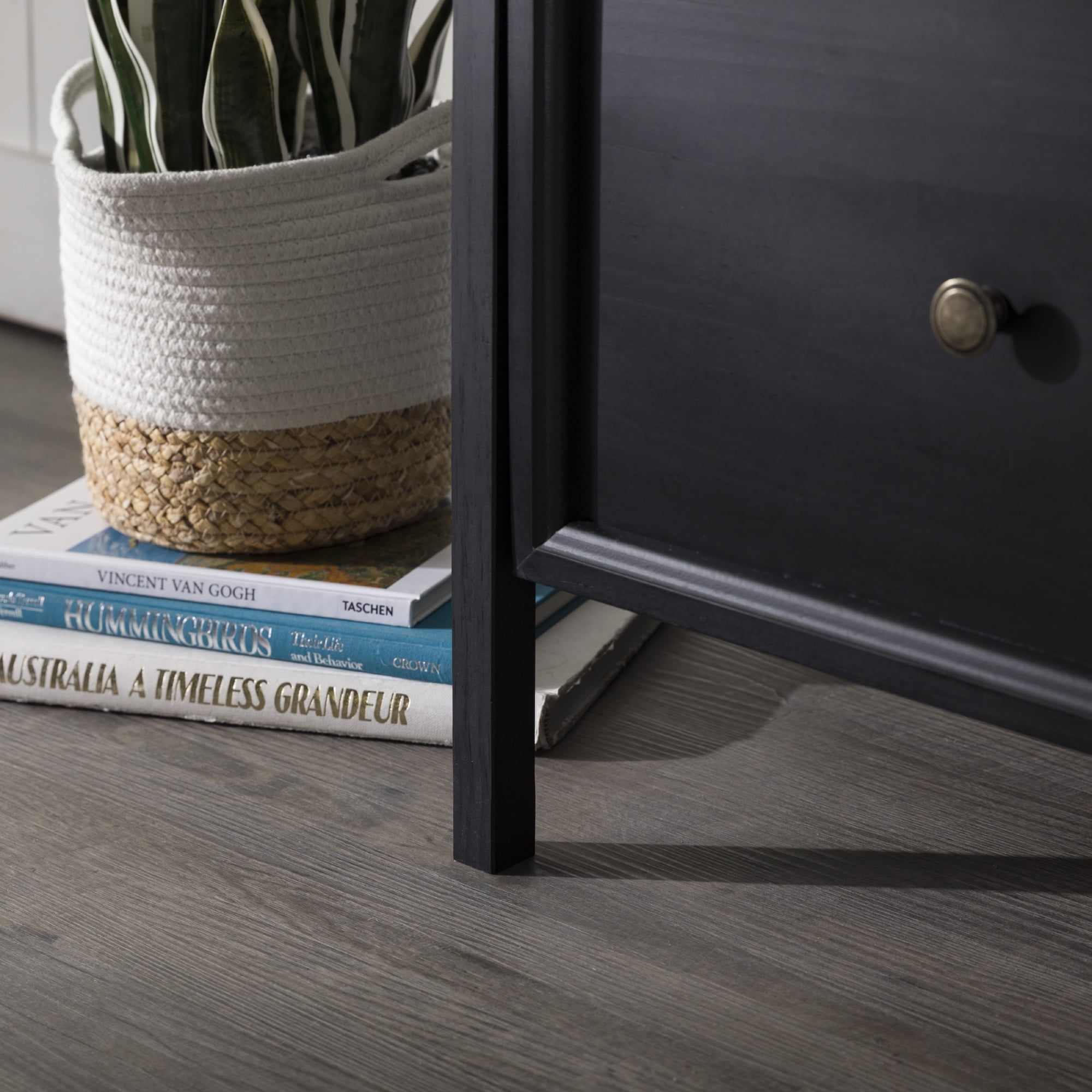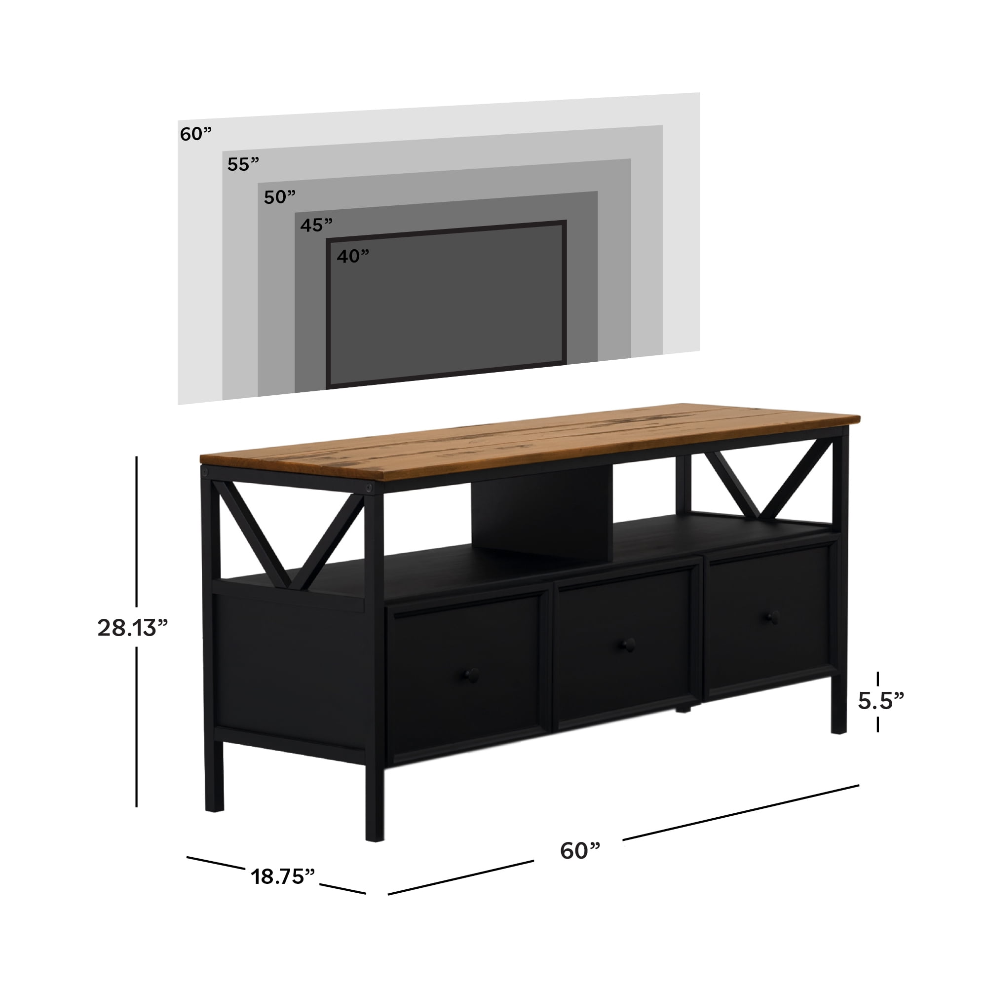 Farmhouse TV stand 4 large drawers on smooth wood runners 3 open storage cubbies compatible with a sound bar Attractive side V accents Solid pine wood frame Ships ready-to-assemble with step-by-step instructions Sleek steel hardware Two-tone design Assembled Dimensions: 28.13″ H x 60″ L x 18.75″ W 72LBS