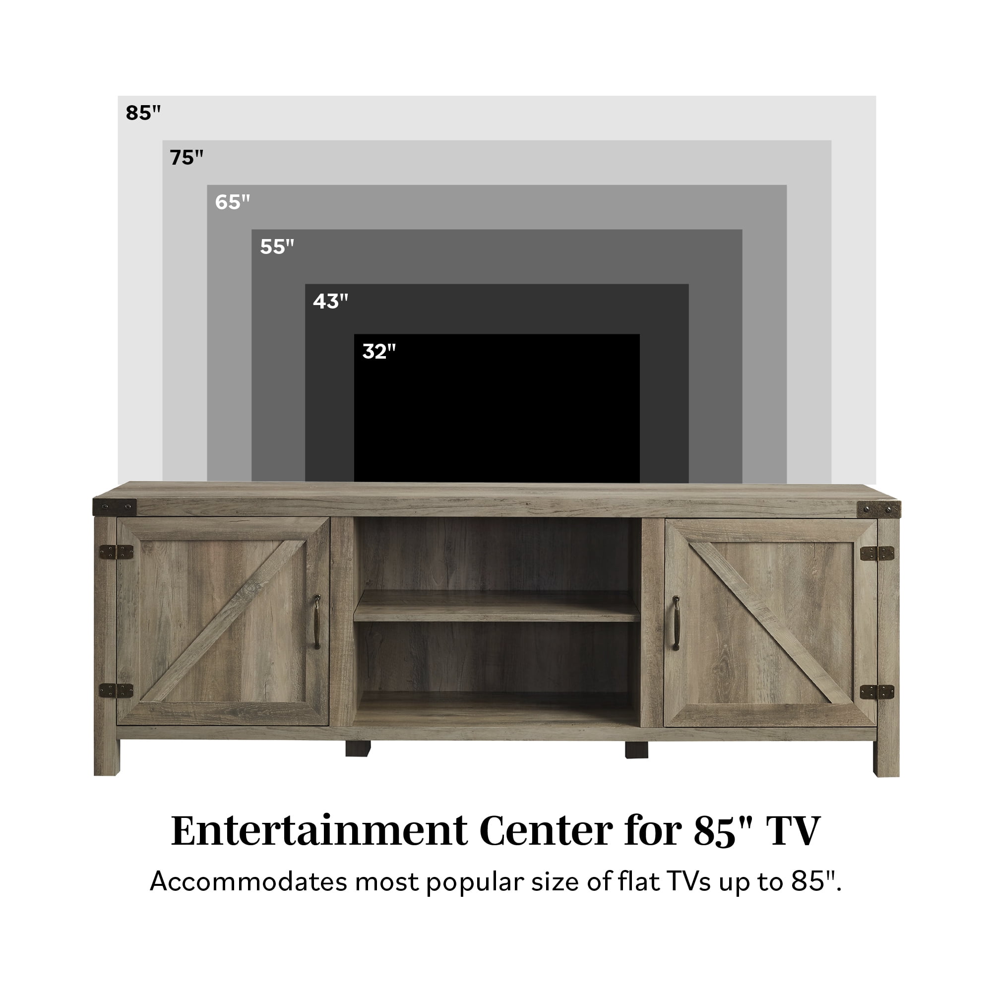 Introduce charming modern farmhouse style to your home with this Walker Edison Farmhouse Barn Door TV Stand. Constructed using high-grade MDF, durable laminate with gorgeous wood grain detailing, and metal accents on the hinges and handles, this entertainment center exudes a rustic and traditional appeal. It features barn door cabinet doors, open and closed storage, and adjustable shelving for overall stylish functionality. Hideaway your books, remotes, DVDs, and more behind the side cabinet doors and keep your electronics on the open shelving for easy access to all. The cord management helps keep electronic wires organized. Use in your bedroom as a storage console, in your living room as a TV stand to hold up to an 80-inch TV, or as a buffet table in your dining room for décor and extra kitchenware. This versatile Walker Edison Farmhouse Barn Door TV Stand is one you’ll enjoy for years to come! The Walker Edison collection blends rustic farmhouse style with bohemian accents perfect for any season. This collection makes it easy and affordable to brighten up any room with cozy, vibrant, quality pieces.