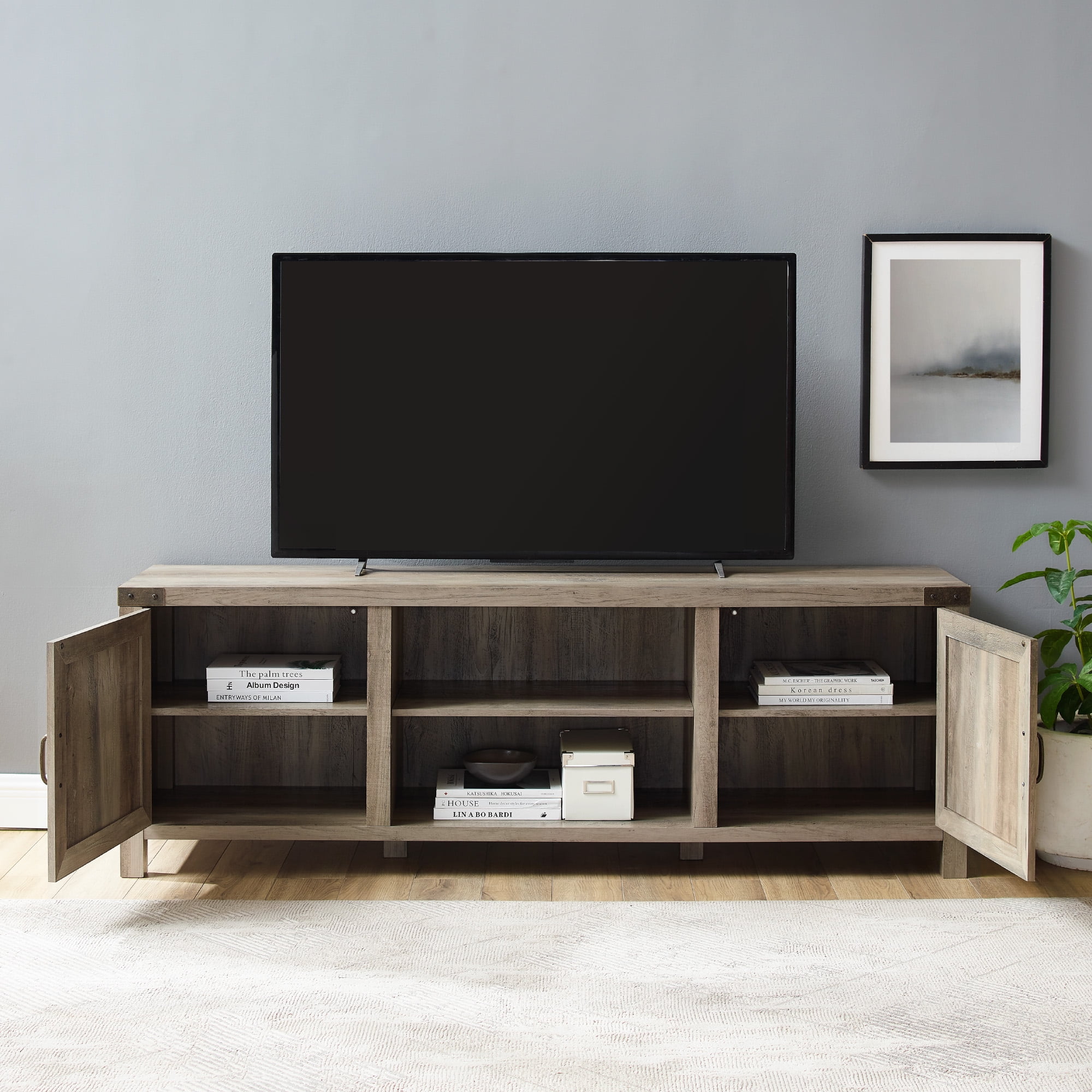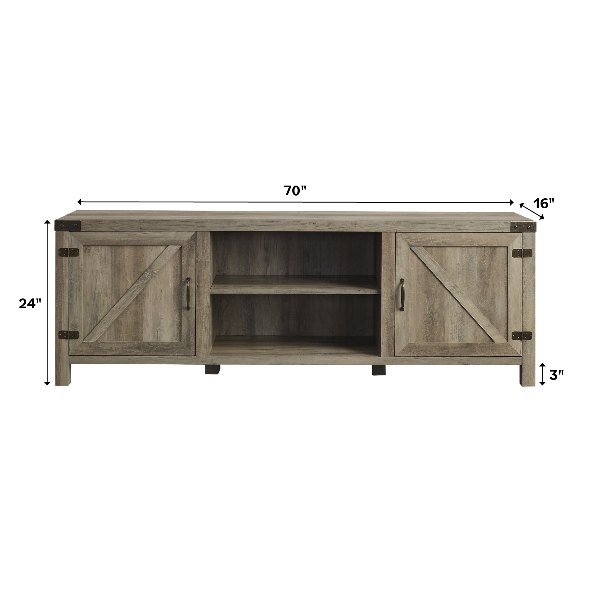 Perfect for your living room, bedroom, or home office Rustic, modern farmhouse design Barn door inspired cabinet fronts Stylish metal hinges, handles, and corners Open and closed storage with open and closed shelving space Recommended for TVs up to 80″
