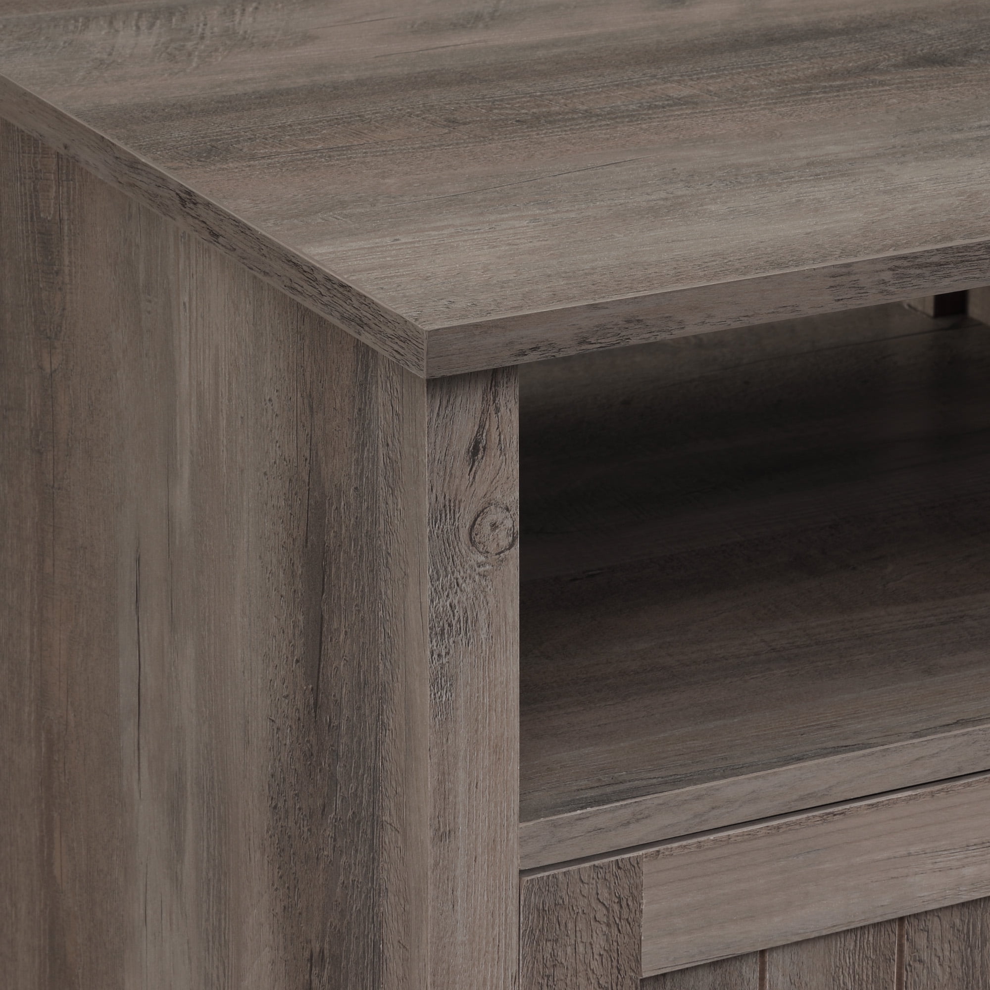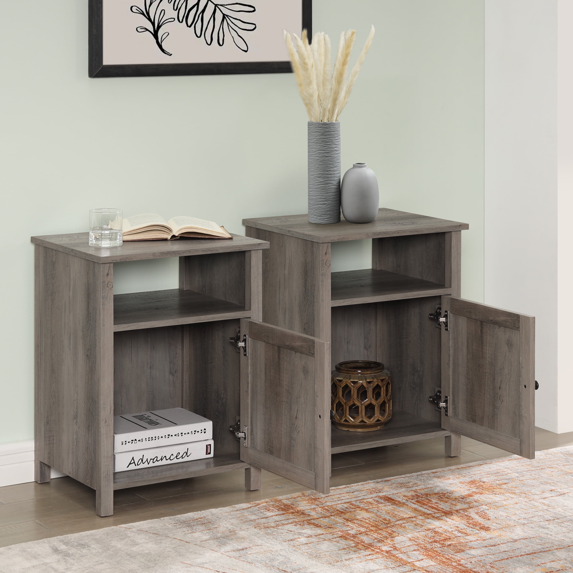Transitional farmhouse side table Grey wash finish Open storage cubby per side table 1 grooved door with adjustable soft-close hinges Materials: Warp-resistant MDF, durable laminate, and powder-coated steel Assembly required with step-by-step instructions Packaged dimensions of each piece: 5.75” H x 28.75” L x 21” W Assembled dimensions of each piece: 24” H x 18” L x 15.75” W