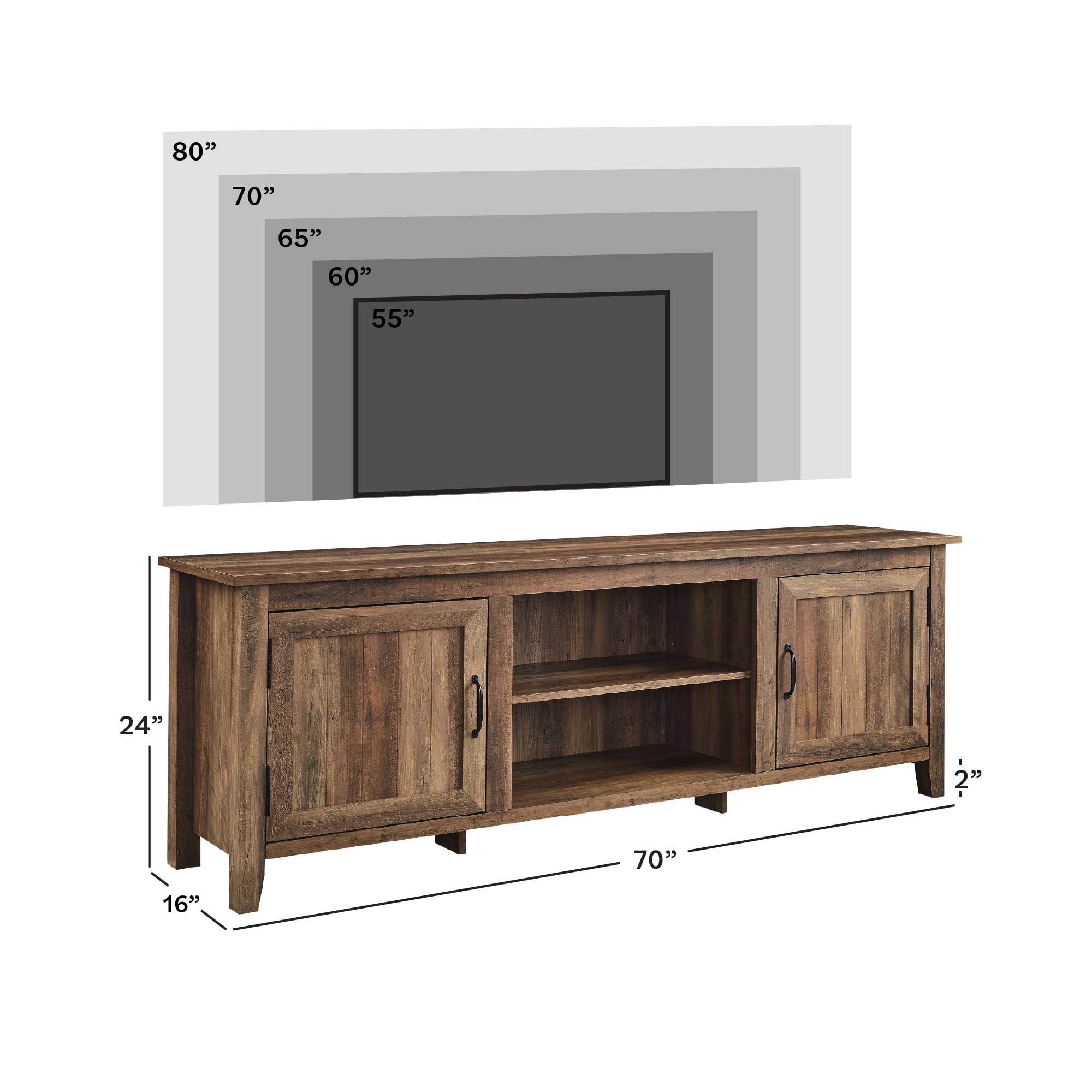 Packaged dimensions: 6″ H x 76″ L x 23″ W Assembled Dimensions: 24″ H x 70″ L x 16″ W Materials: High-grade MDF, durable laminate, and painted metal Assembly: Heavy assembly required Rustic oak finish Modern farmhouse TV stand Cord management options Exposed hinges for style 3 adjustable shelves 2 beadboard doors with sleek metal handles Center open-storage area 2 extra support feet Accommodates a TV up to 80”