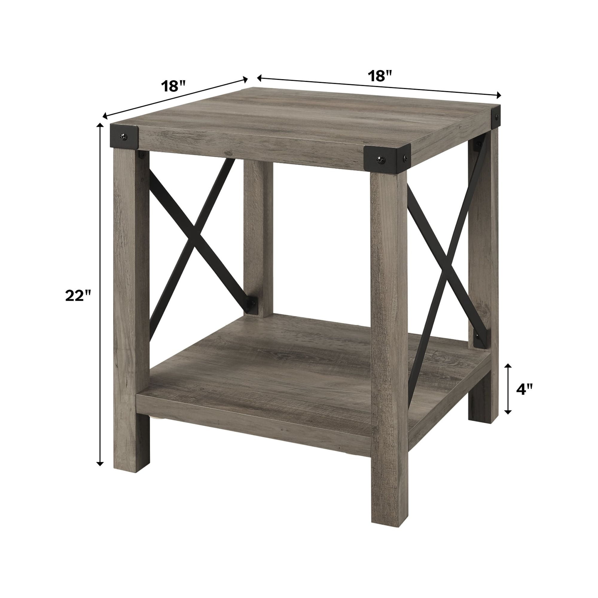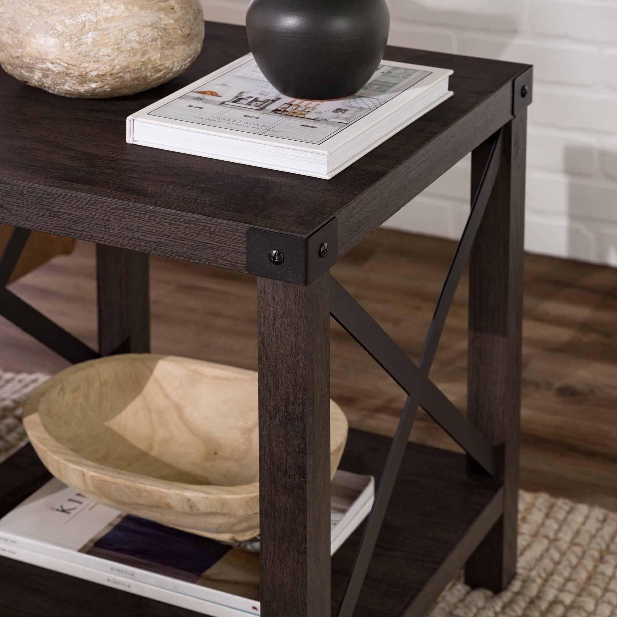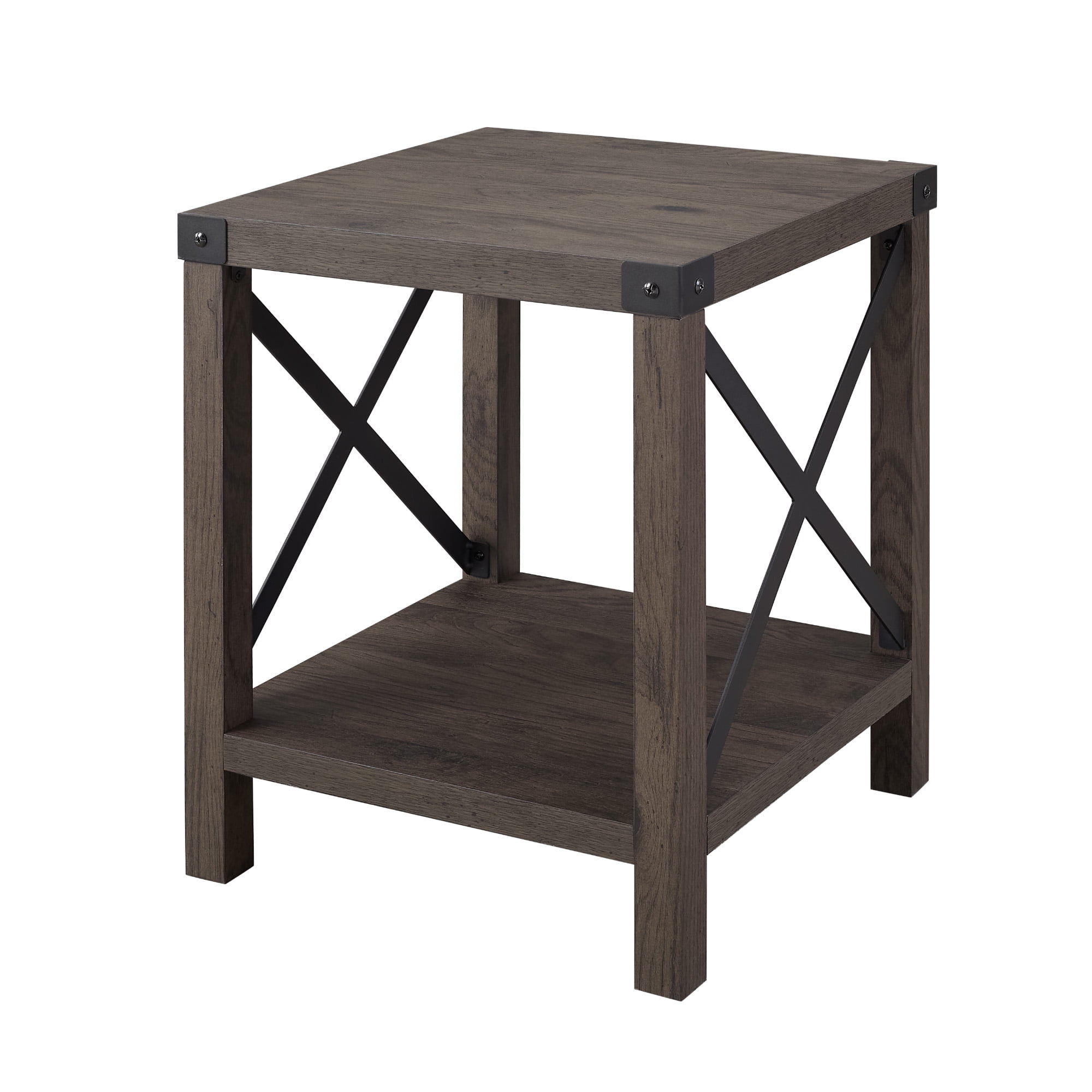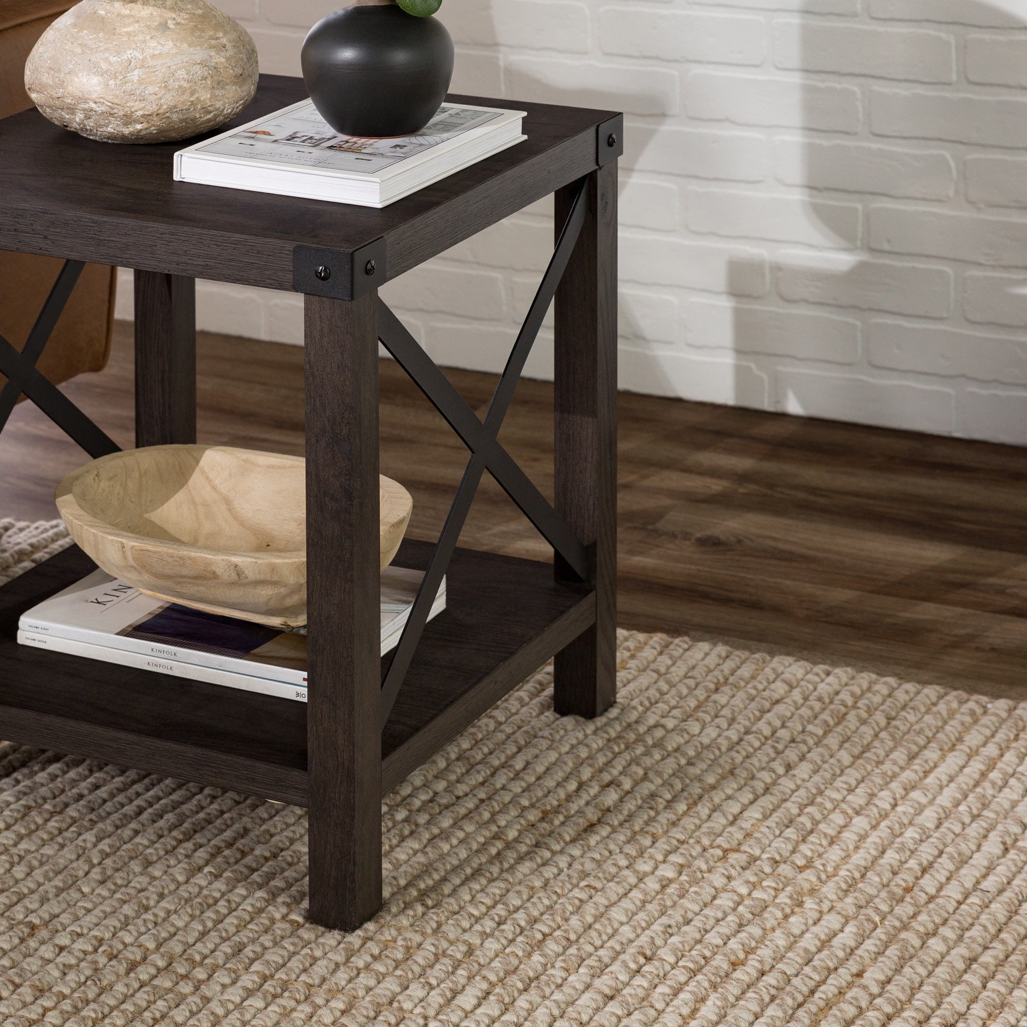 X-shaped metal accents are what make the Walker Edison Farmhouse Open Storage Side Table stand out among the rest. The black painted metal brackets on each top corner brings a sophisticated feel to the durable laminate finish. An additional shelf below the tabletop creates space for your most precious souvenirs from your many travels or easy access to frequently used items. This side table makes a great addition to living room space as an end table, bedrooms as a nightstand, or any other area where you need more table space. The rustic quality will bring character to your home and make you feel like an interior decorating pro.