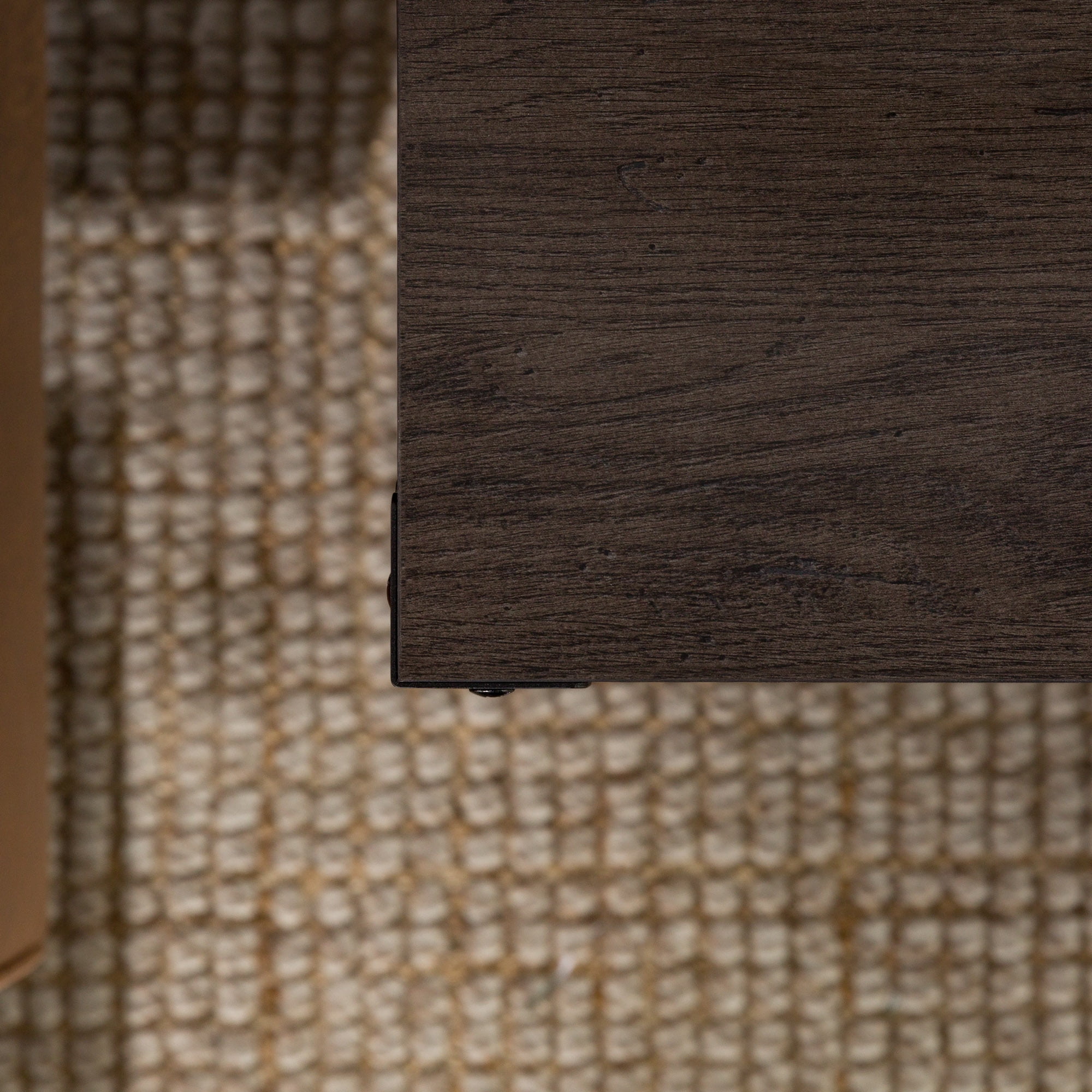 Sable finish Metal accents Lower shelf space Natural boho style Open storage space Use as end table or nightstand Packaged dimensions: 7″ H x 26″ L x 25″ W Assembled Dimensions: 22” H x 18” L x 18” W Materials: Laminate, high grade MDF, and metal Assembly: Some assembly required