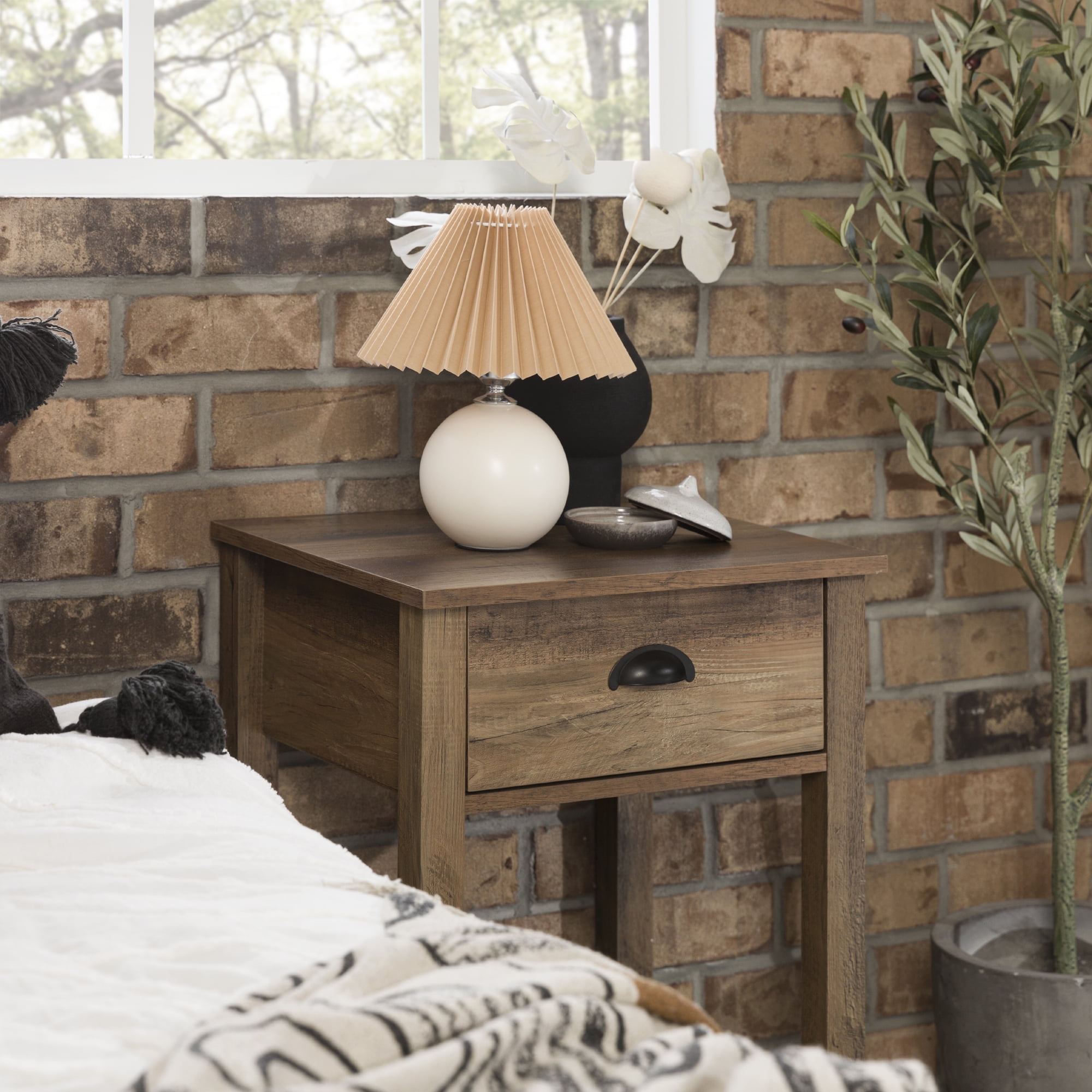 1 drawer farmhouse style end table Painted metal half circle handle Open and closed storage Lower slat style shelf Telescoping metal drawer glides Ships ready-to-assemble with step-by-step instructions