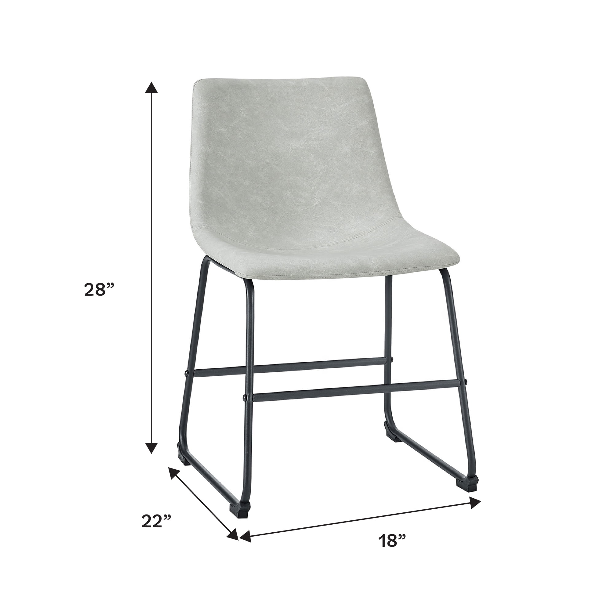 Packaged dimensions: 15″ H x 30″ L x 21″ W Assembled Dimensions: 28” H x 18” L x 22” W Seat height: 19” Seat depth: 15” Materials: Faux-leather and powder coated metal Assembly: Some assembly required Grey leather finish Industrial style dining chairs Includes two chairs Sturdy metal frame