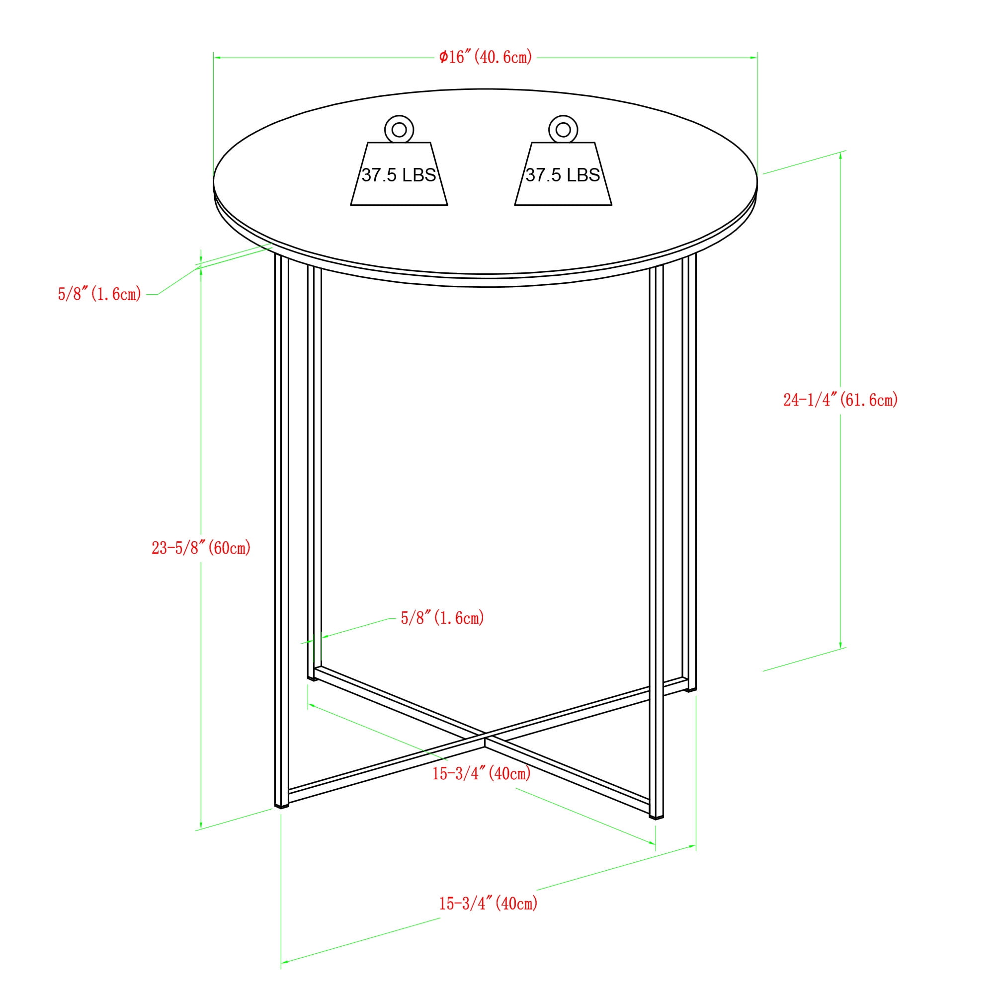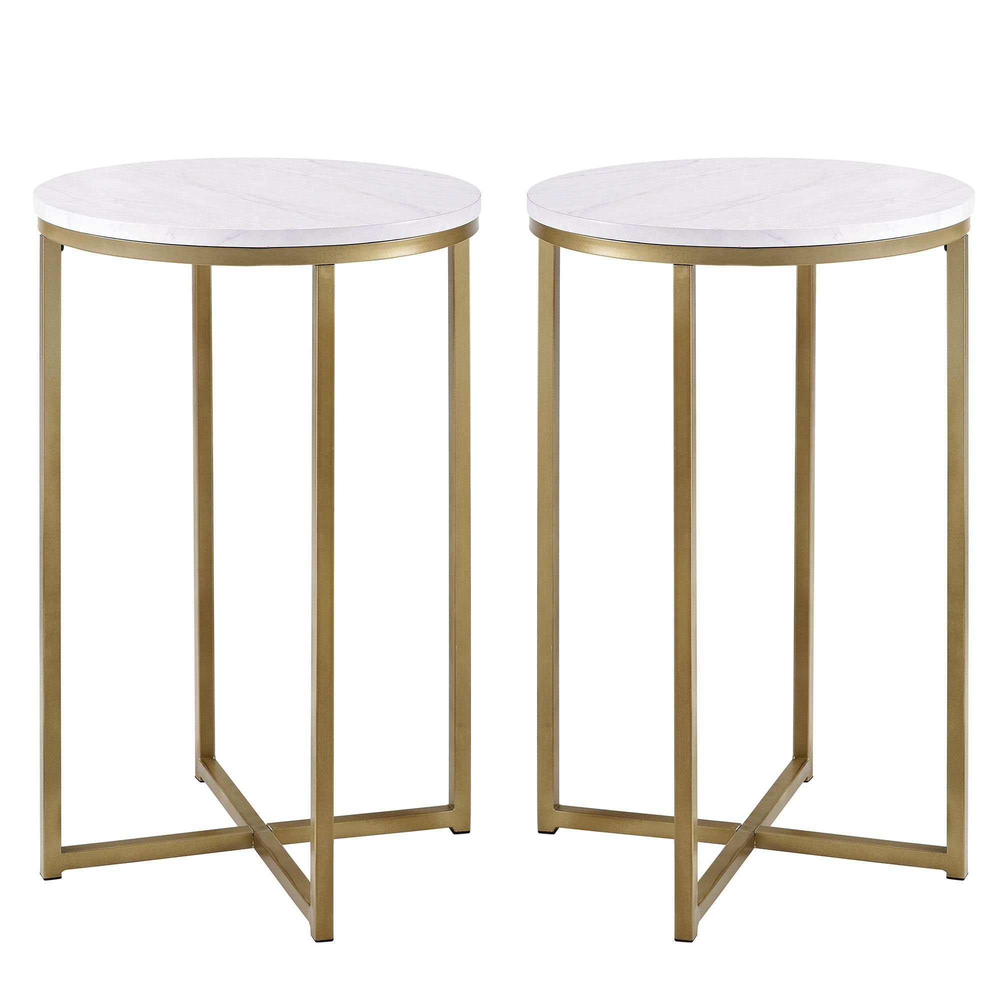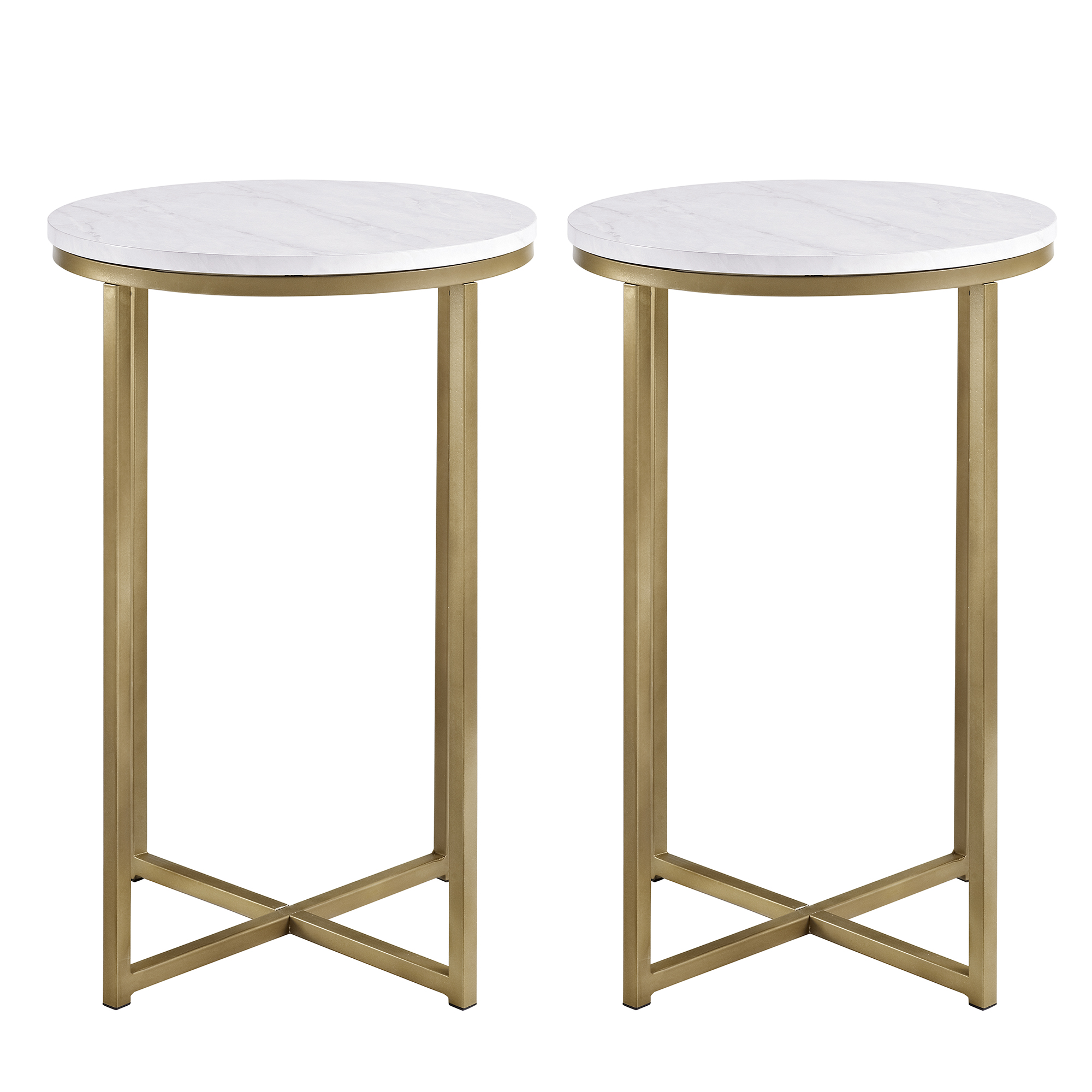 Includes 2 side tables Modern, glam style Faux white marble and gold finishes X base for stability Round tabletop Made from warp-resistant MDF wood, durable laminate, and powder-coated steel Ships ready-to-assemble with step-by-step instructions Assembled Dimensions: 24” H x 16” L x 16” W Packaged Dimensions: 4” H x 27” L x 20” W