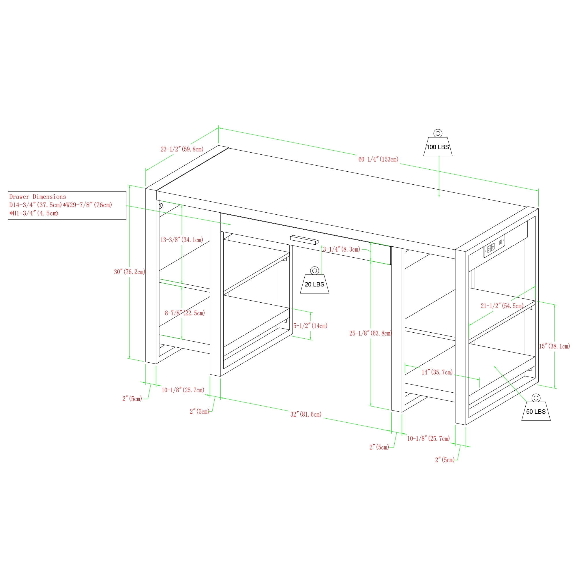 Modern urban writing desk Grey wash finish Integrated USB port and AC plug in 4 wood shelves Keyboard tray that doubles as a drawer Materials: Warp-resistant MDF, durable laminate, and powder-coated steel Assembly: Assembly required with step-by-step instructions Packaged dimensions: 9″ H x 64″ L x 27″ W Assembled Dimensions: 30” H x 60” L x 24” W