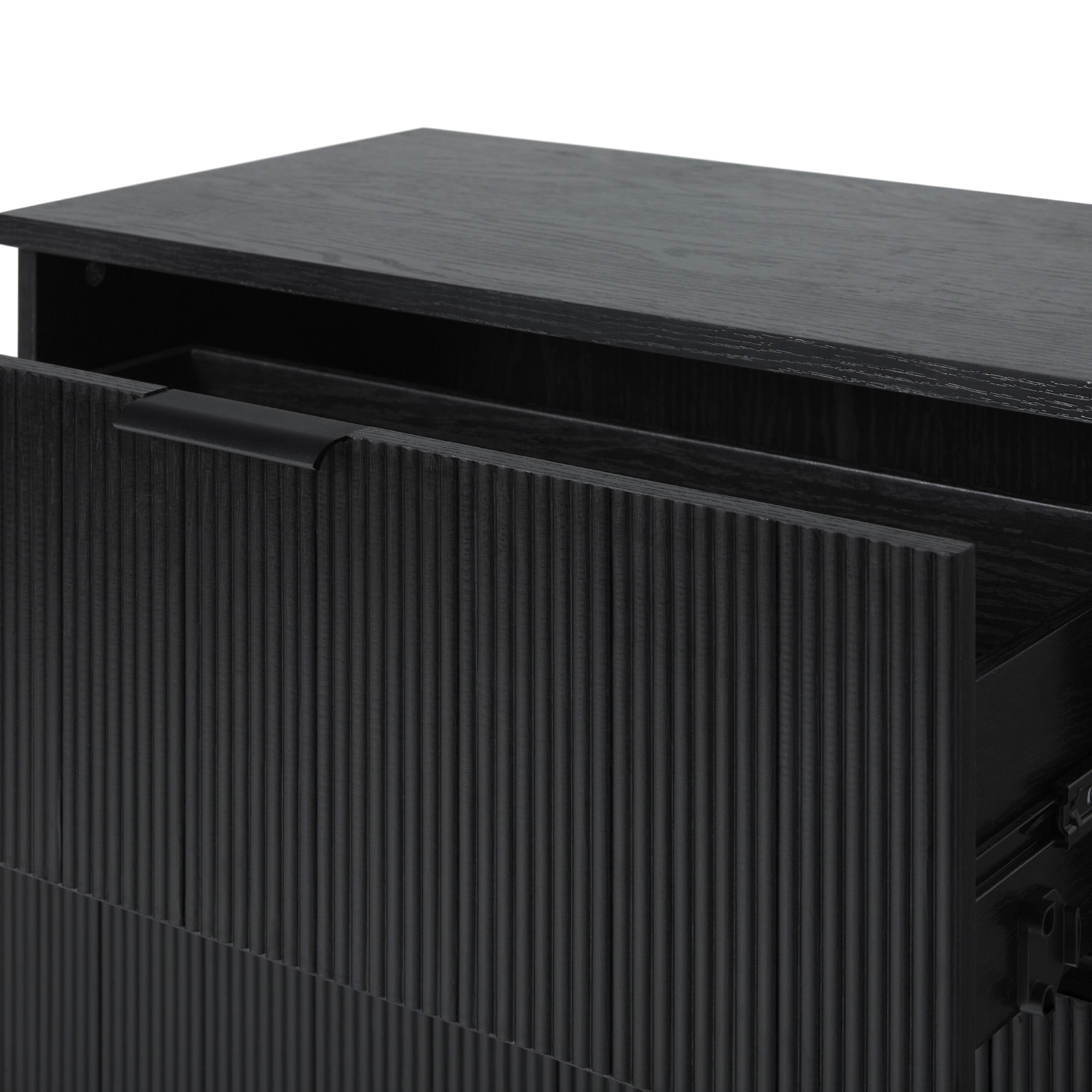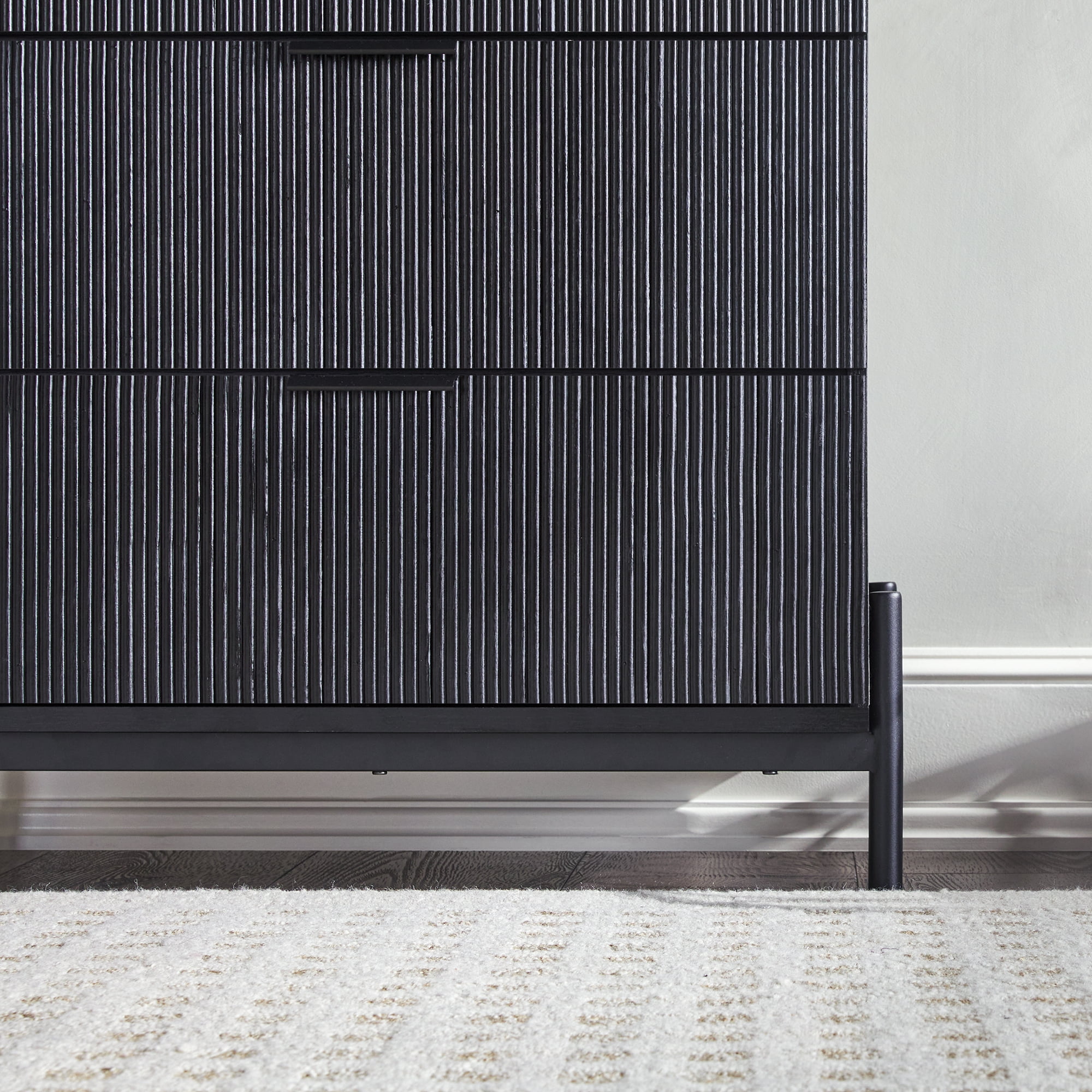 Modern/mid-century style Sleek black finish Intricate reeded wood drawer fronts Metal drawer glides Easy assembly – all drawers are the same size Made from warp-resistant MDF and durable laminate Ships ready-to-assemble with step-by-step instructions Assembled dimensions: 35 ⅜” H x 28 ⅜” L x 15 ¾” W Packaged dimensions: 12 3/4″ H x 38″ L x 20″ W