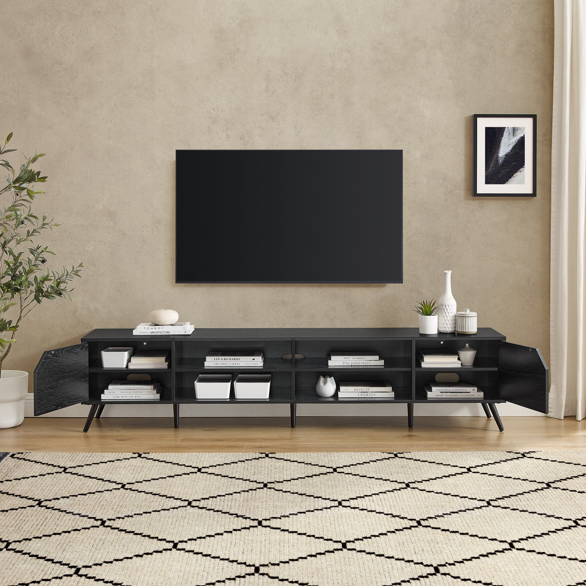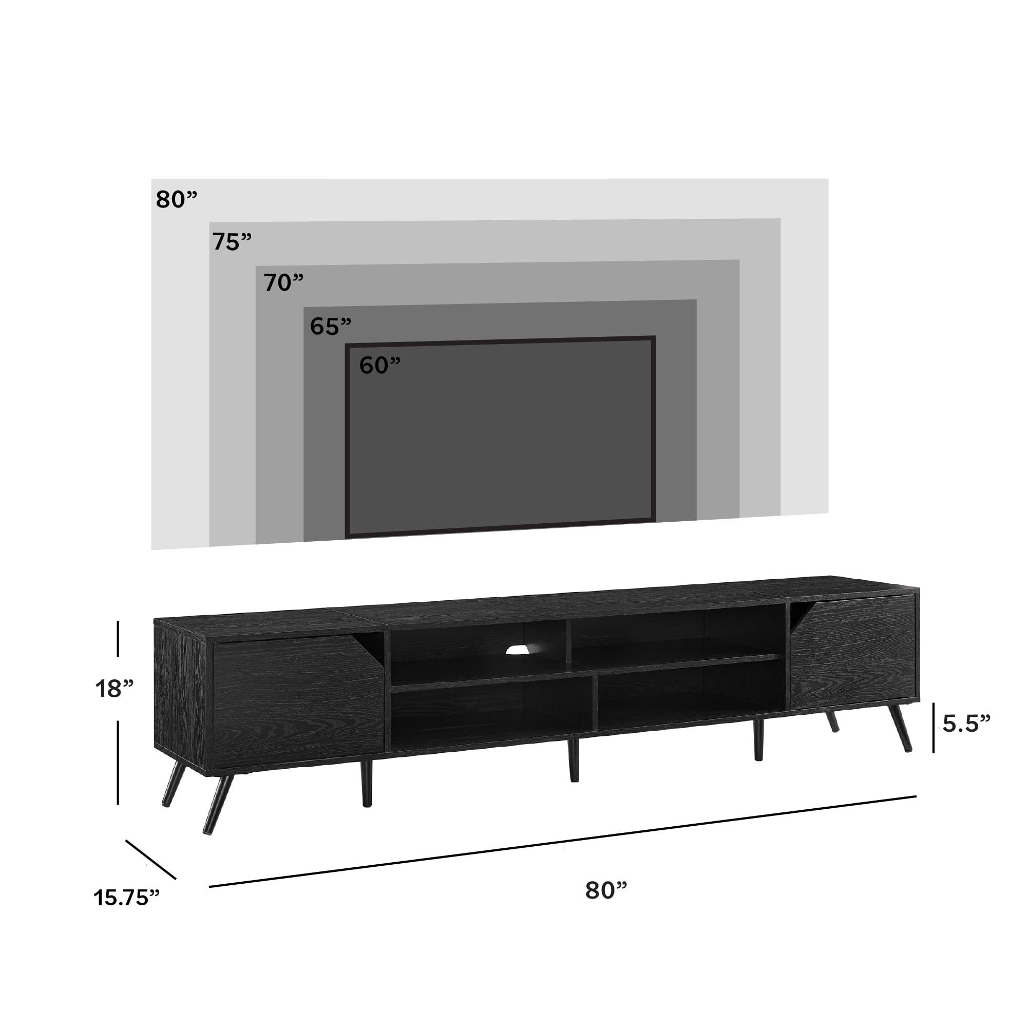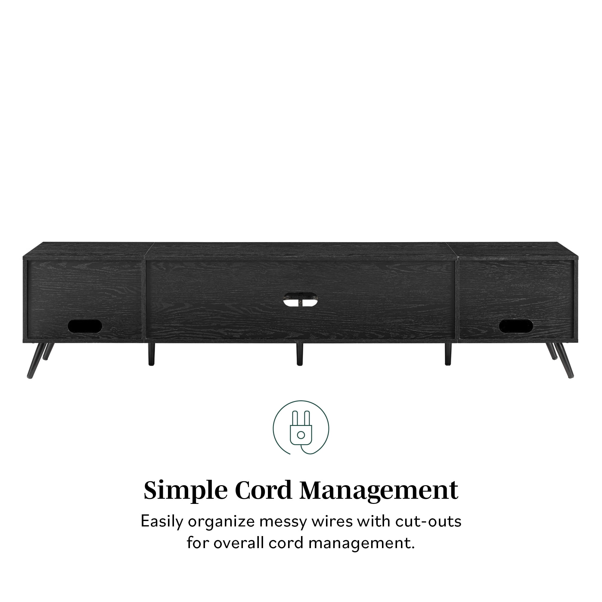 Mid-century modern style Black finish 2 closed storage compartments for an organized display Cord management ports keep tech organized 4 open cubbies offer plenty of display space Made from warp-resistant MDF and durable laminate Ships ready-to-assemble with step-by-step instructions Assembled dimensions: 18” H x 80” L x 16” W Packaged dimensions: 7.5” H x 52” L x 20” W