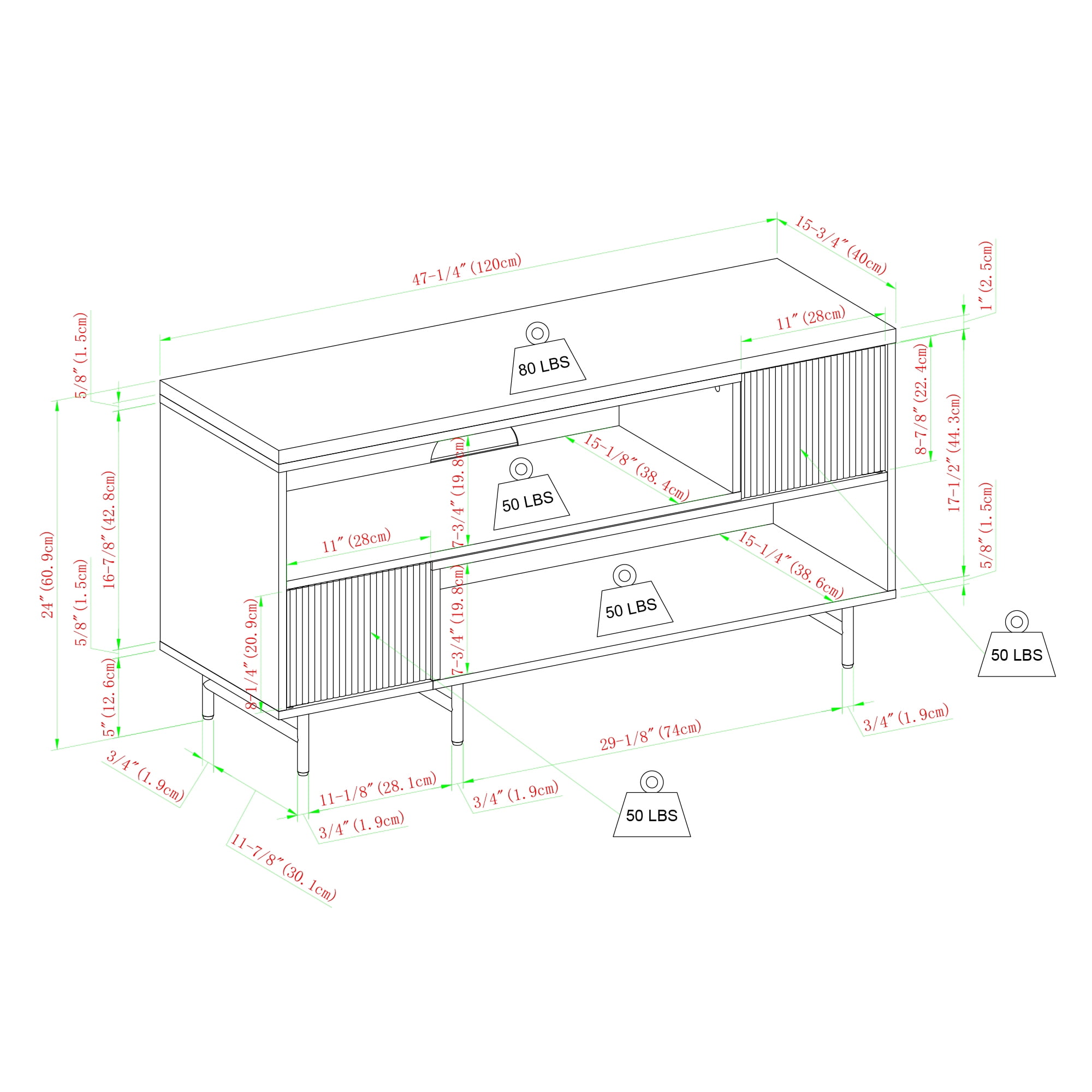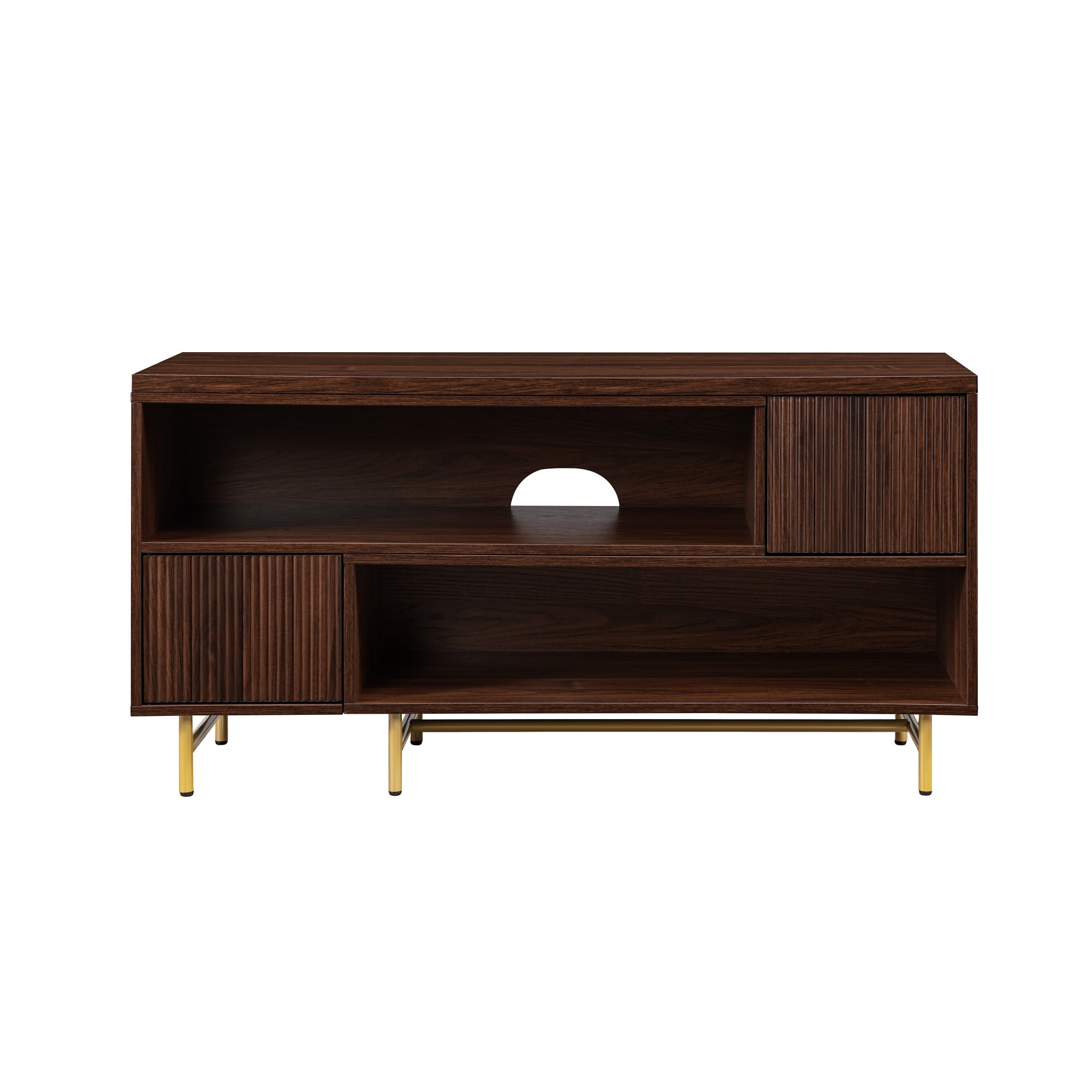 Mid-century modern style Dark walnut finish Extendable 47.25″ frame for a condensed size or elongated look at 67″ Featuring cord management ports for tidy tech Perfect for living rooms or entertainment spaces Versatile design that fits mid-century modern, modern, and contemporary aesthetics Made from warp-resistant MDF wood, durable laminate, and painted metal Ships ready-to-assemble with step-by-step instructions Assembled dimensions: 24” H x 47” L x 16” W Packaged dimensions: 8″ H x 52″ L x 19″ W