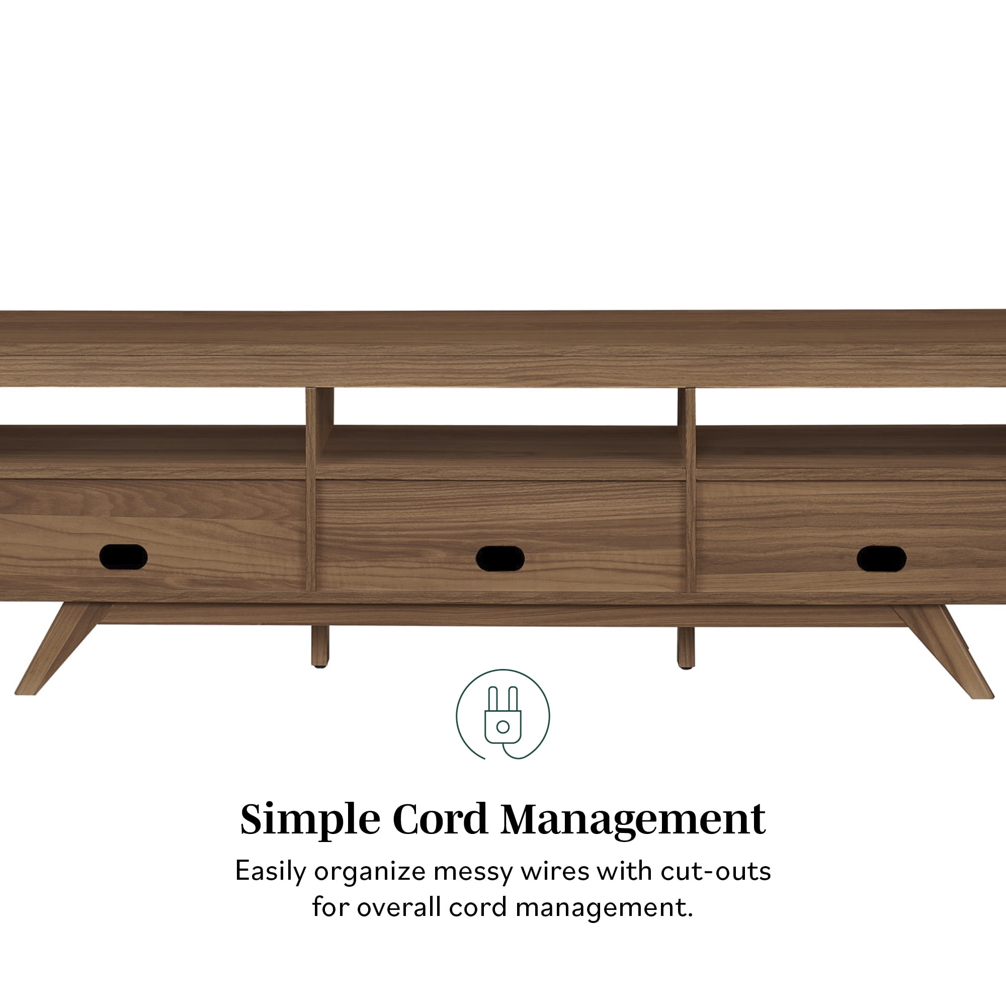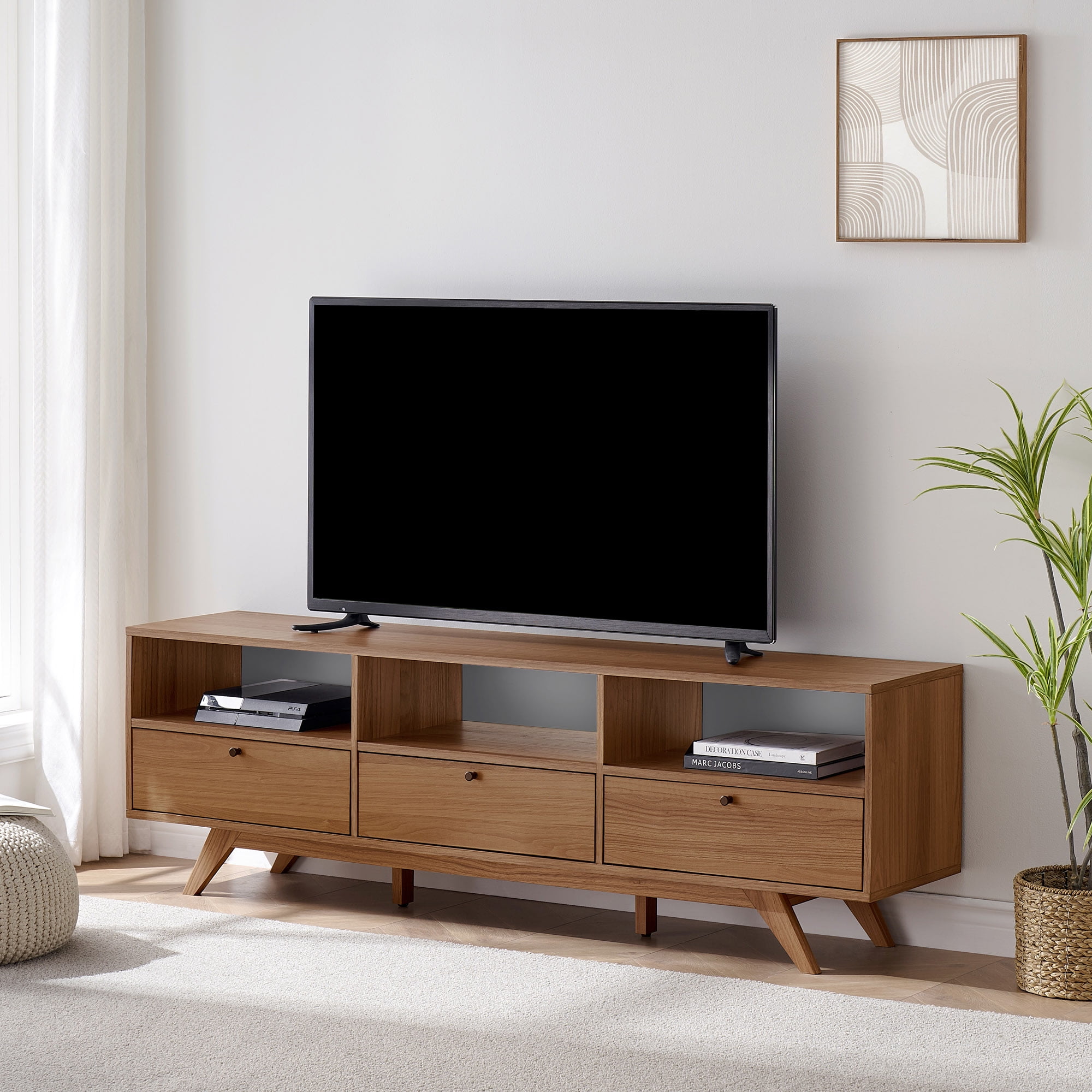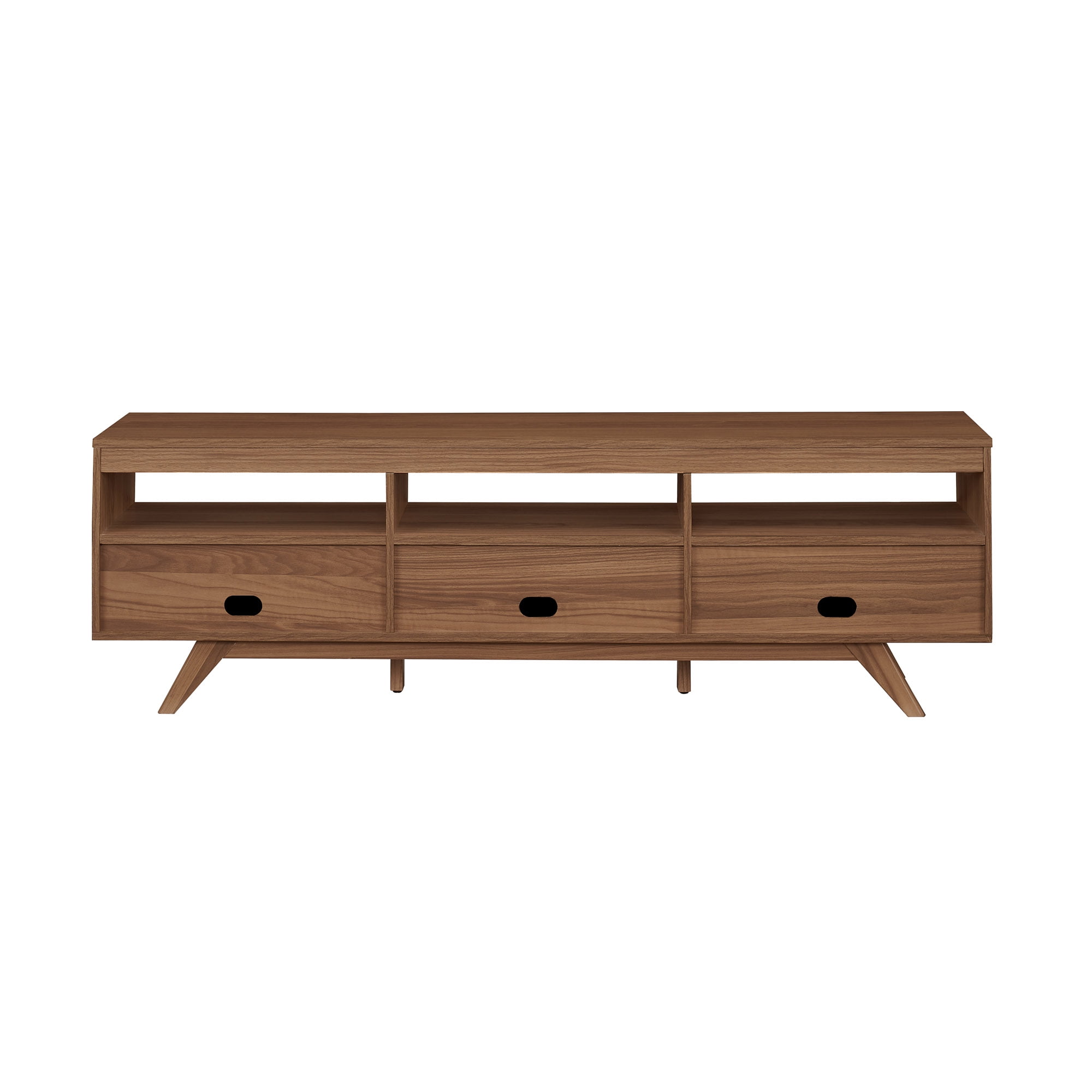 Upgrade your entertainment station with the Walker Edison Mid-Century Modern Open and Closed-Storage TV stand. Three open cubbies are the perfect perch for consoles and décor so you can personalize your display. This functional piece also offers three closed storage compartments behind hinged, fold-down doors so you can keep clutter at bay. The unique angled legs and symmetrical profile are the star of the show, so you can enjoy gaming or movie night in style. Or switch it up and use this versatile console as a sideboard or buffet.