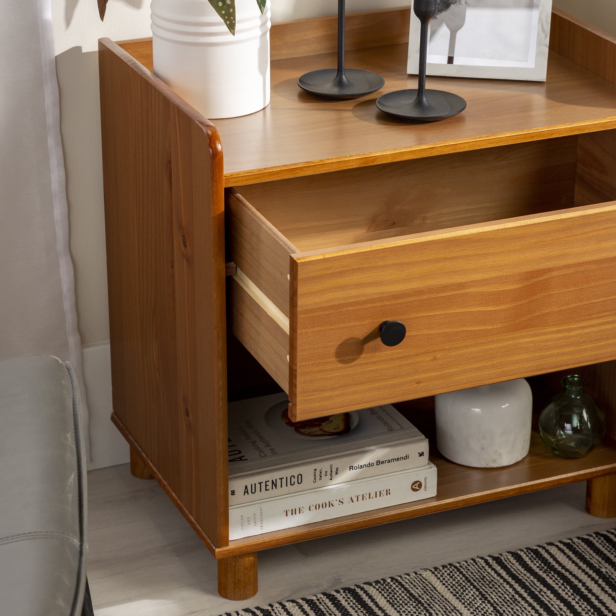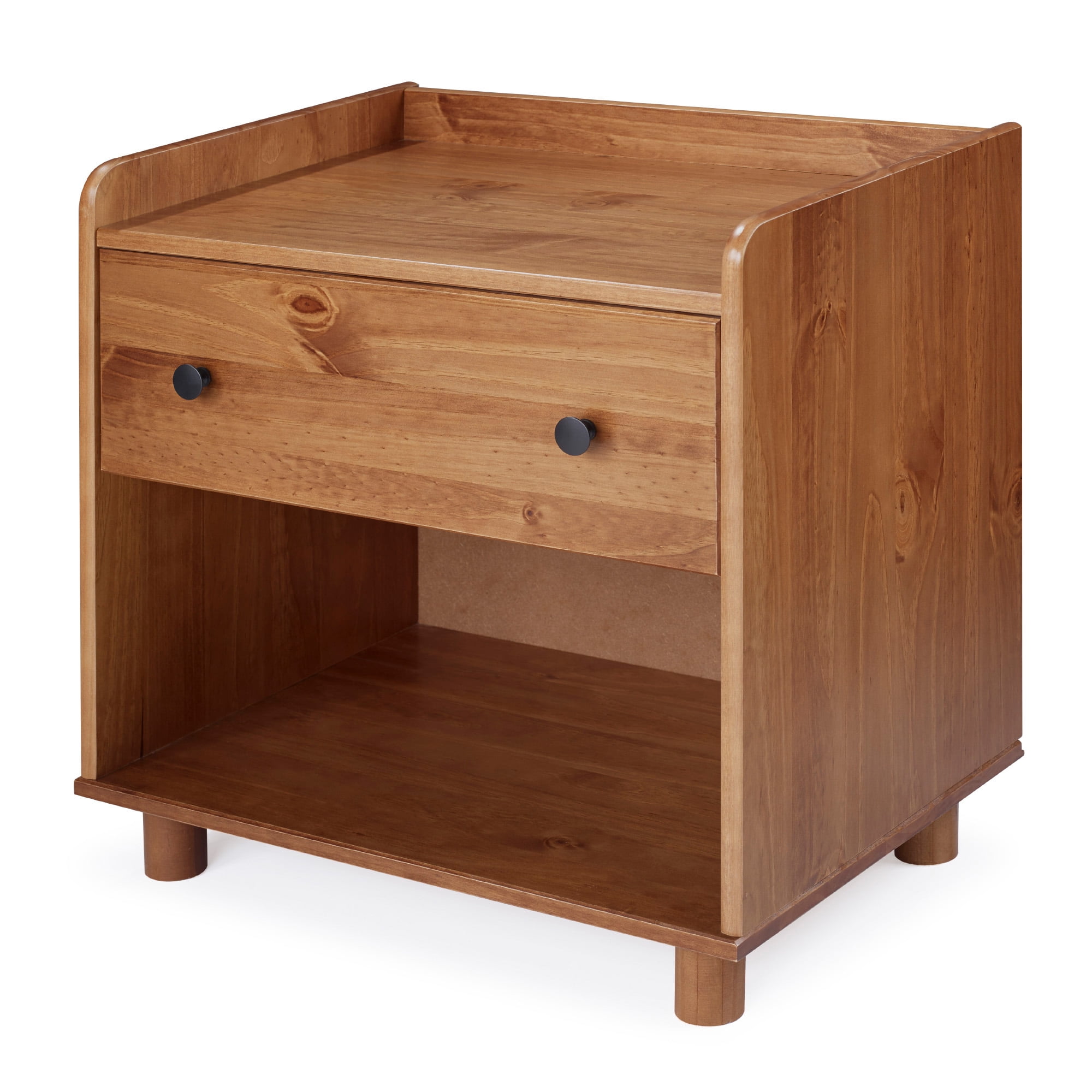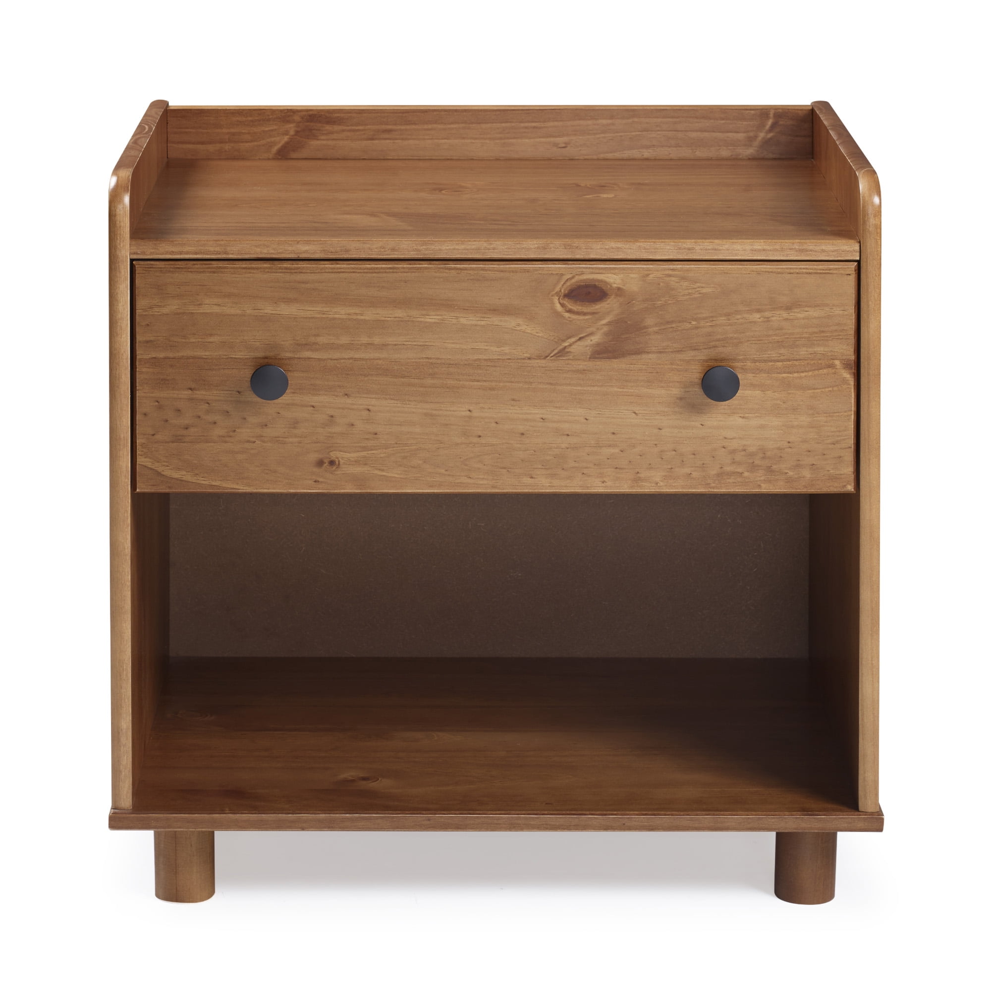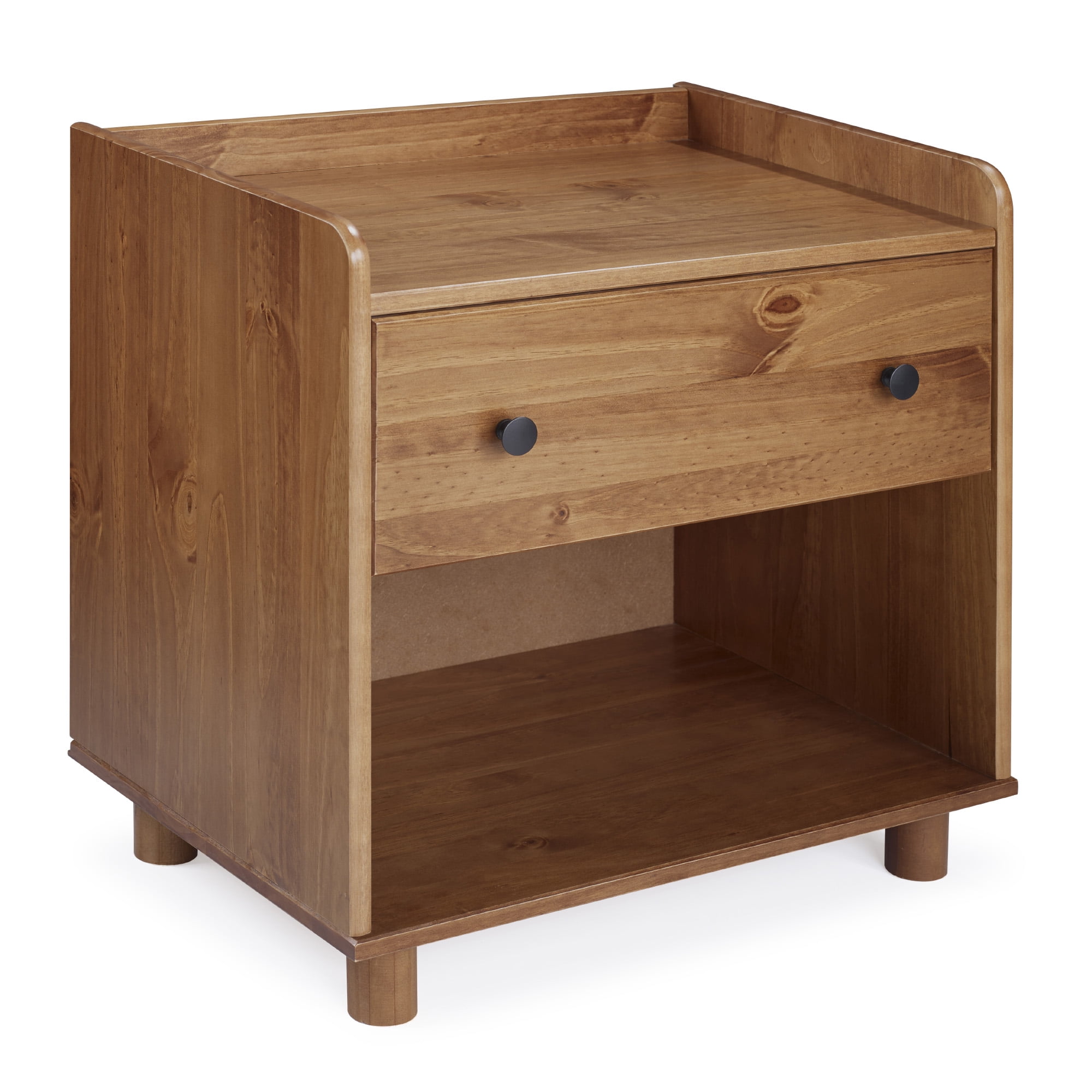 Mid century modern nightstand Caramel painted finish Smooth dovetail runners on the single drawer Tray top prevents spilling items Lower open storage cubby Solid pine wood construction for a long-lasting frame Pair with the matching four-drawer chest Great for a kid’s room Ships ready-to-assemble with step-by-step instructions Assembled Dimensions: 26” H x 24” L x 16” W Packaged Dimensions: 6” H x 27.5” L x 18” W
