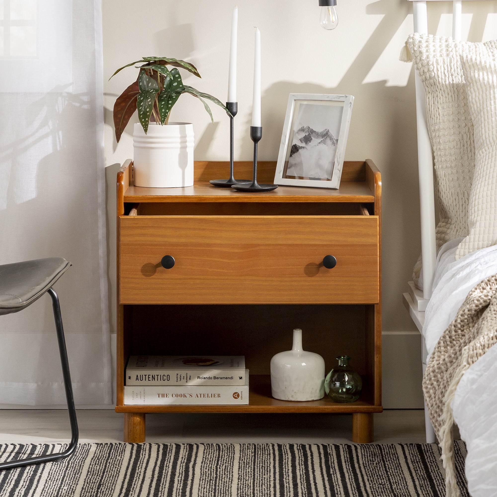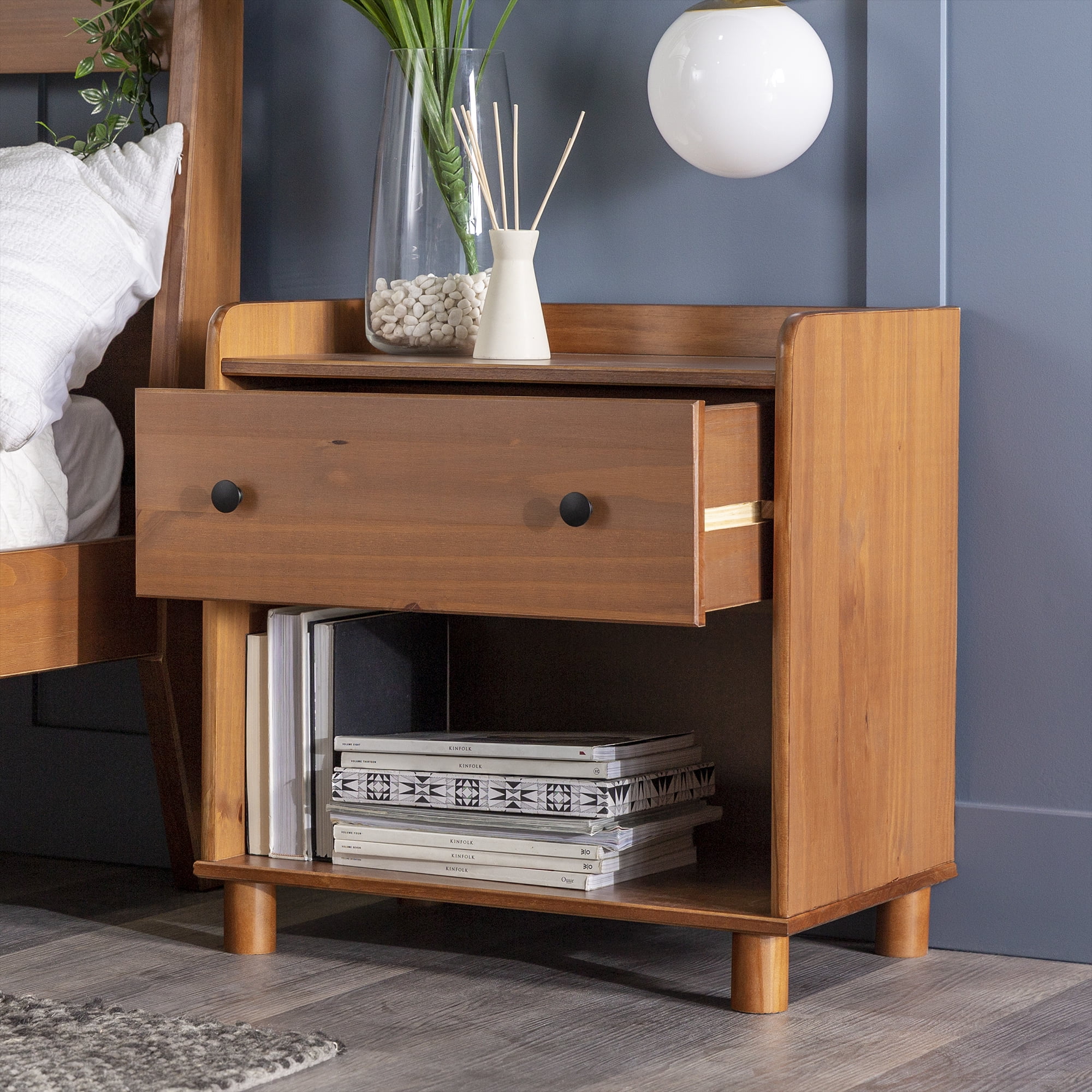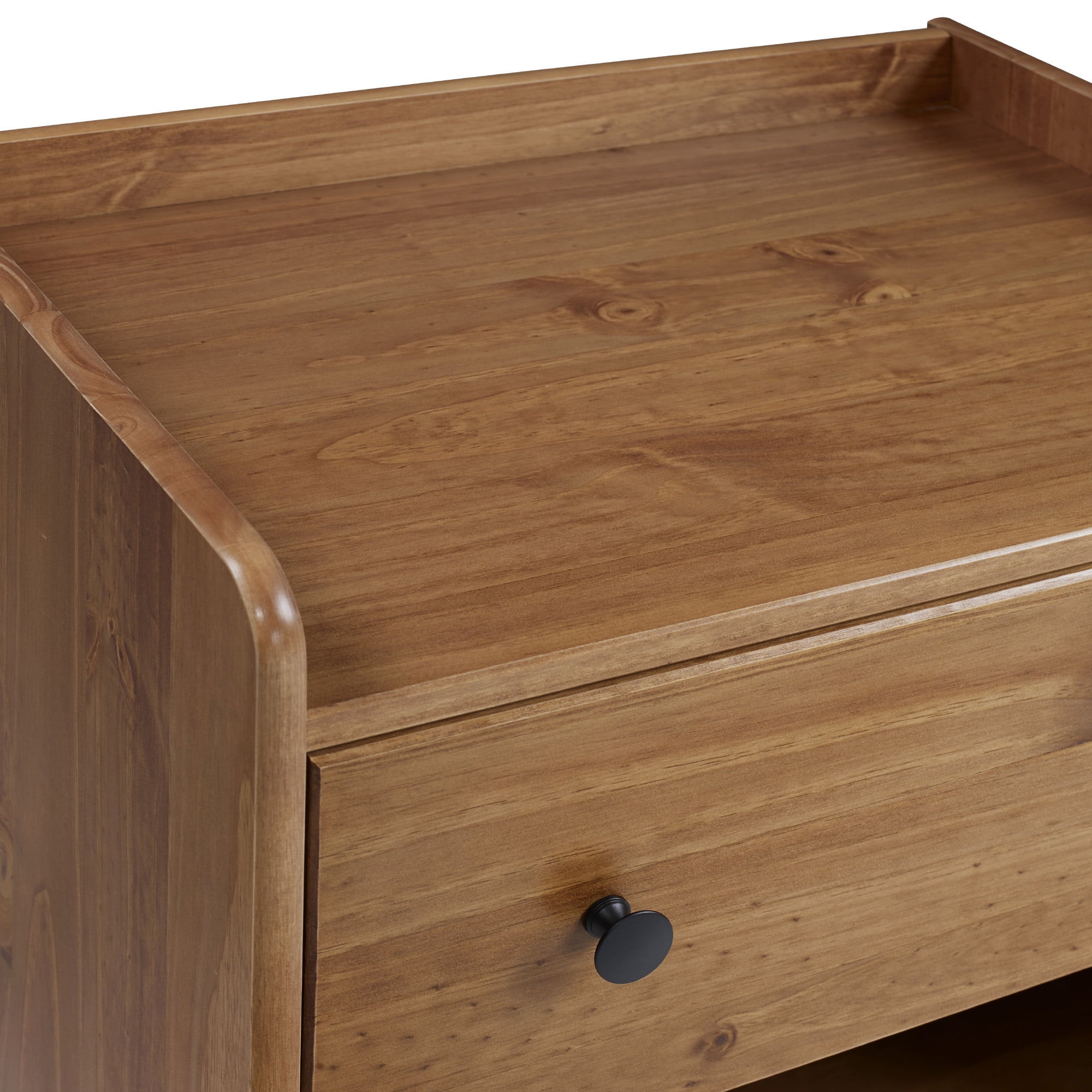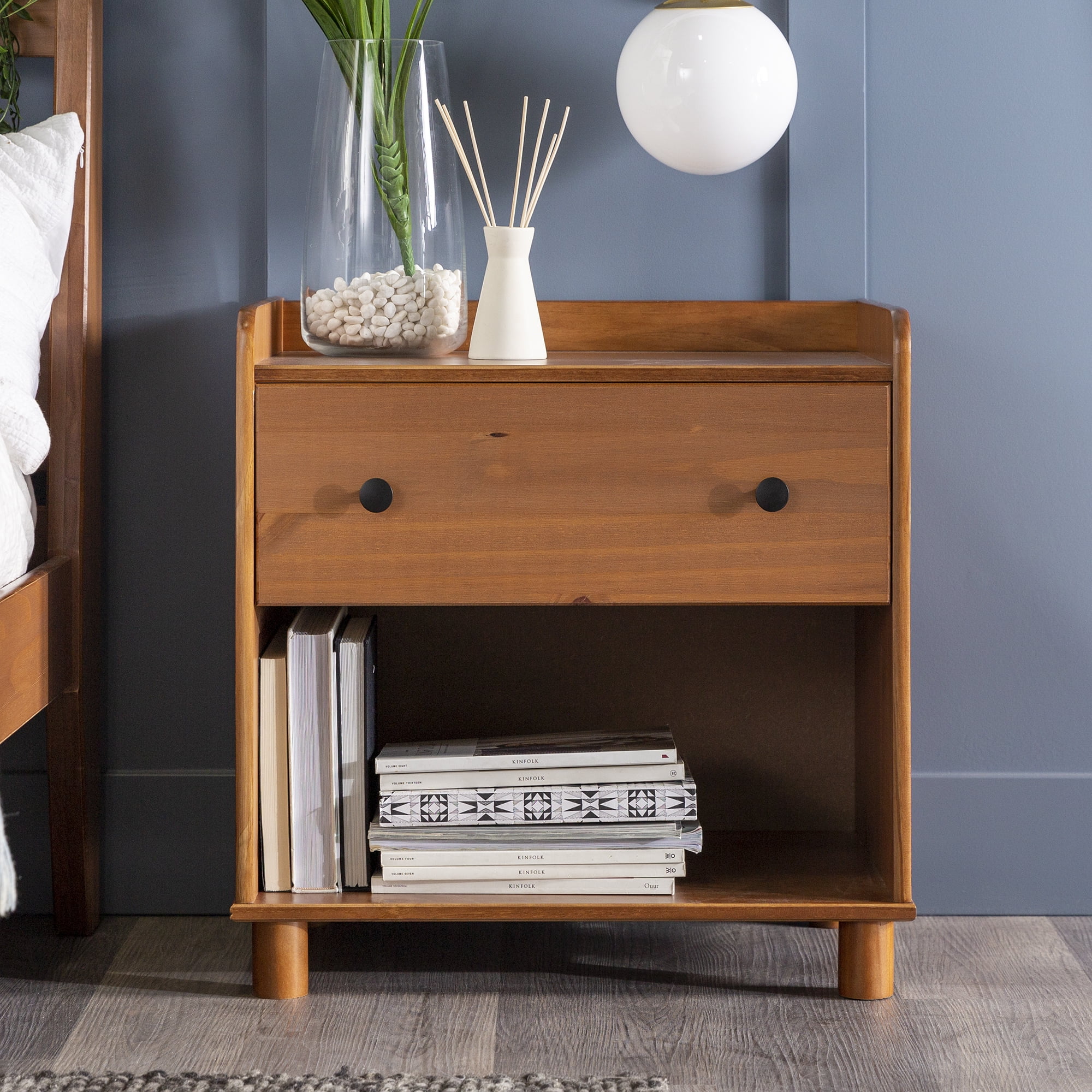 Mid century modern nightstand Caramel painted finish Smooth dovetail runners on the single drawer Tray top prevents spilling items Lower open storage cubby Solid pine wood construction for a long-lasting frame Pair with the matching four-drawer chest Great for a kid’s room Ships ready-to-assemble with step-by-step instructions Assembled Dimensions: 26” H x 24” L x 16” W Packaged Dimensions: 6” H x 27.5” L x 18” W