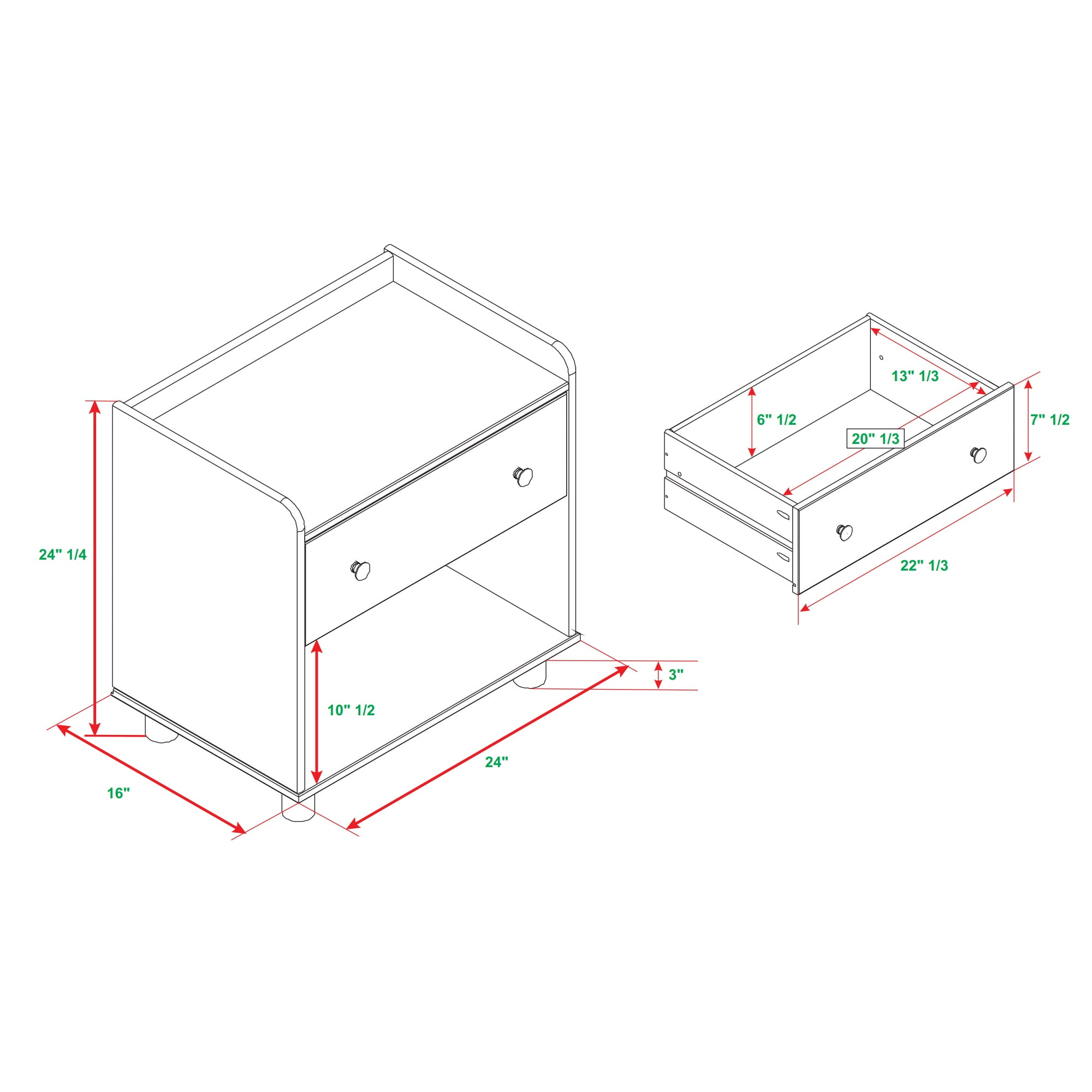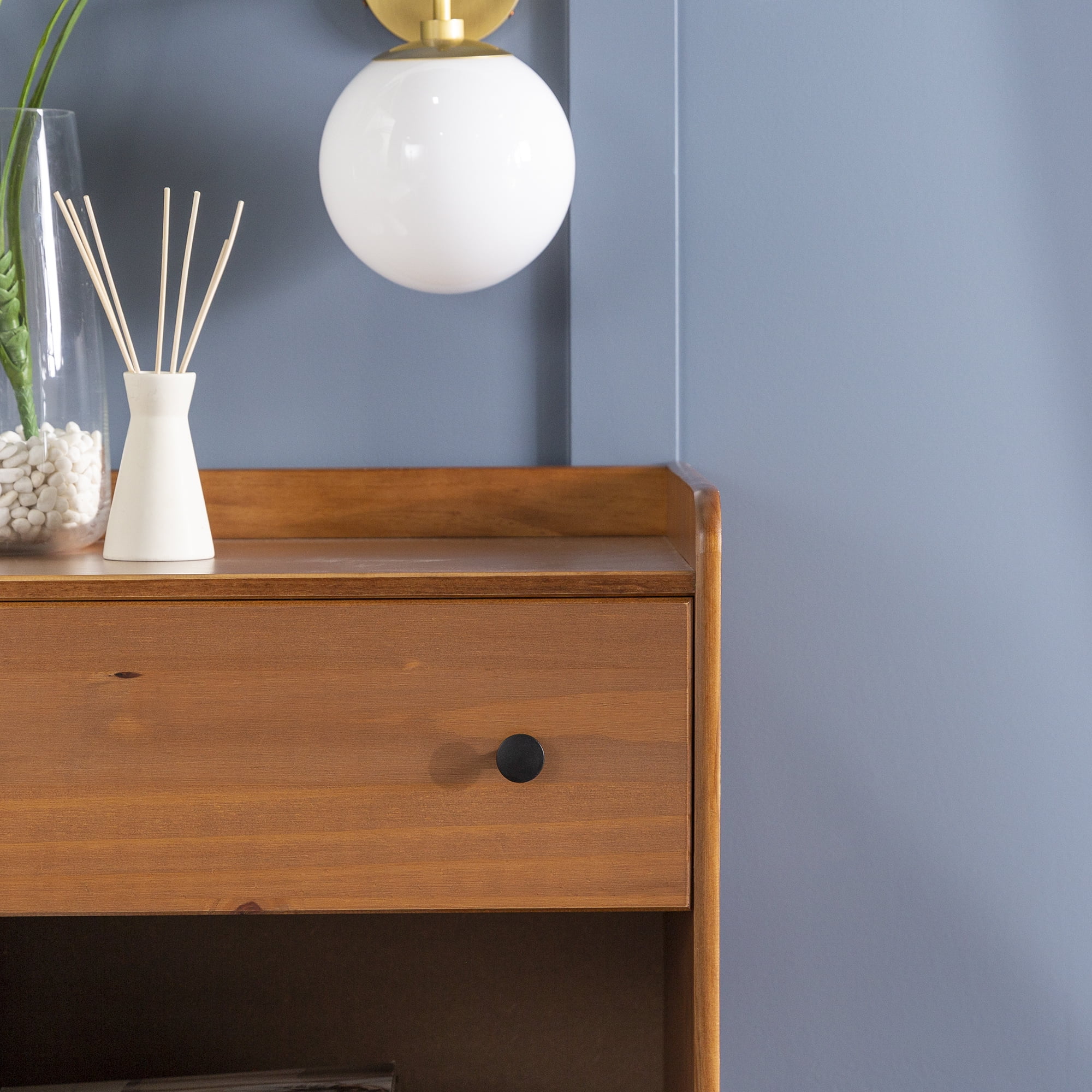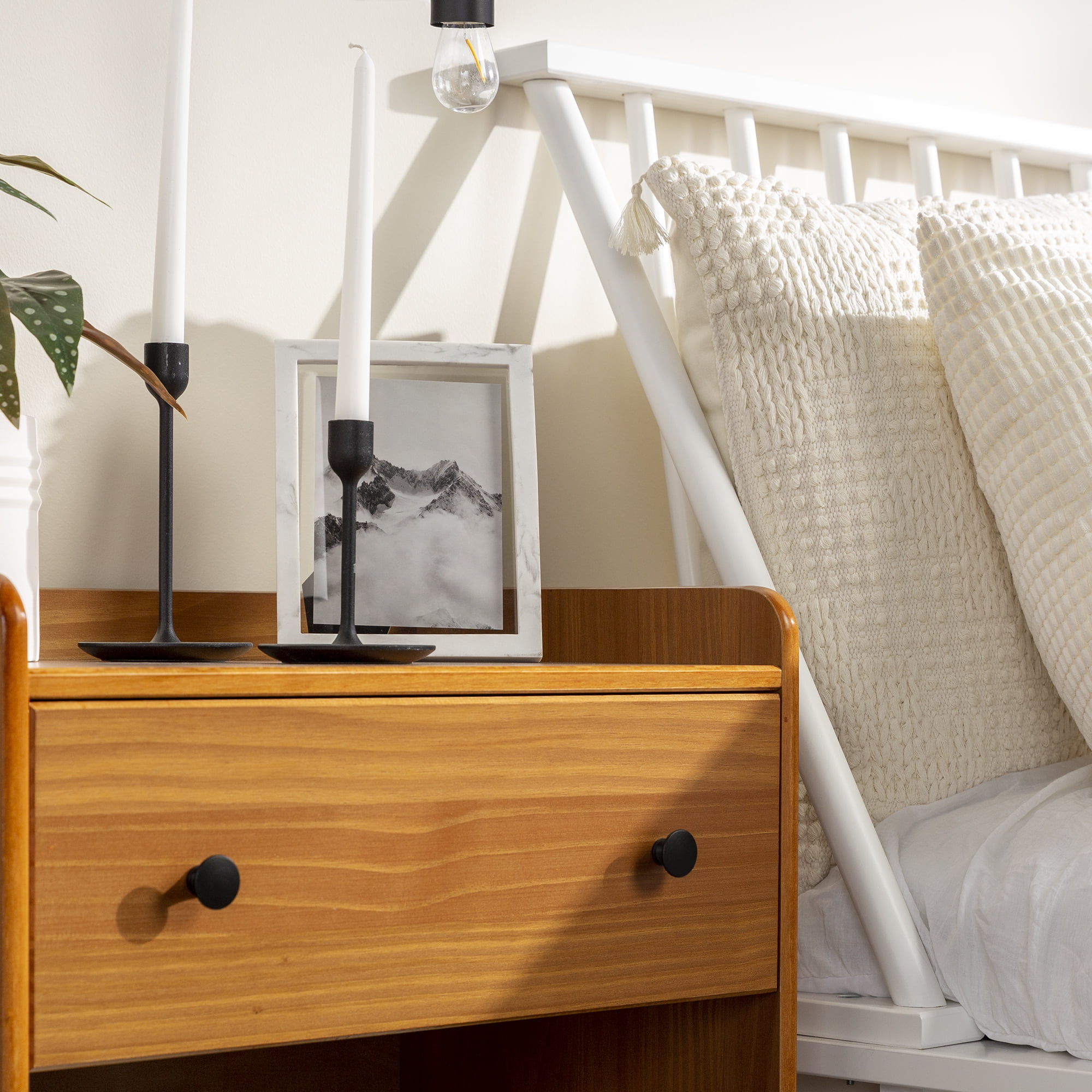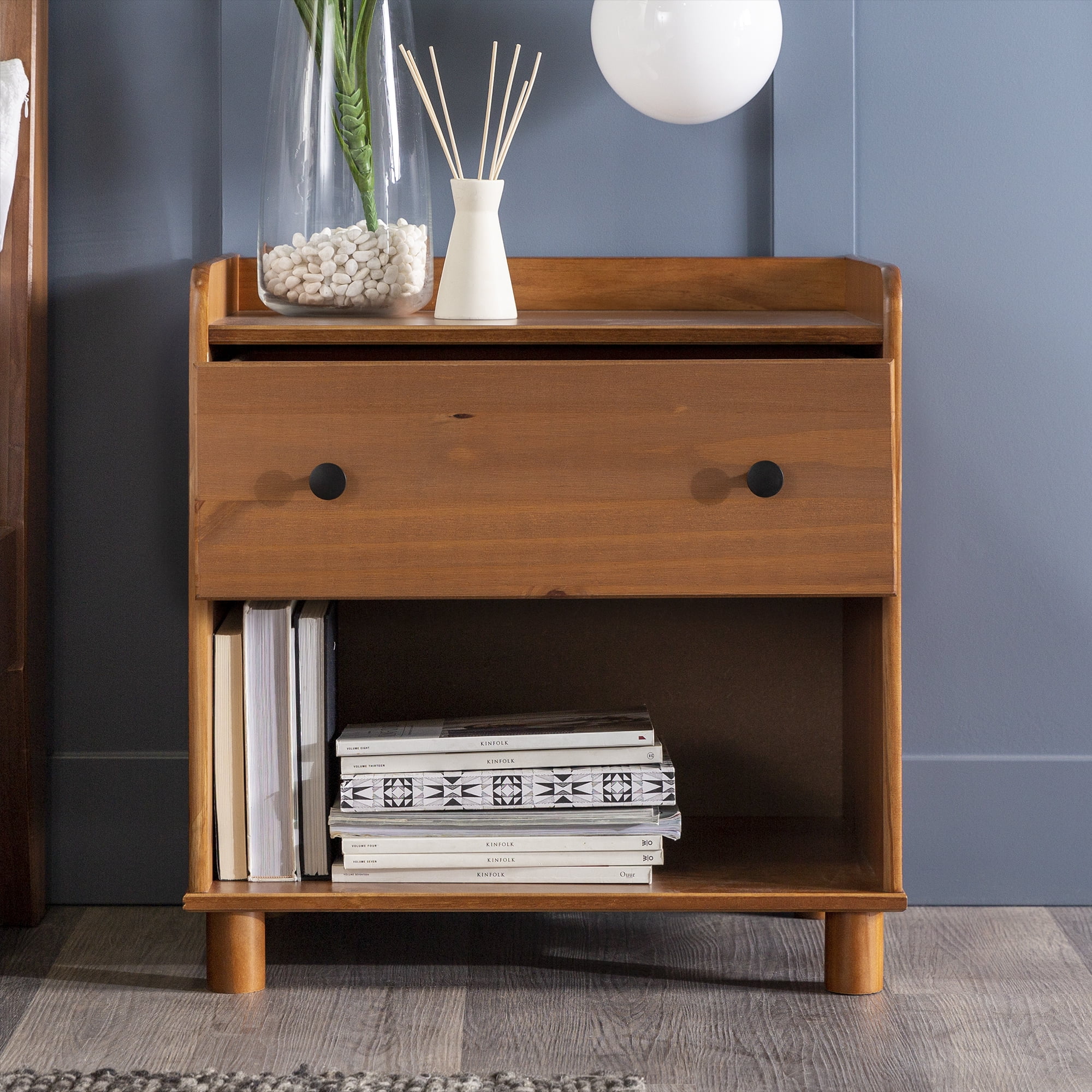 Mid century modern nightstand Caramel painted finish Smooth dovetail runners on the single drawer Tray top prevents spilling items Lower open storage cubby Solid pine wood construction for a long-lasting frame Pair with the matching four-drawer chest Great for a kid’s room Ships ready-to-assemble with step-by-step instructions Assembled Dimensions: 26” H x 24” L x 16” W Packaged Dimensions: 6” H x 27.5” L x 18” W