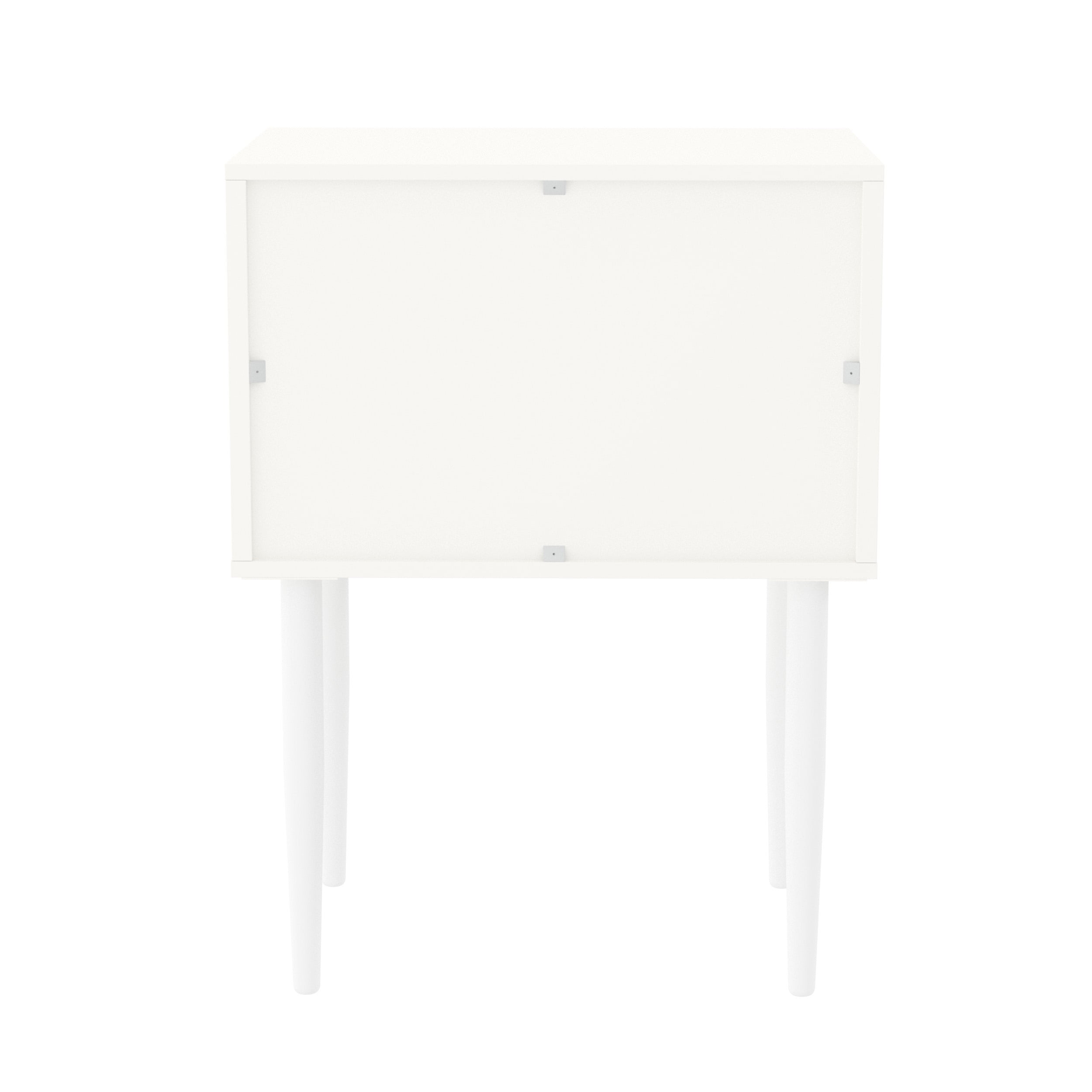 Packaged dimensions: 7″ H x 33″ L x 19″ W Assembled Dimensions: 26″ H x 20″ L x 15″ W Materials: High-grade MDF, durable laminate, and painted metal Assembly: Some assembly required White finish Mid-century modern side table Tapered legs and sleek handles 2 closed storage drawers