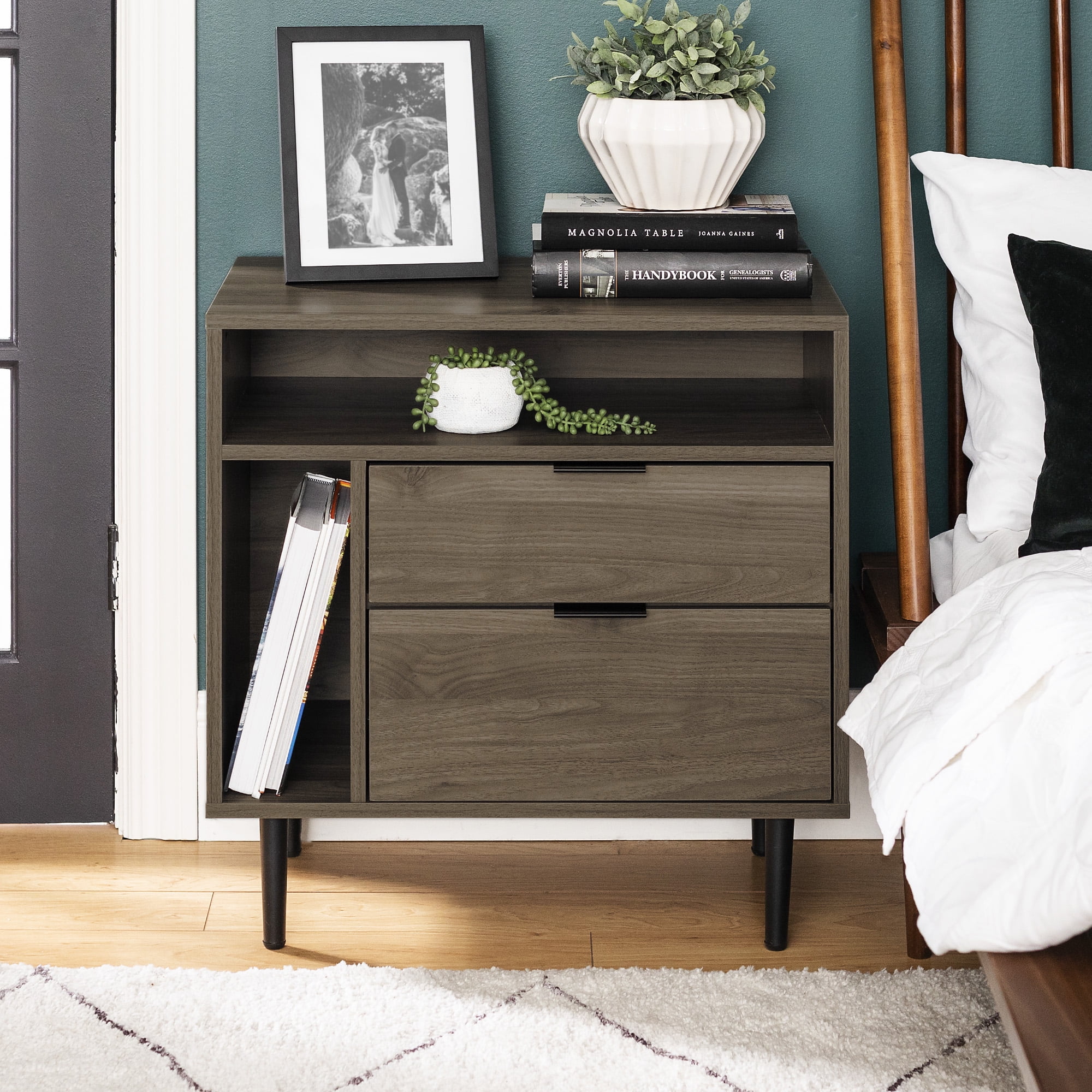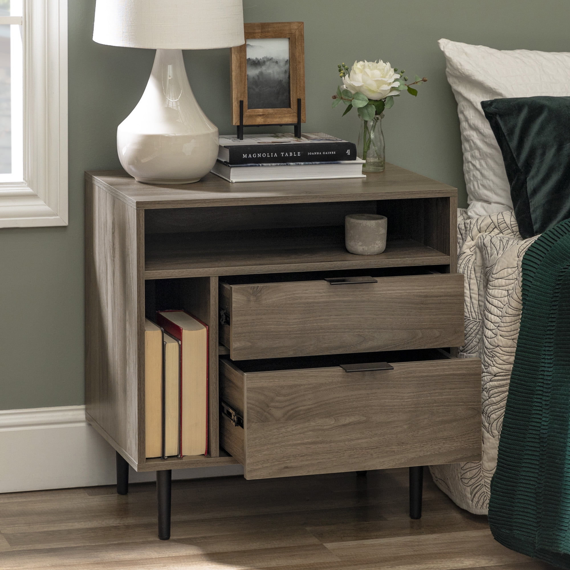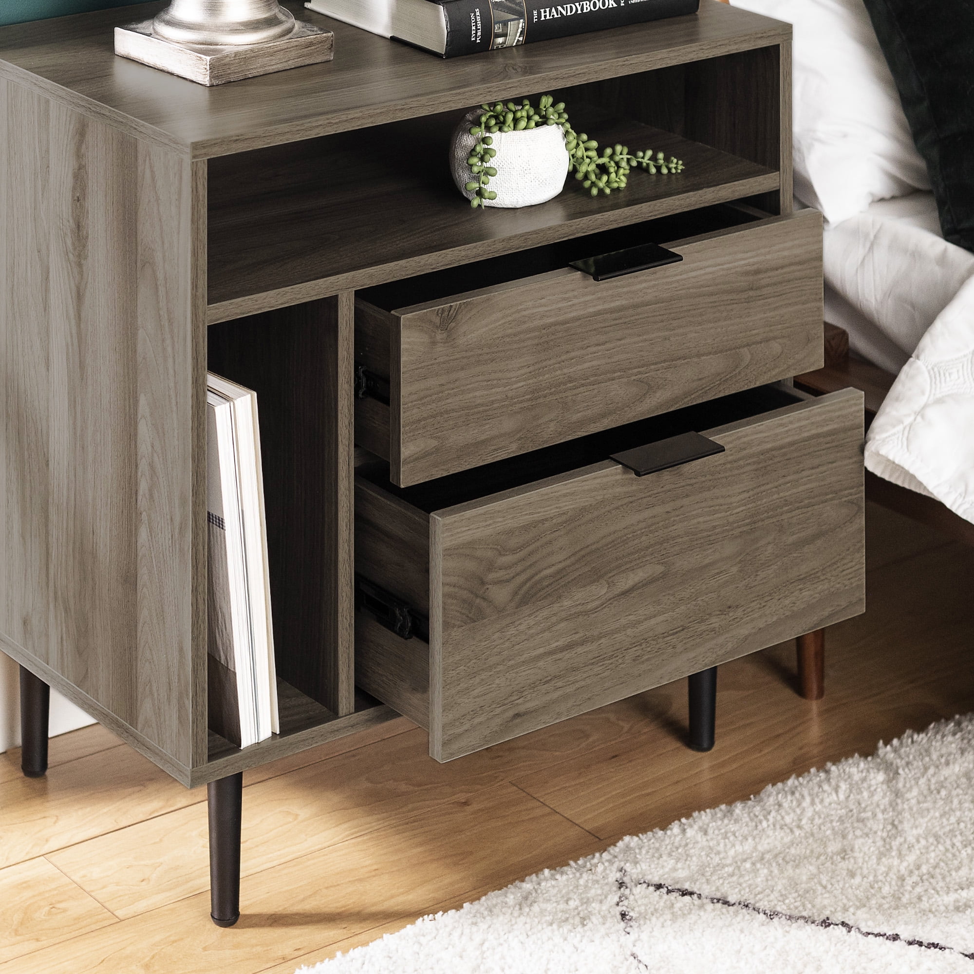 Includes 2 Mid-century modern nightstands 2 drawers on telescoping metal glides on each piece Tall open side shelf for books Adjustable rubber feet to protect flooring Top open shelf for easy access to essentials Keep cables tidy with cord management ports Made with warp-resistant MDF wood, durable laminate, and powder-coated steel Ships ready-to-assemble with step-by-step instructions