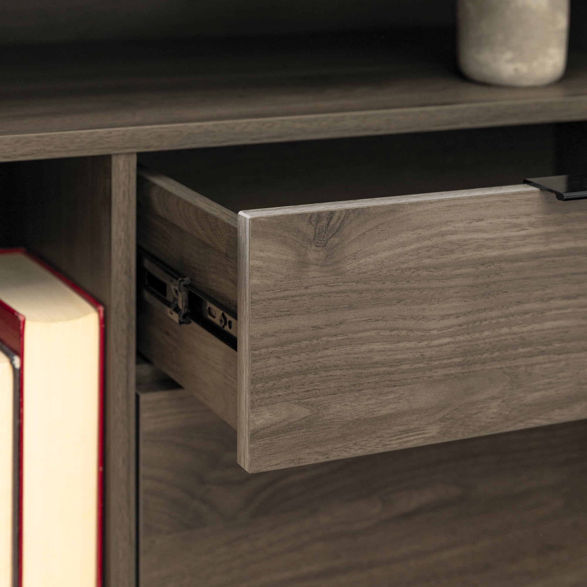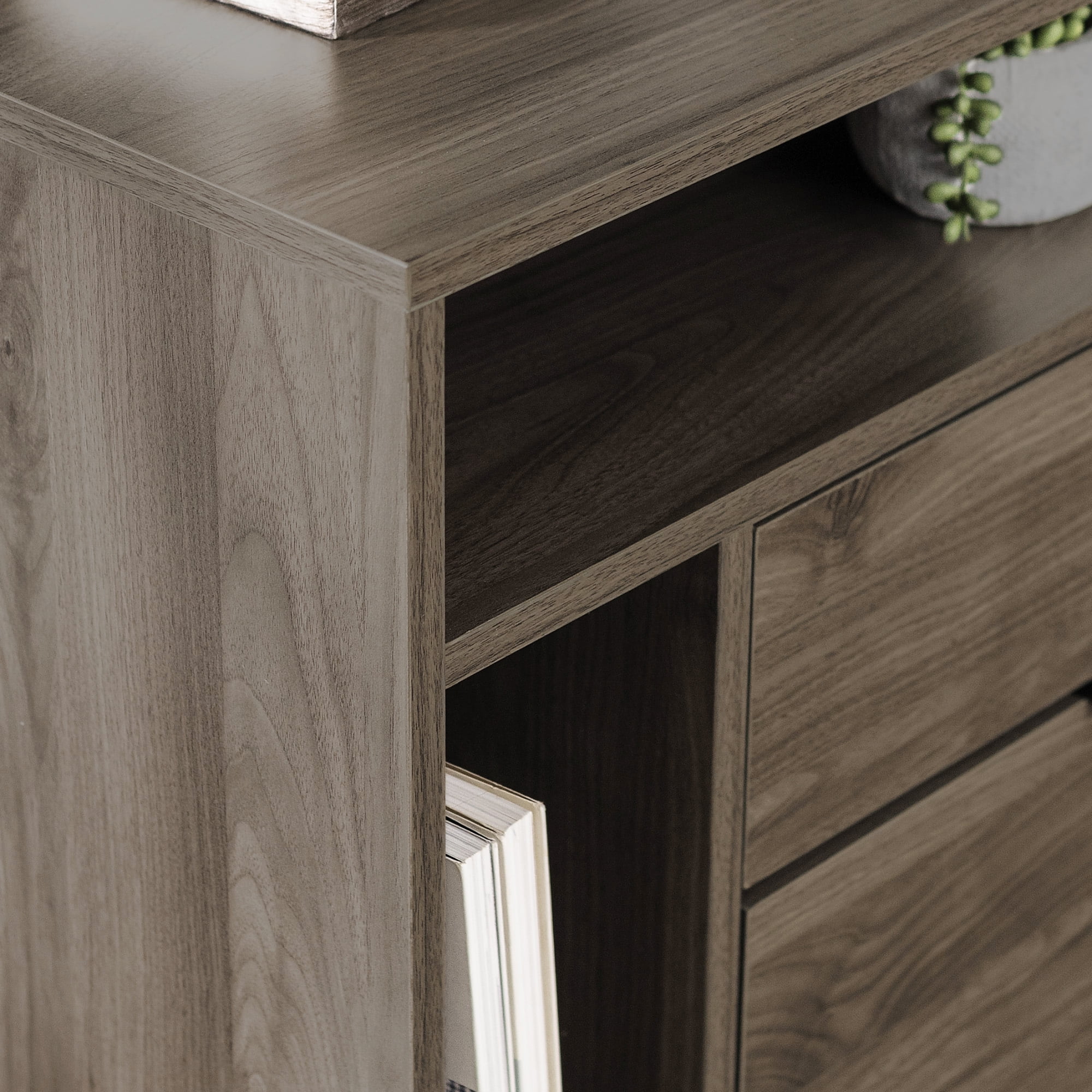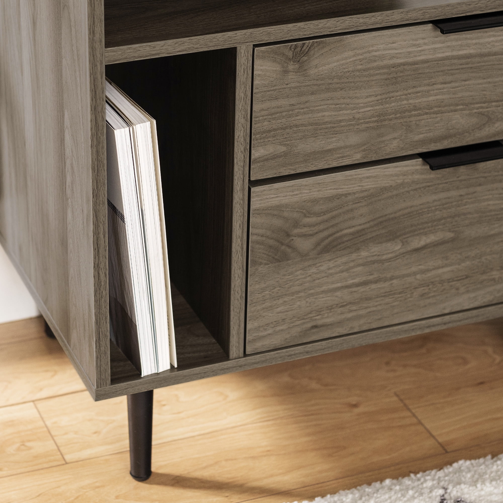 Includes 2 Mid-century modern nightstands 2 drawers on telescoping metal glides on each piece Tall open side shelf for books Adjustable rubber feet to protect flooring Top open shelf for easy access to essentials Keep cables tidy with cord management ports Made with warp-resistant MDF wood, durable laminate, and powder-coated steel Ships ready-to-assemble with step-by-step instructions