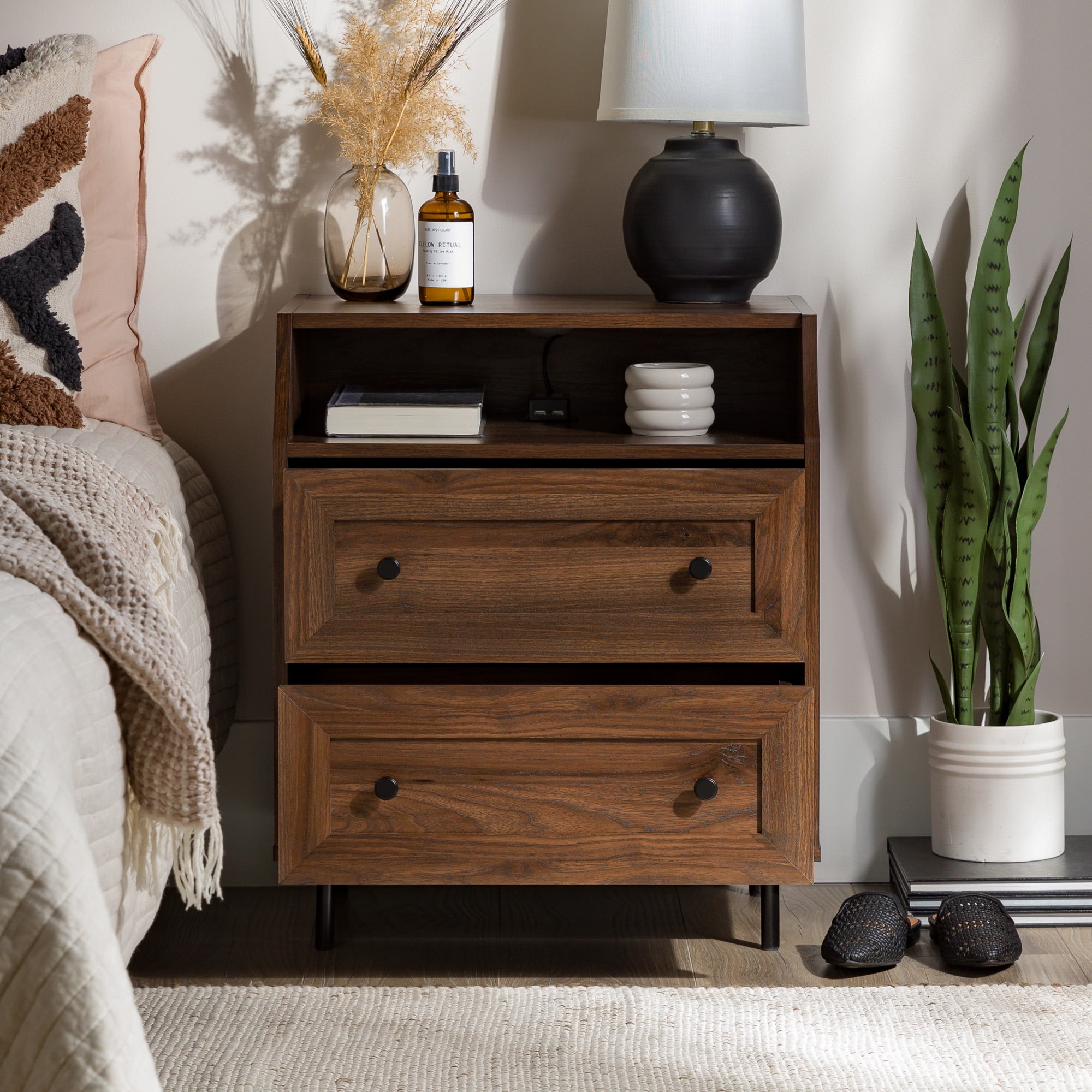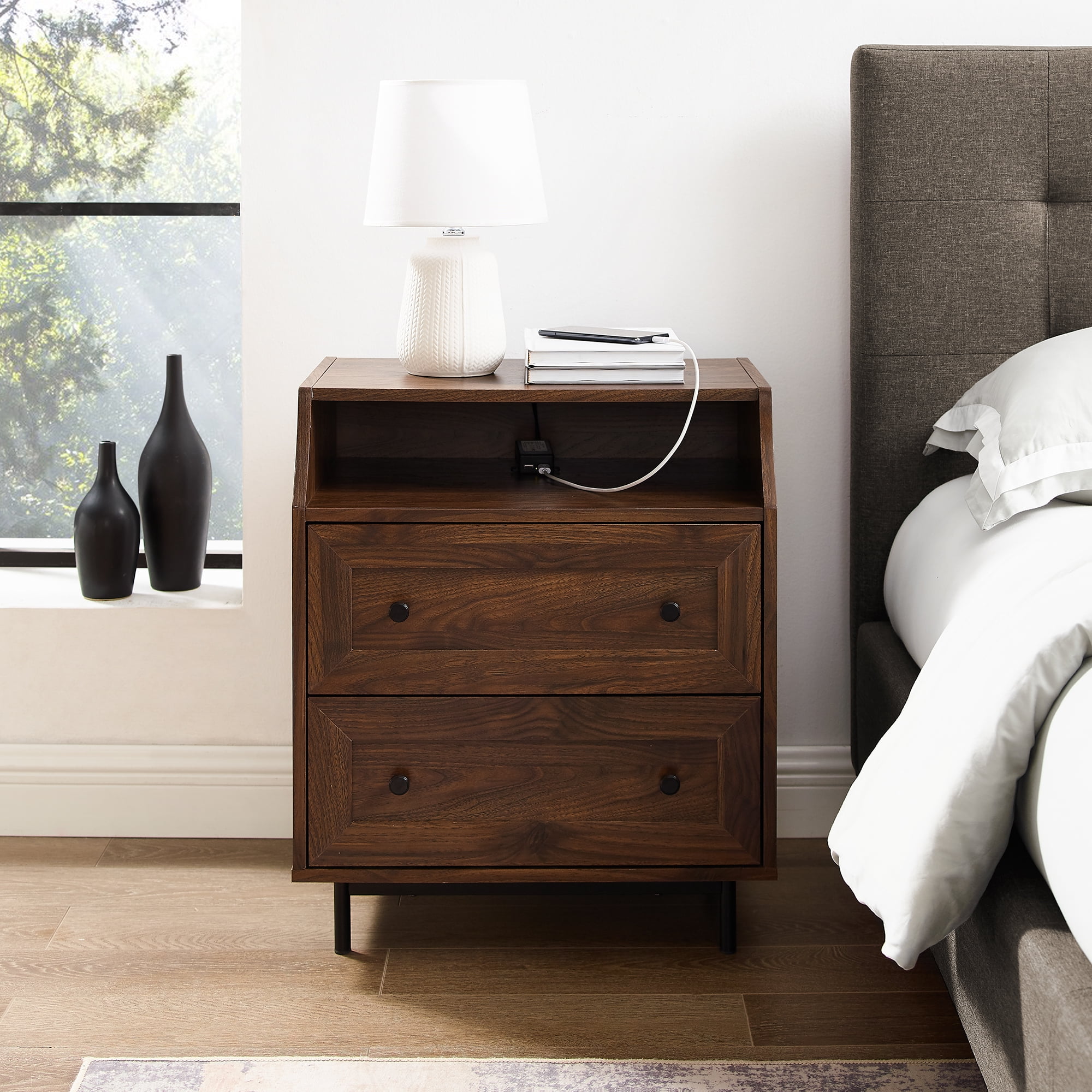 Walker Edison Modern 2 Drawer Nightstand with USB Port, Dark Walnut